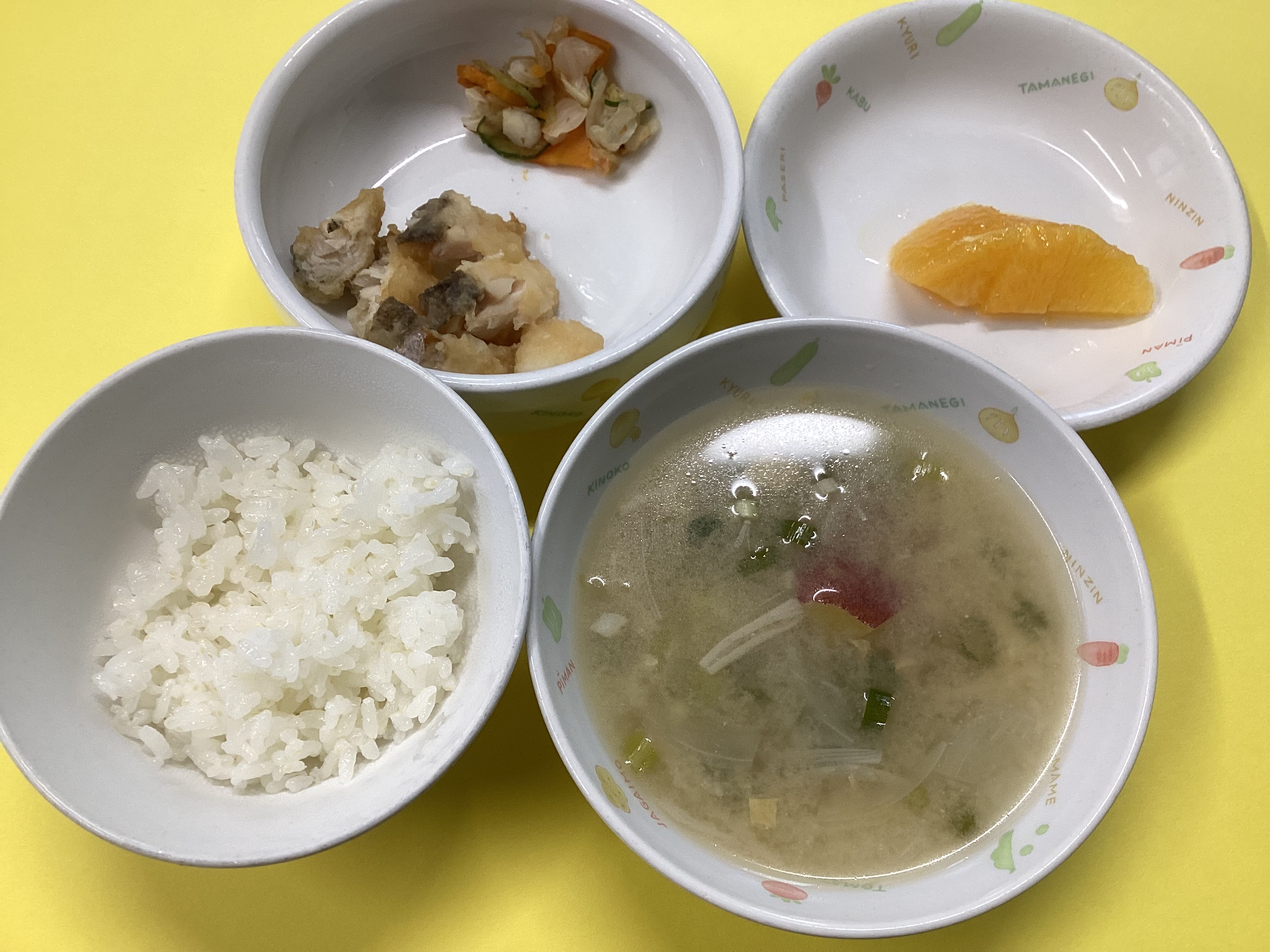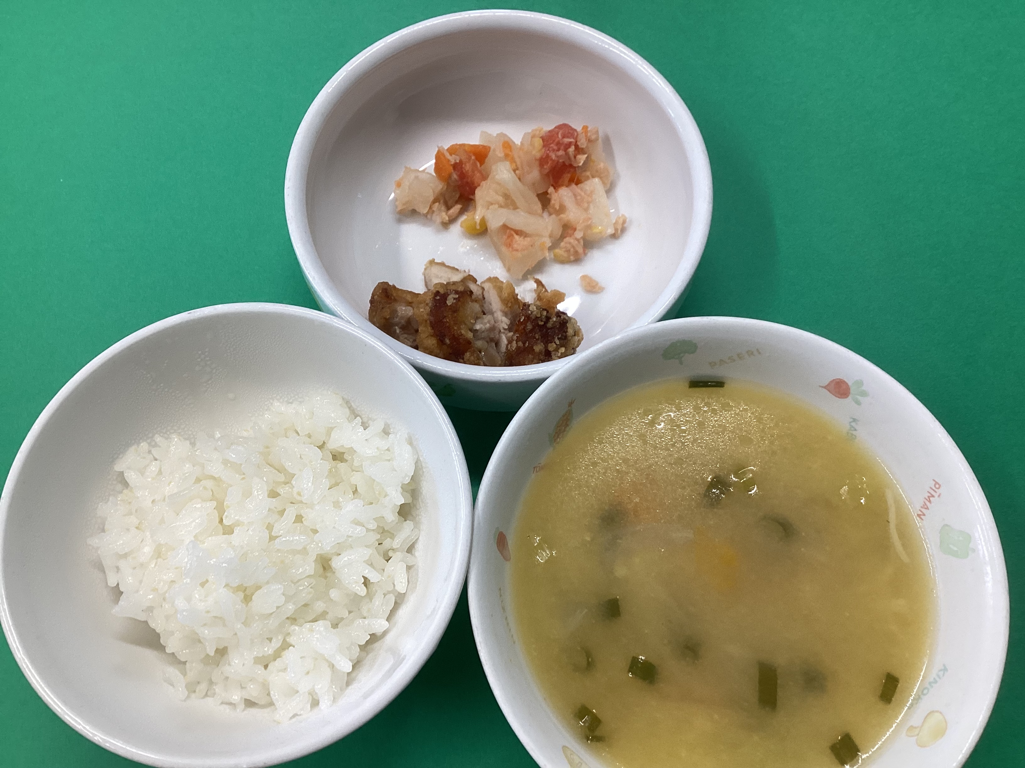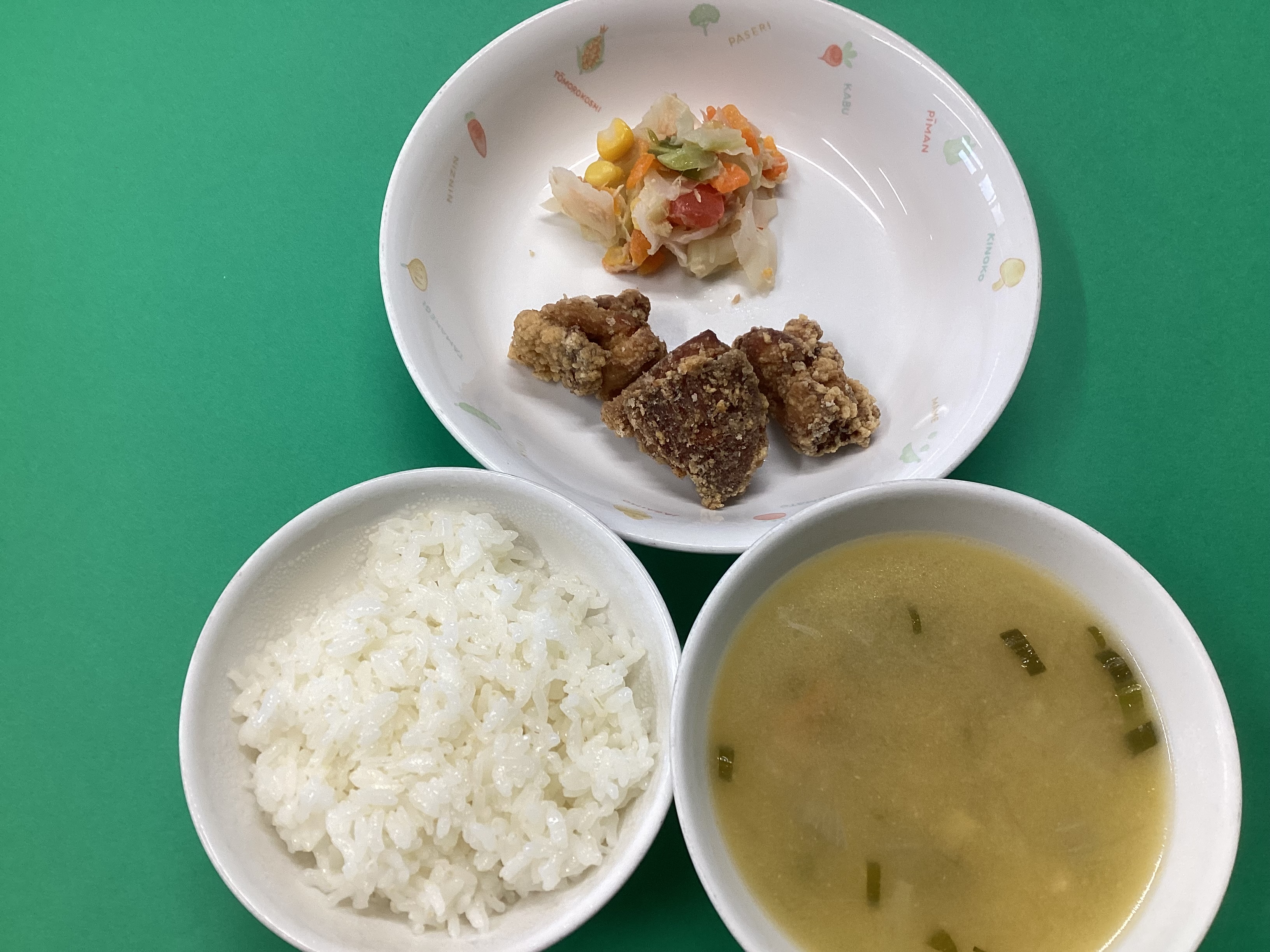 令和7年9月5日のお給食♪ 2025年 9月 5日 Fri 管理者 ・ご飯 ・鶏のから揚げ ・カラフルサラダ ・味噌汁 ・キウイフルーツ(未満児はりんご) ※果物はおやつの時間に提供しました (幼児) (未満児)