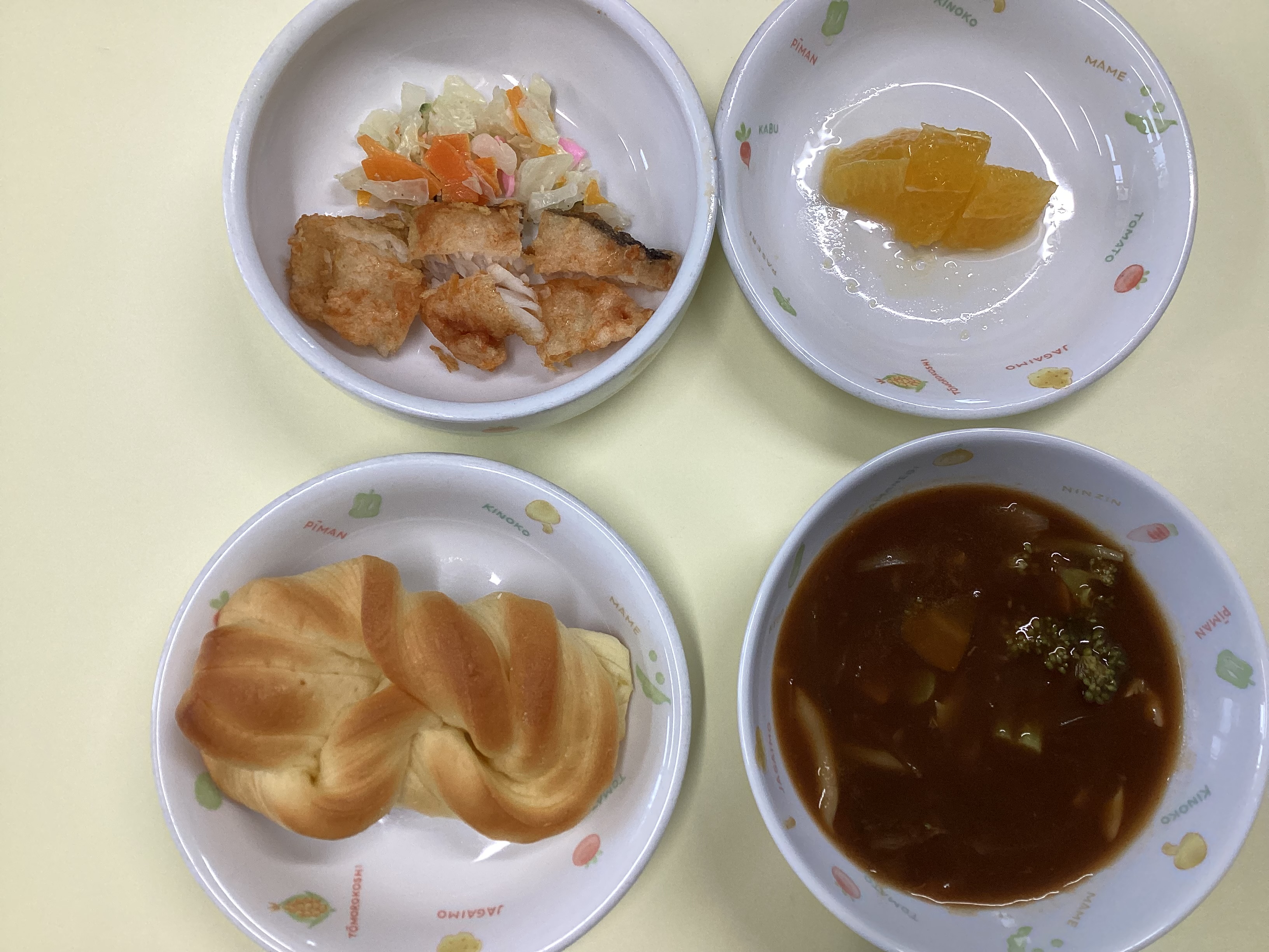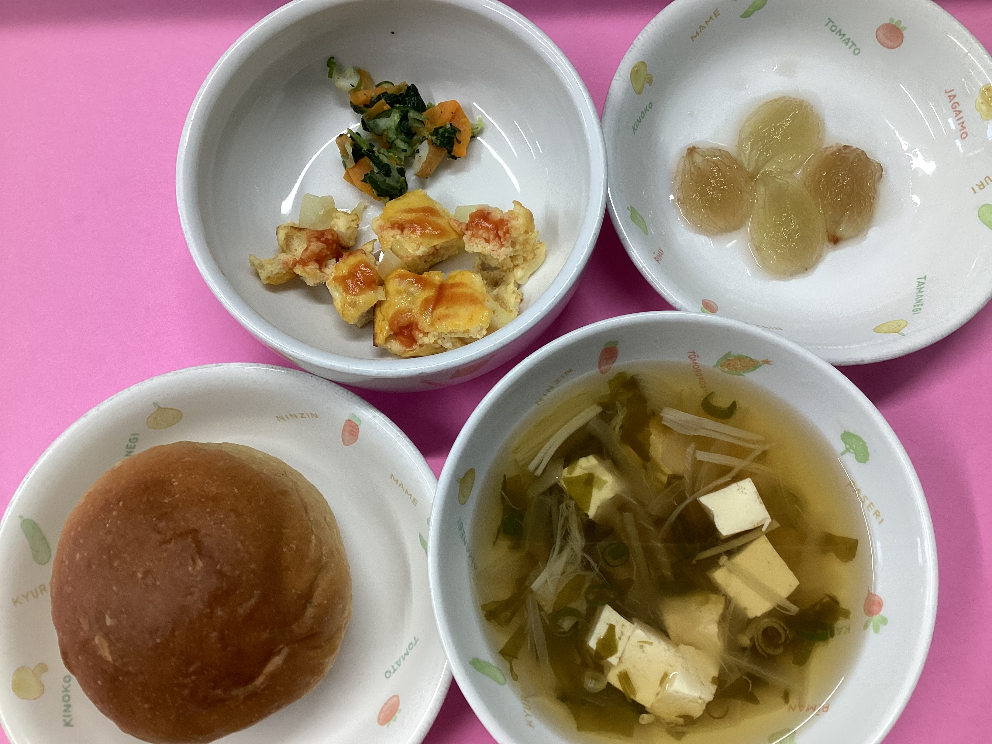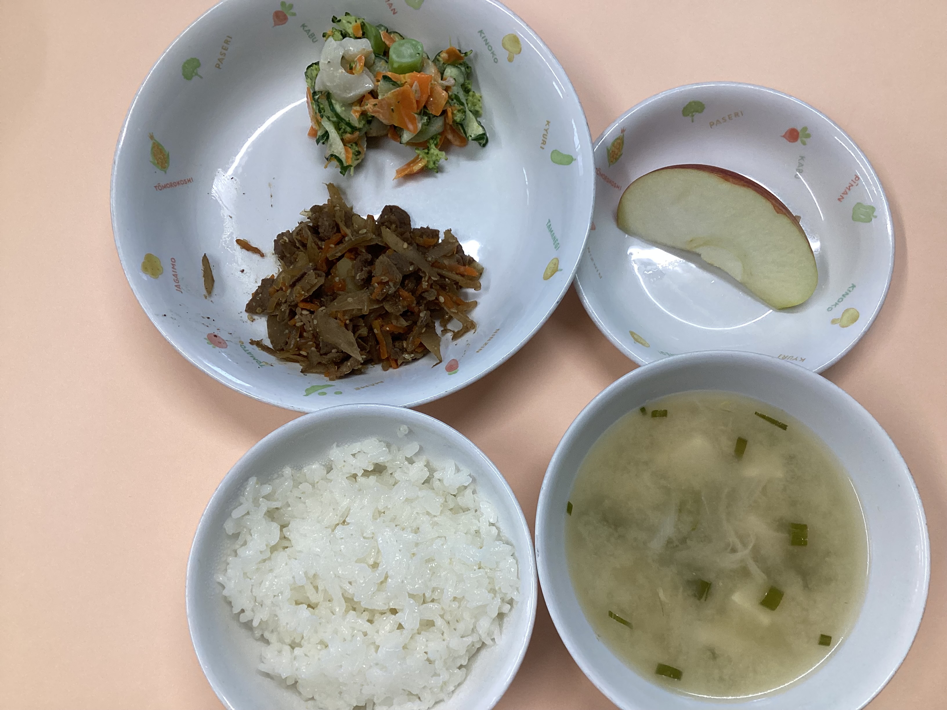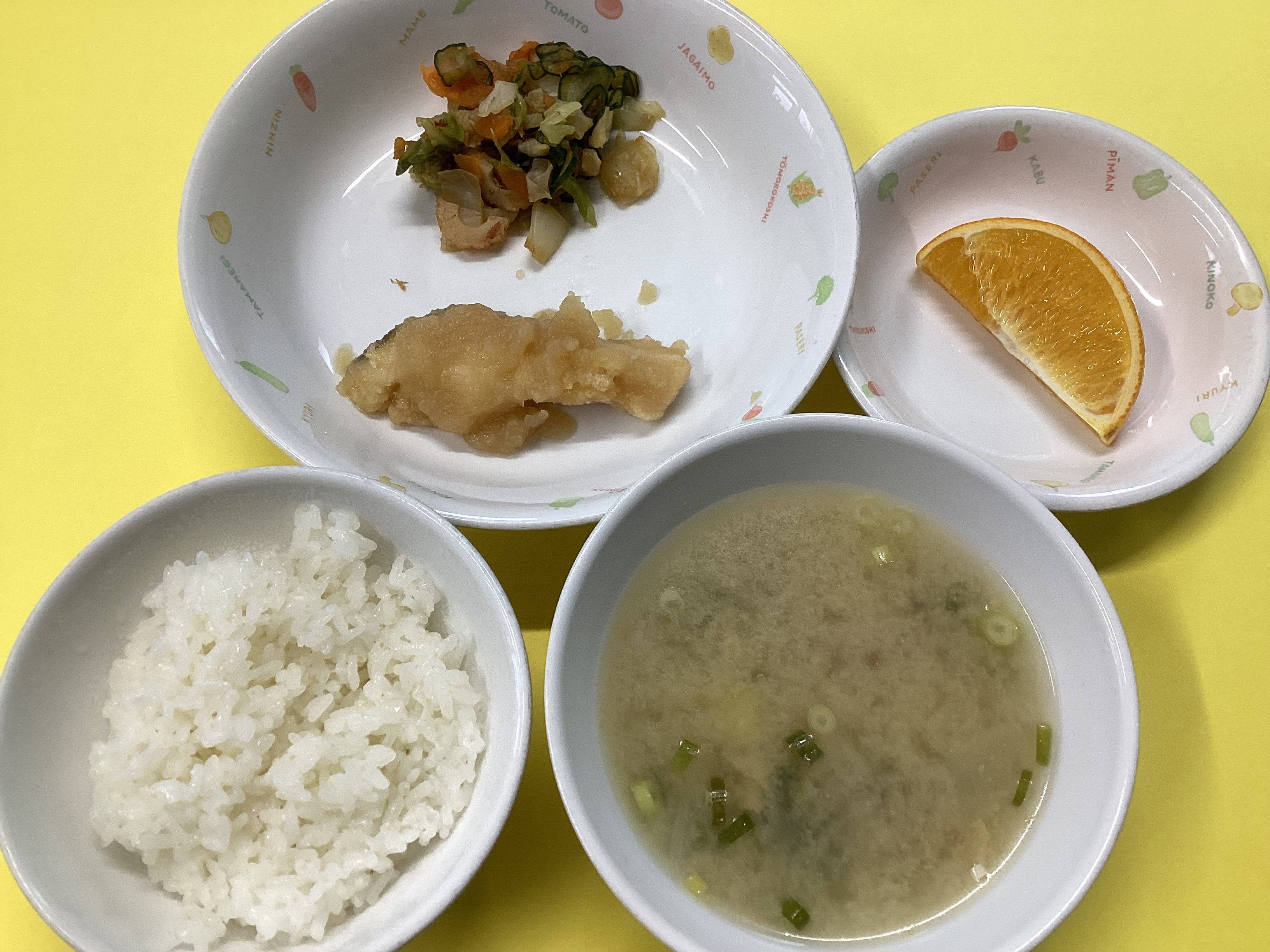 令和7年9月5日のお給食♪ 2025年 9月 5日 Fri 管理者 ・ご飯 ・鶏のから揚げ ・カラフルサラダ ・味噌汁 ・キウイフルーツ(未満児はりんご) ※果物はおやつの時間に提供しました (幼児) (未満児)