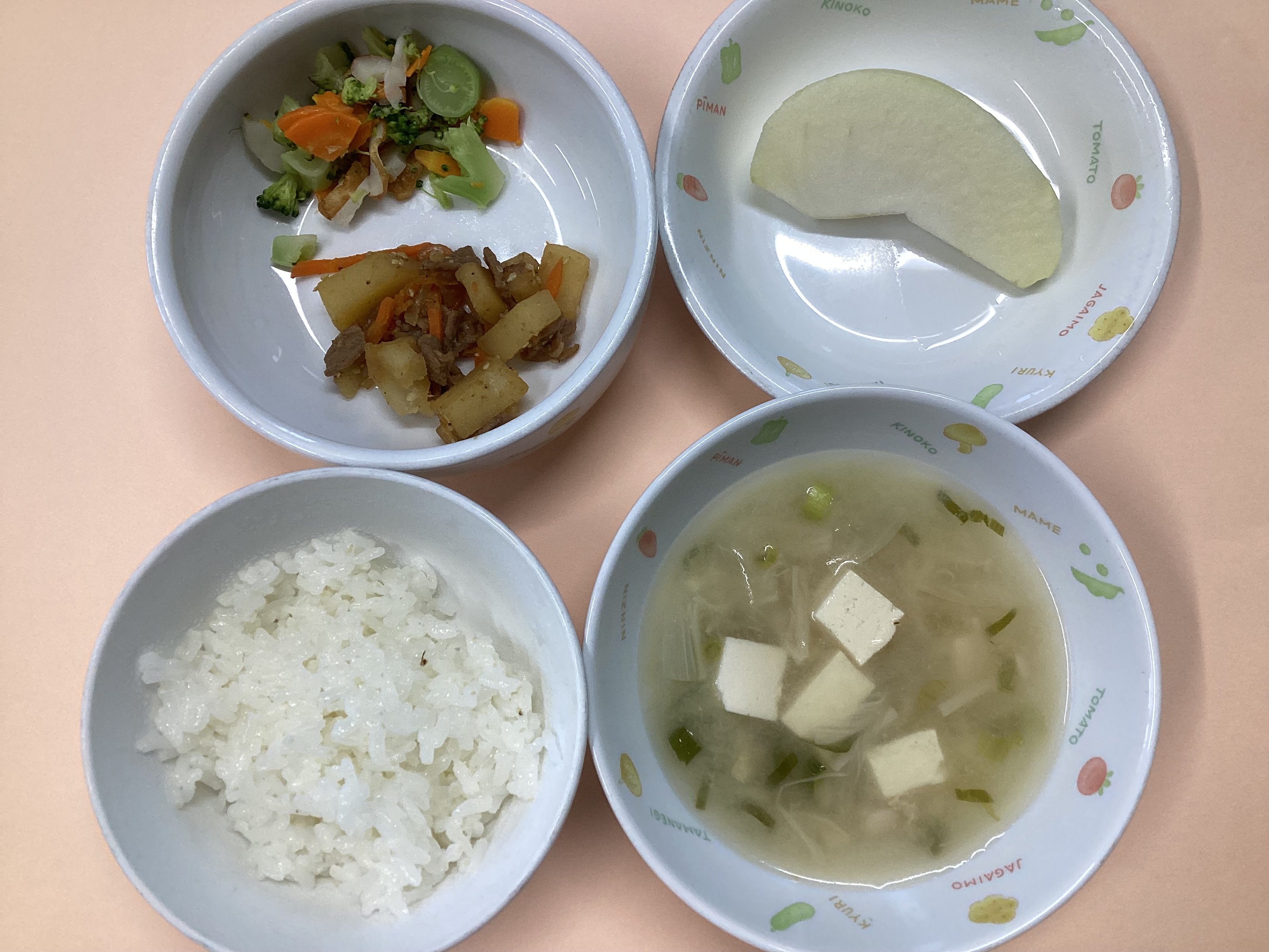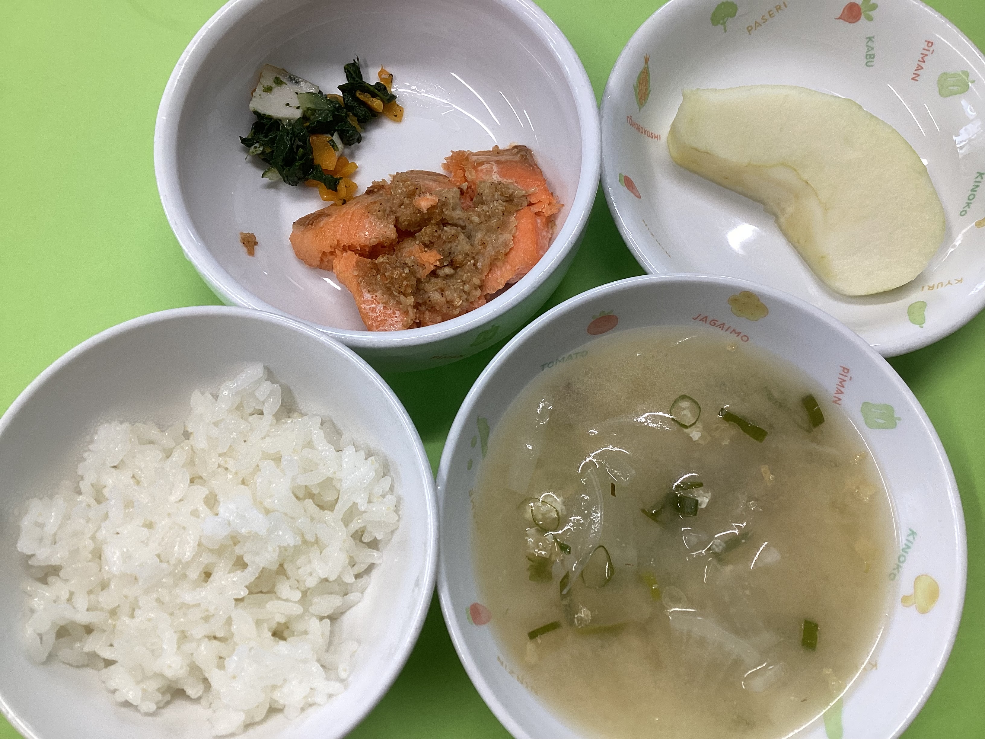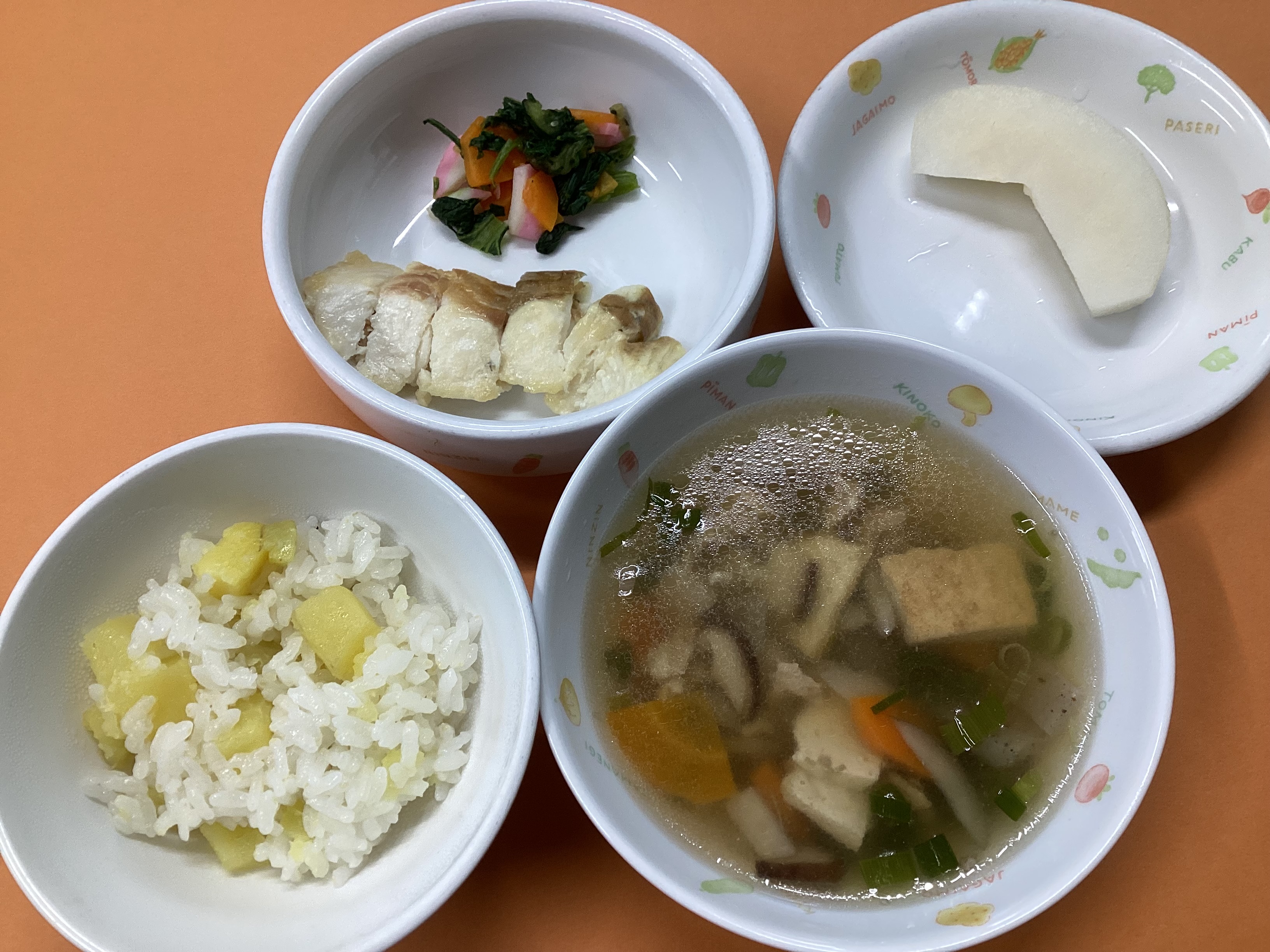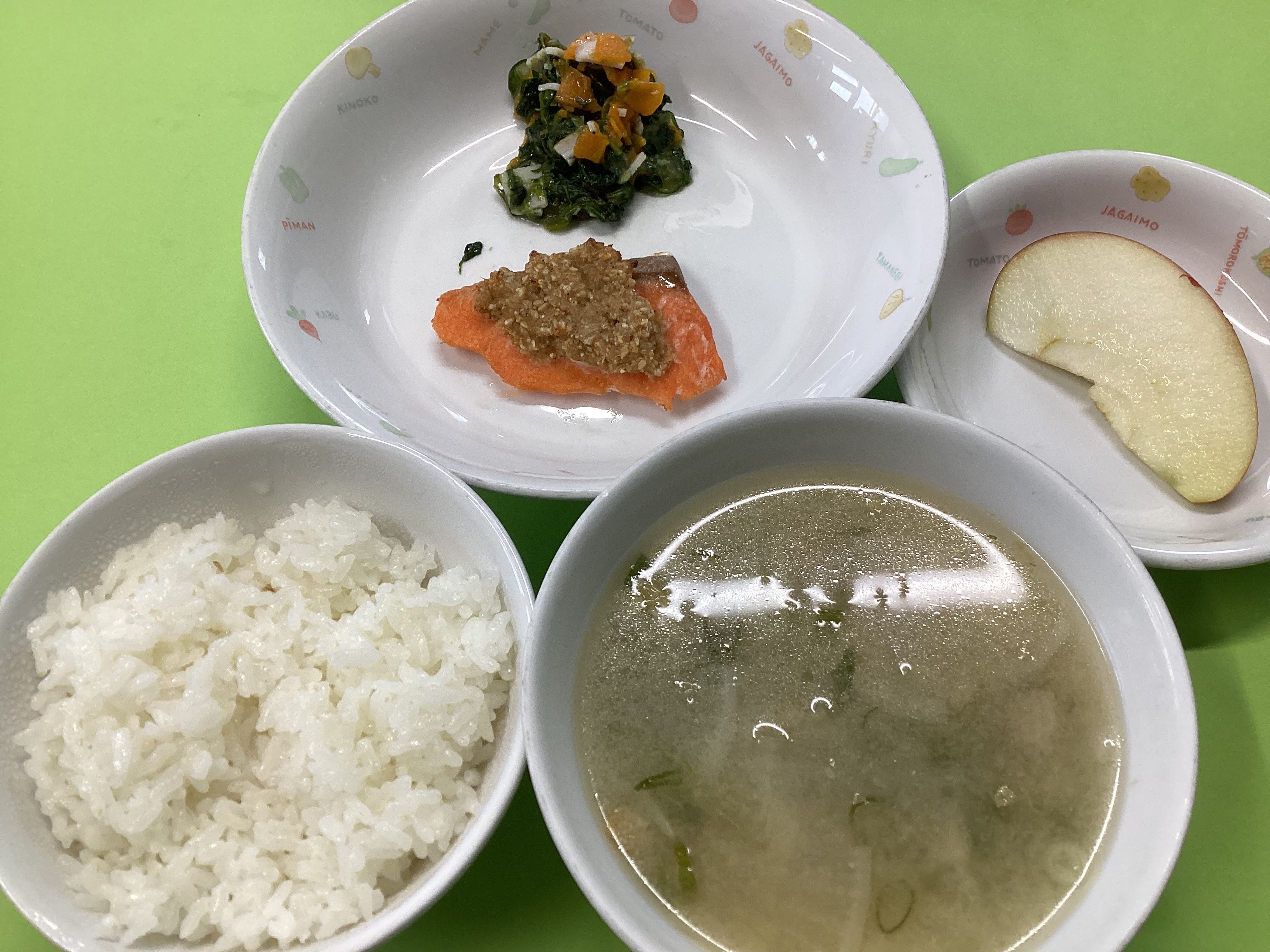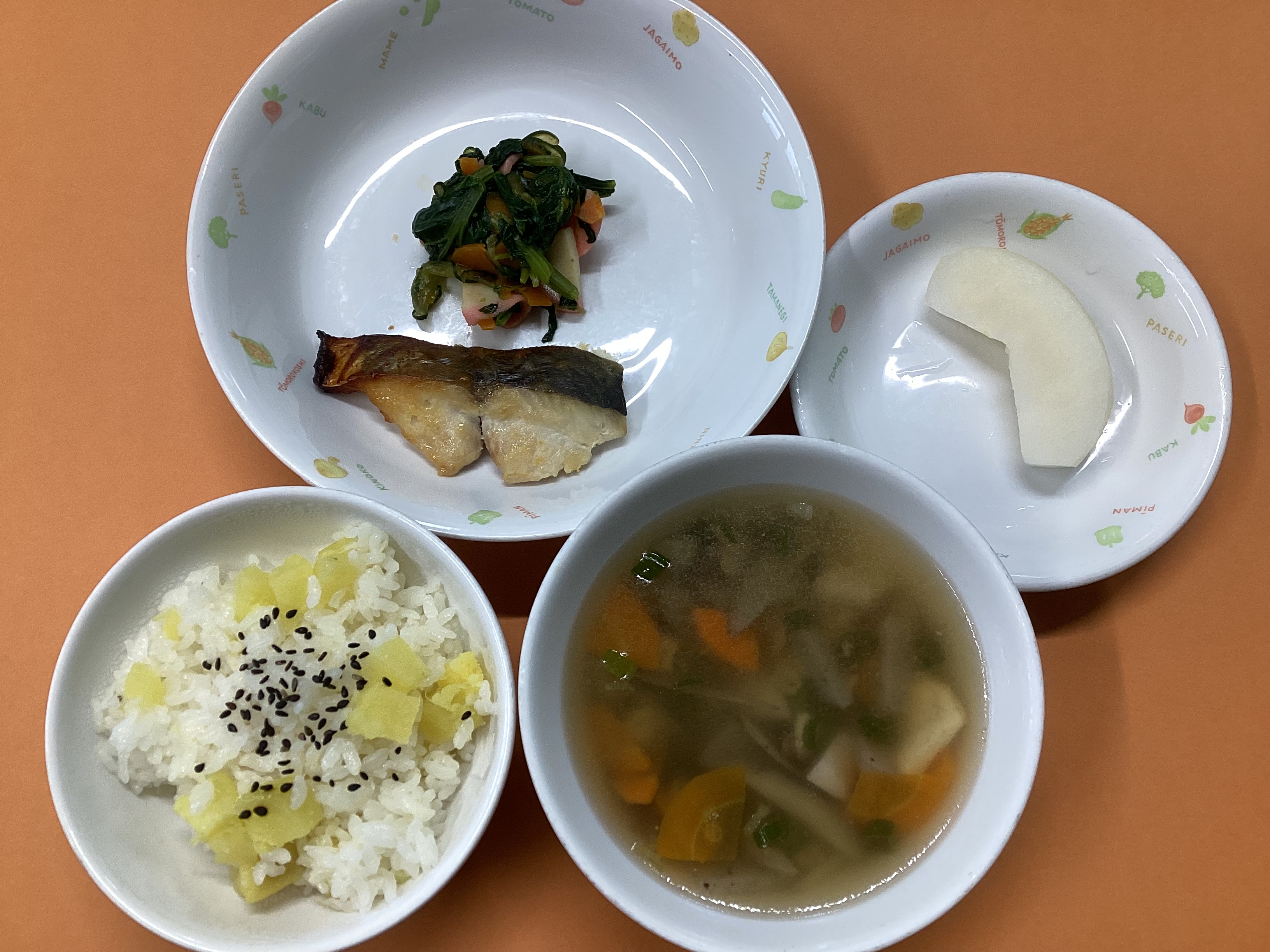 令和7年9月4日のお給食♪ 2025年 9月 5日 Fri 管理者 ・さつま芋ごはん(未満児は黒ごまなし) ・鰆の西京焼き(未満児は白身魚の西京焼き) ・小松菜の和え物 ・のっぺい汁 ・梨 (幼児) (未満児)