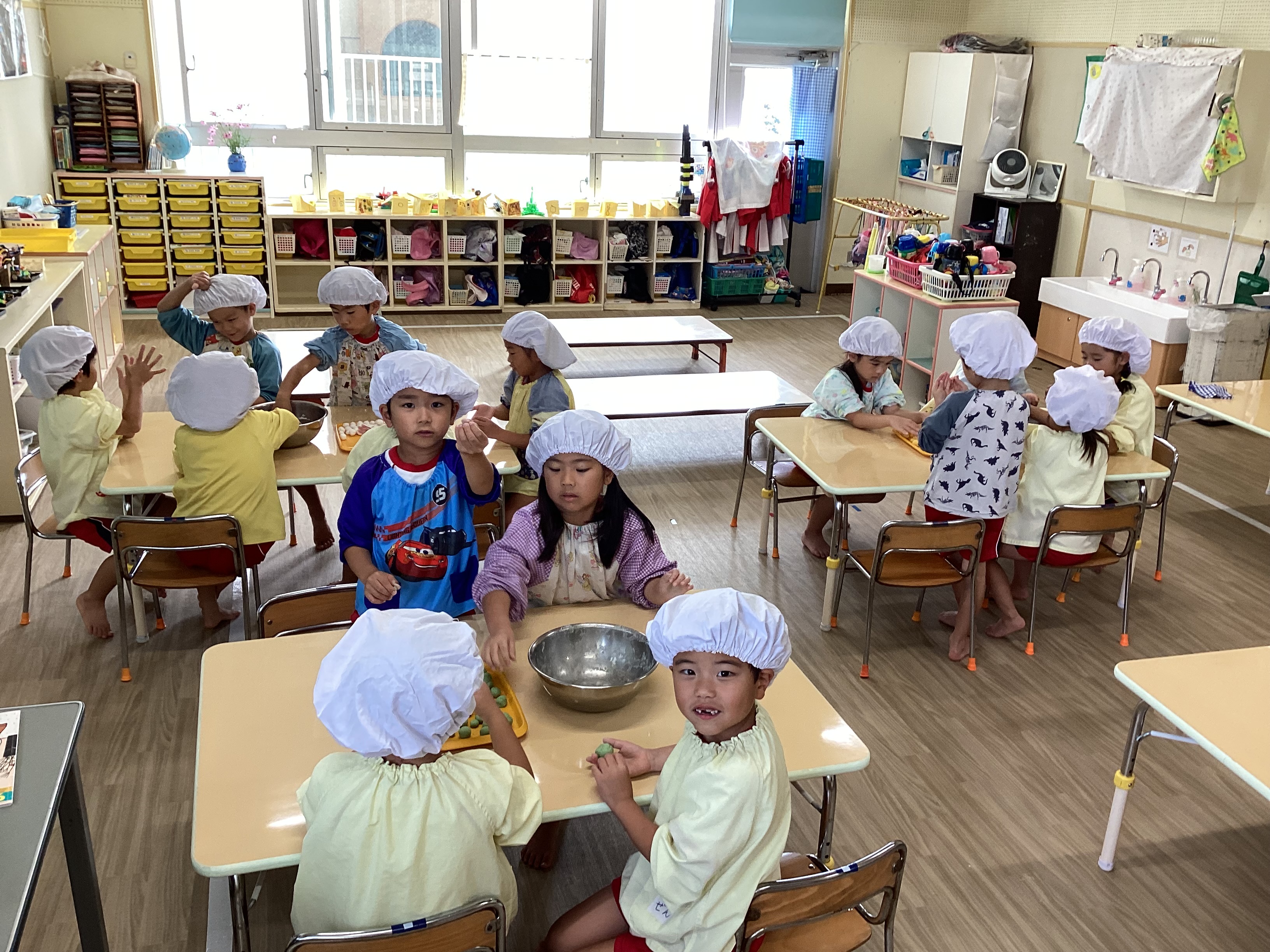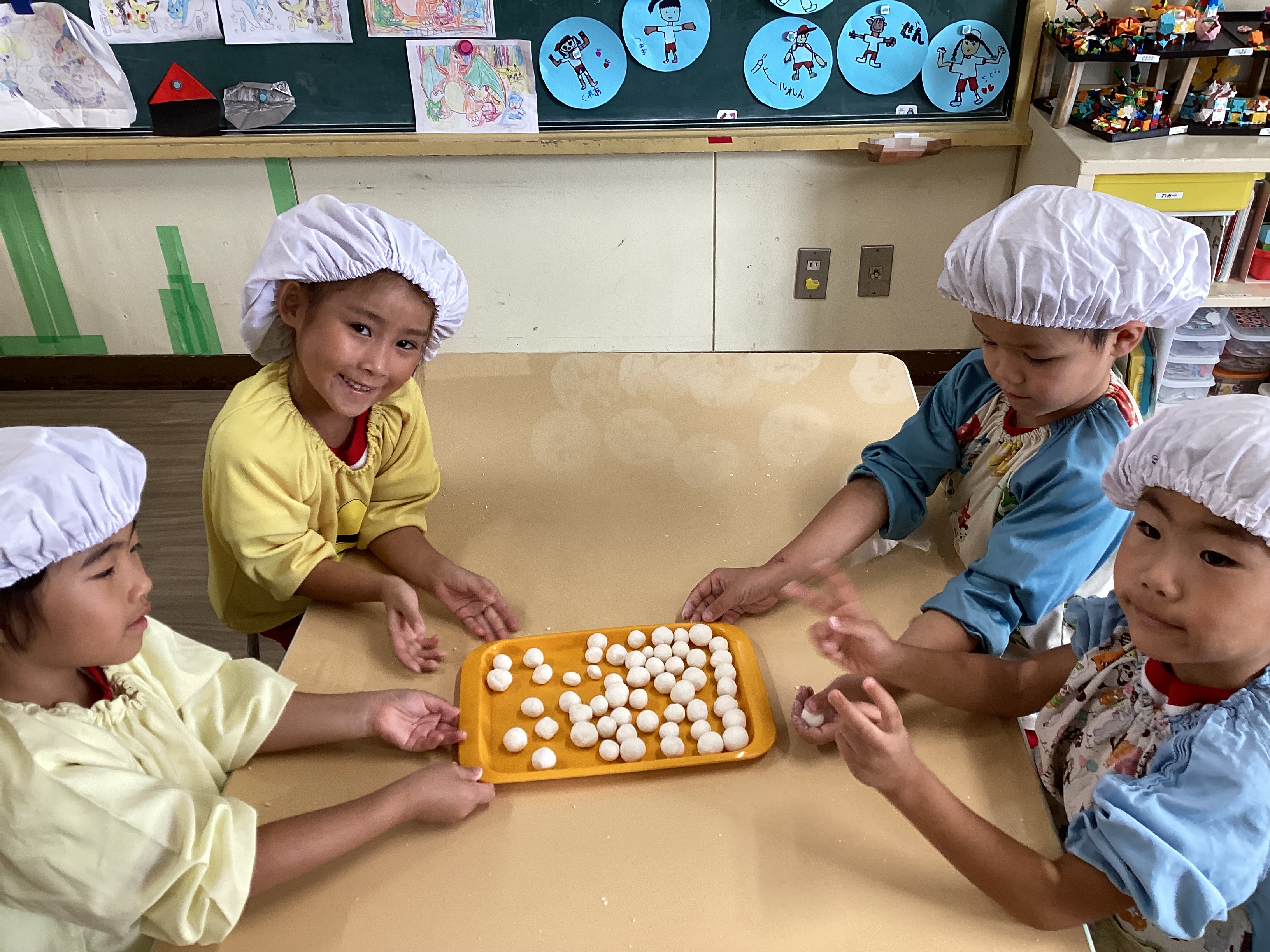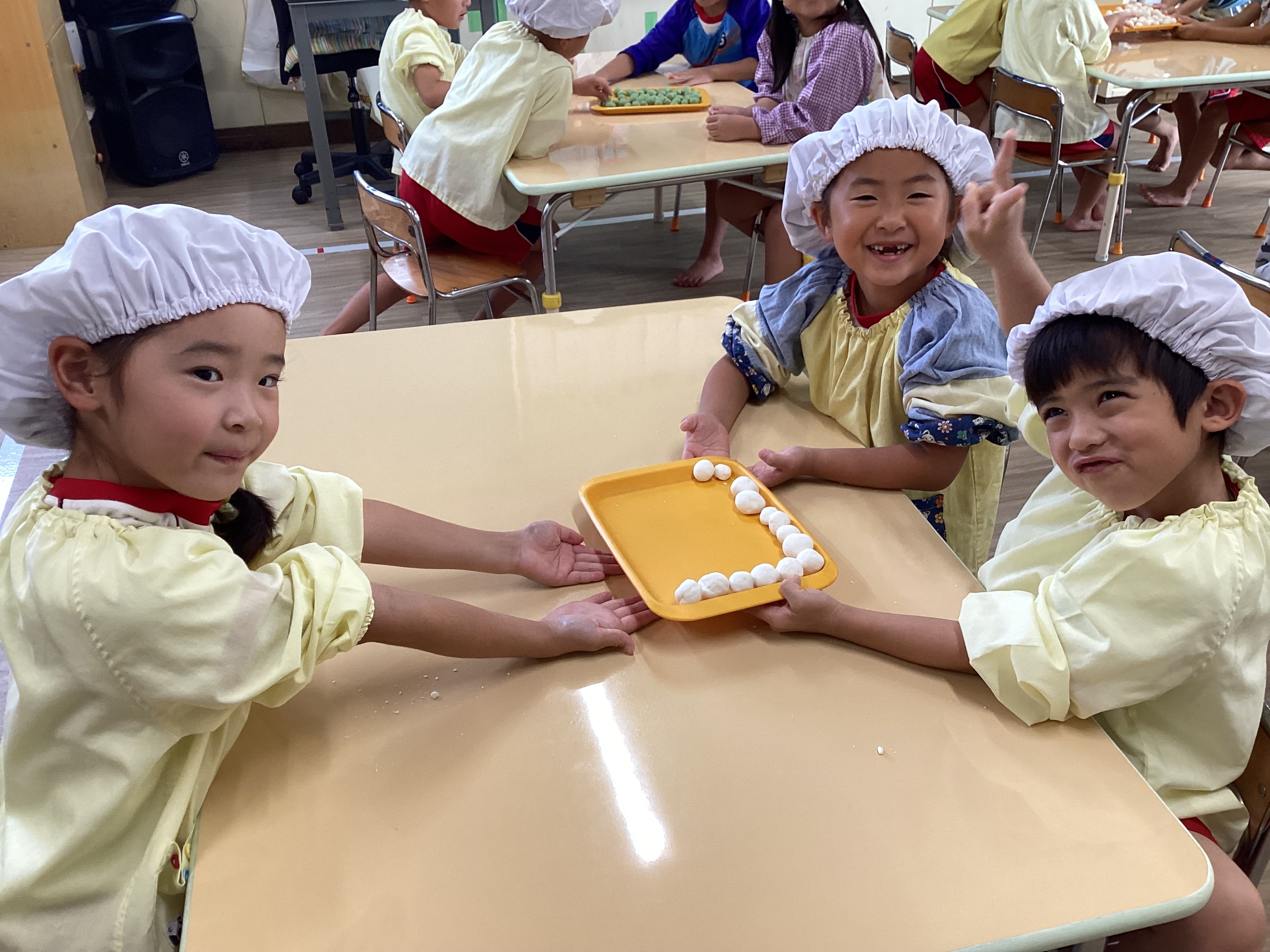 令和7年10月2日 きりん組さんお月見団子作り(^^♪ 2025年 10月 3日 Fri 管理者 今年の十五夜は10月6日です。 十五夜とは、1年で最も美しいとされている「中秋の名月」を鑑賞しながら、収穫などに感謝する行事です。 今年もきりん組さんにお団子づくりを手伝ってもらいました! お月様みたいなまん丸なお団子を作ろうと楽しんで作っていましたよ♪ いろいろな大きさのお団子ができました~(*^-^*) 小さいのがあったり、大きいのがあったり、みんなの個性を感じました☆ミ ほうれん草、かぼちゃ、冬瓜、きな粉の4種類のお団子を作りました。