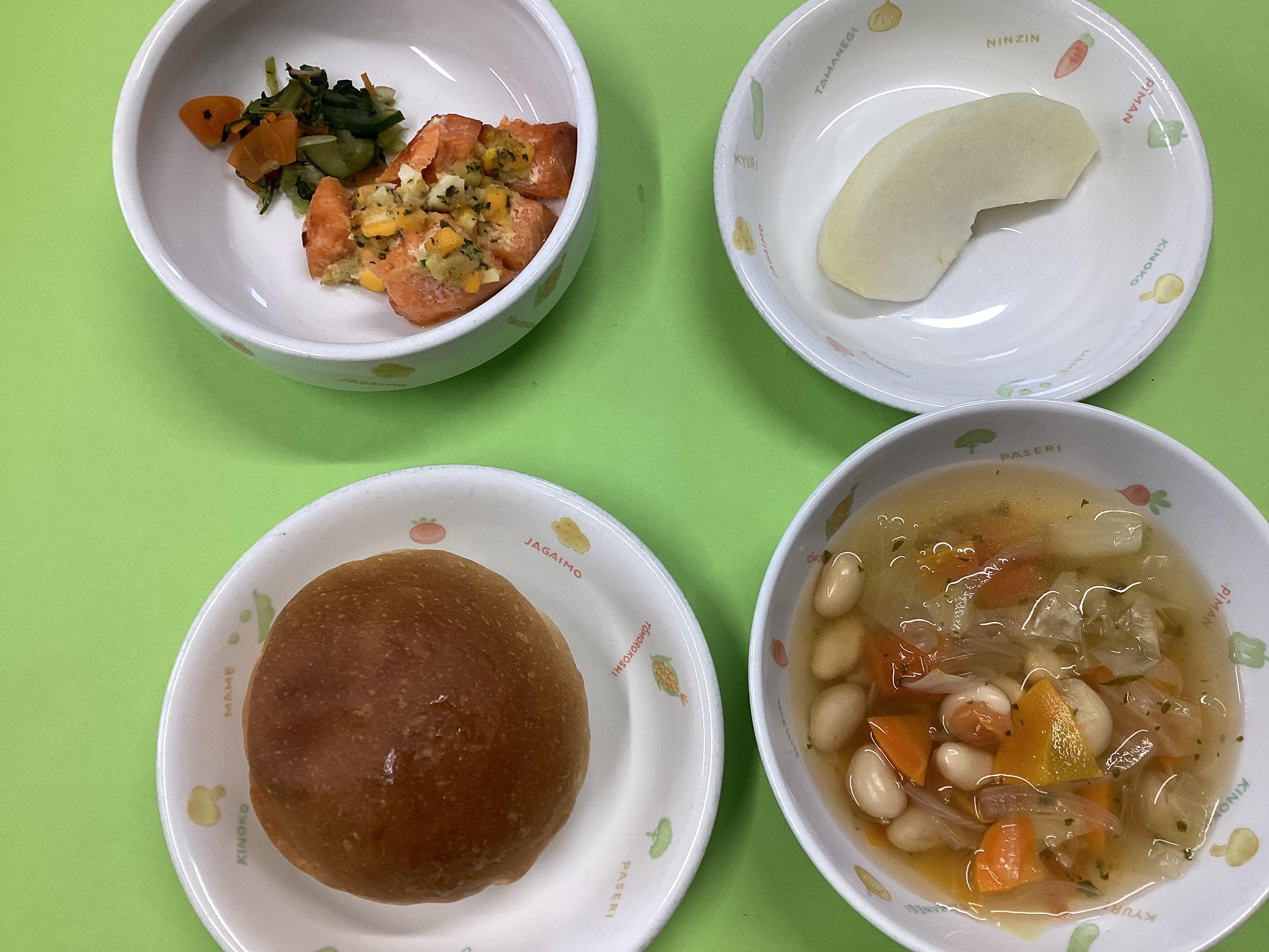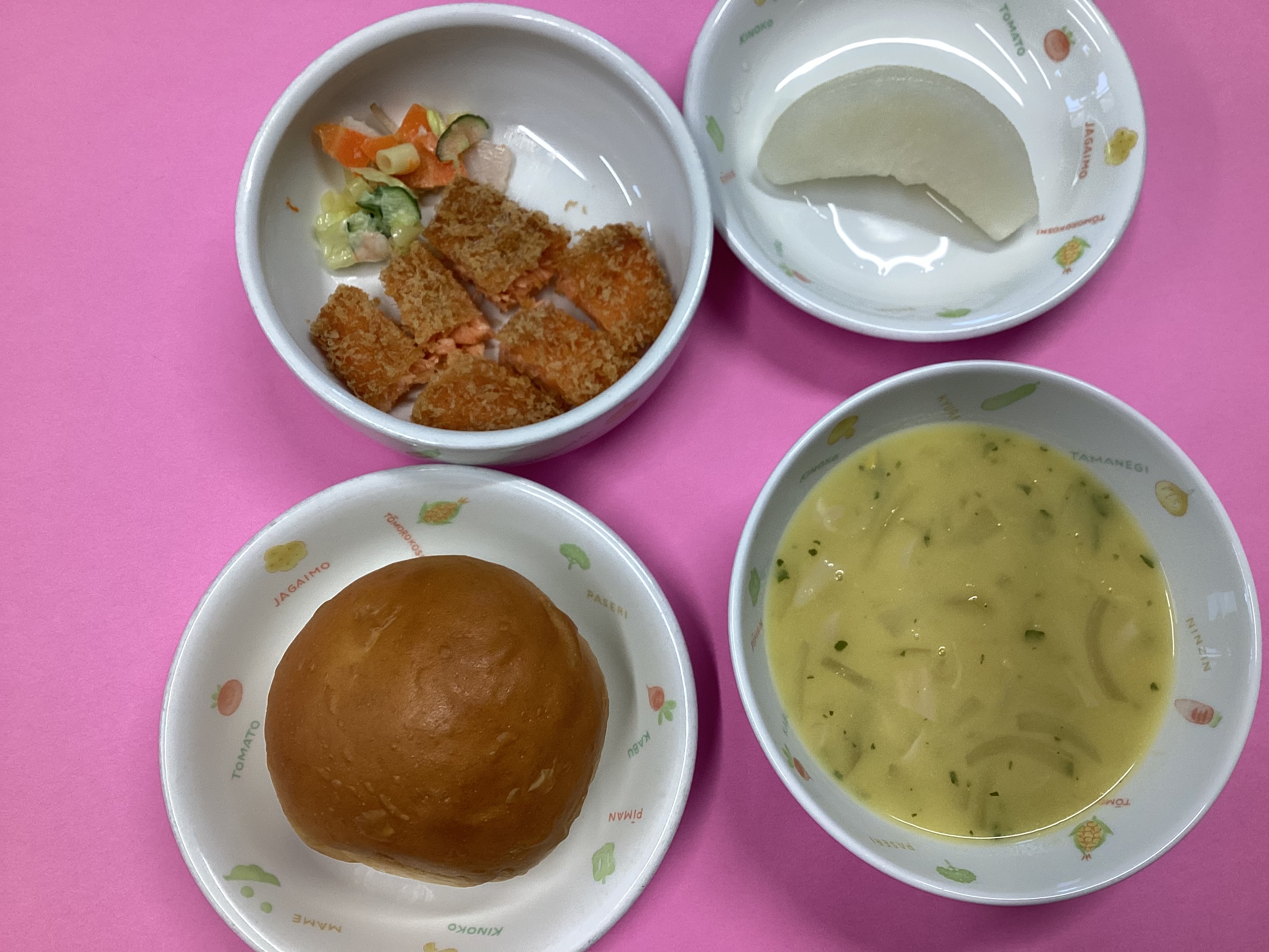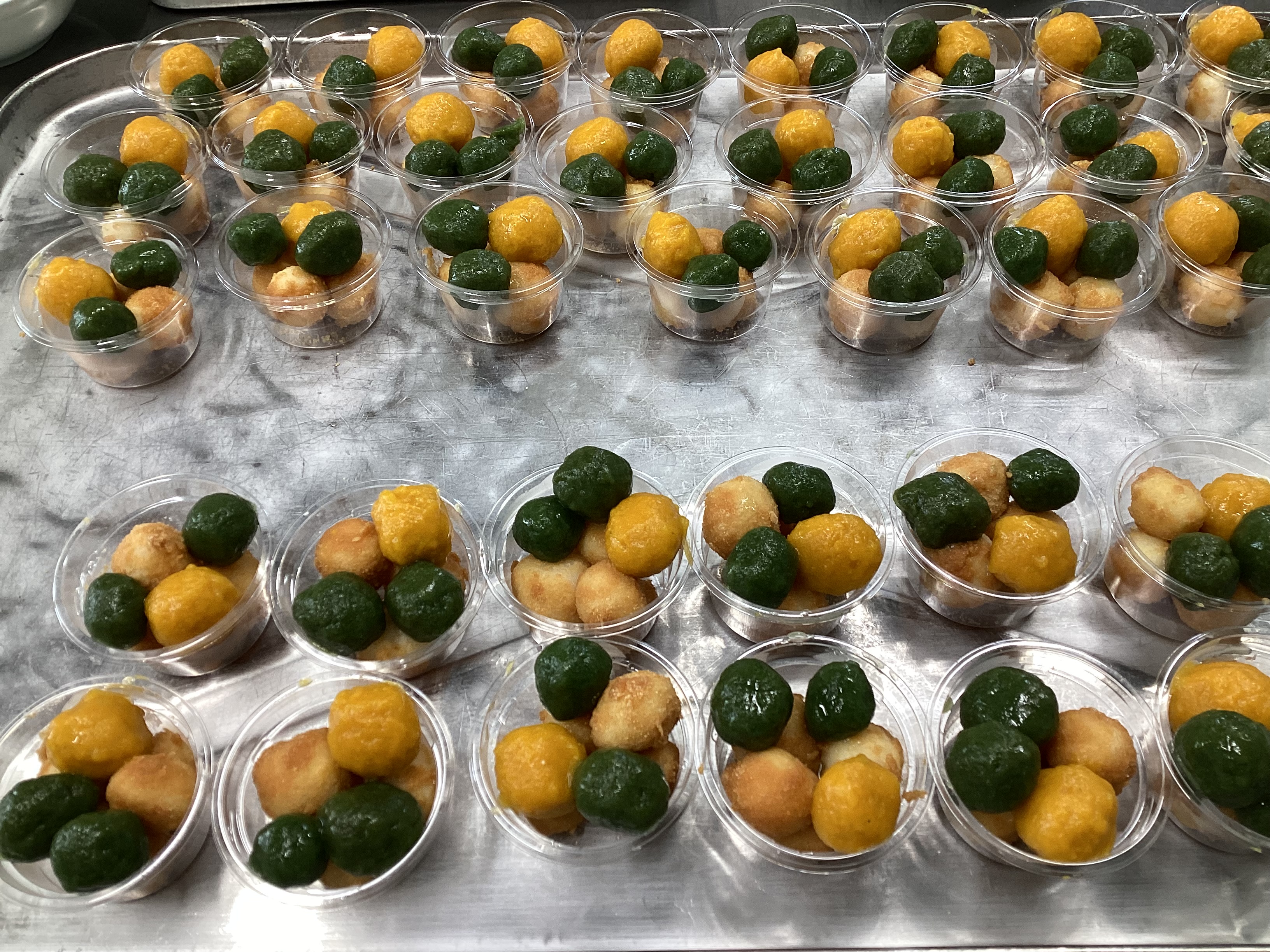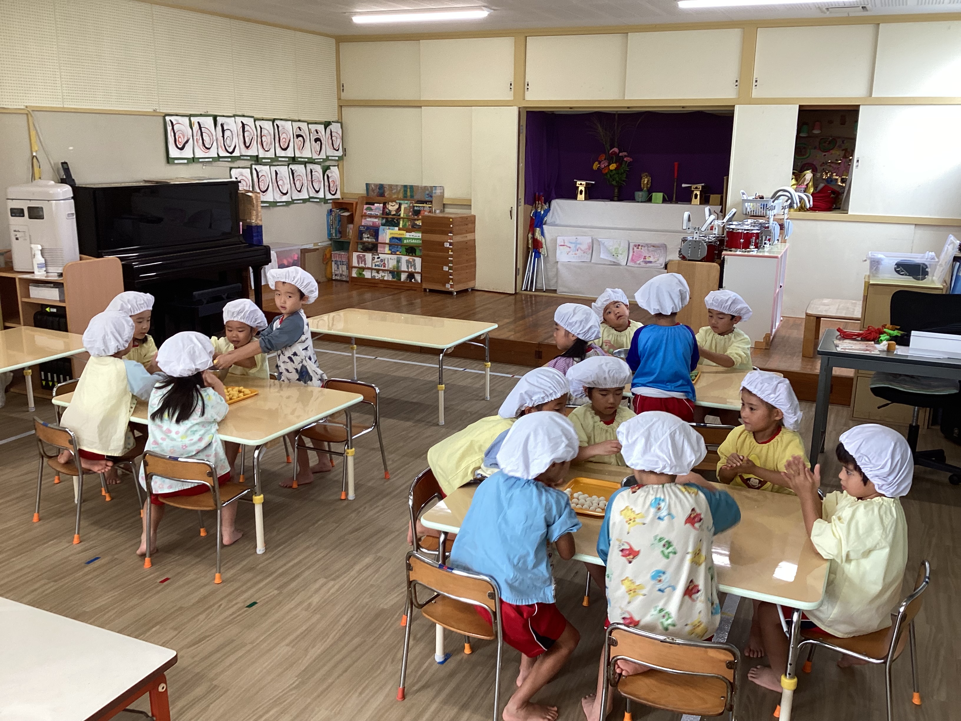令和7年10月2日 きりん組さんお月見団子作り(^^♪ 2025年 10月 3日 Fri 管理者 今年の十五夜は10月6日です。 十五夜とは、1年で最も美しいとされている「中秋の名月」を鑑賞しながら、収穫などに感謝する行事です。 今年もきりん組さんにお団子づくりを手伝ってもらいました! お月様みたいなまん丸なお団子を作ろうと楽しんで作っていましたよ♪ いろいろな大きさのお団子ができました~(*^-^*) 小さいのがあったり、大きいのがあったり、みんなの個性を感じました☆ミ ほうれん草、かぼちゃ、冬瓜、きな粉の4種類のお団子を作りました。