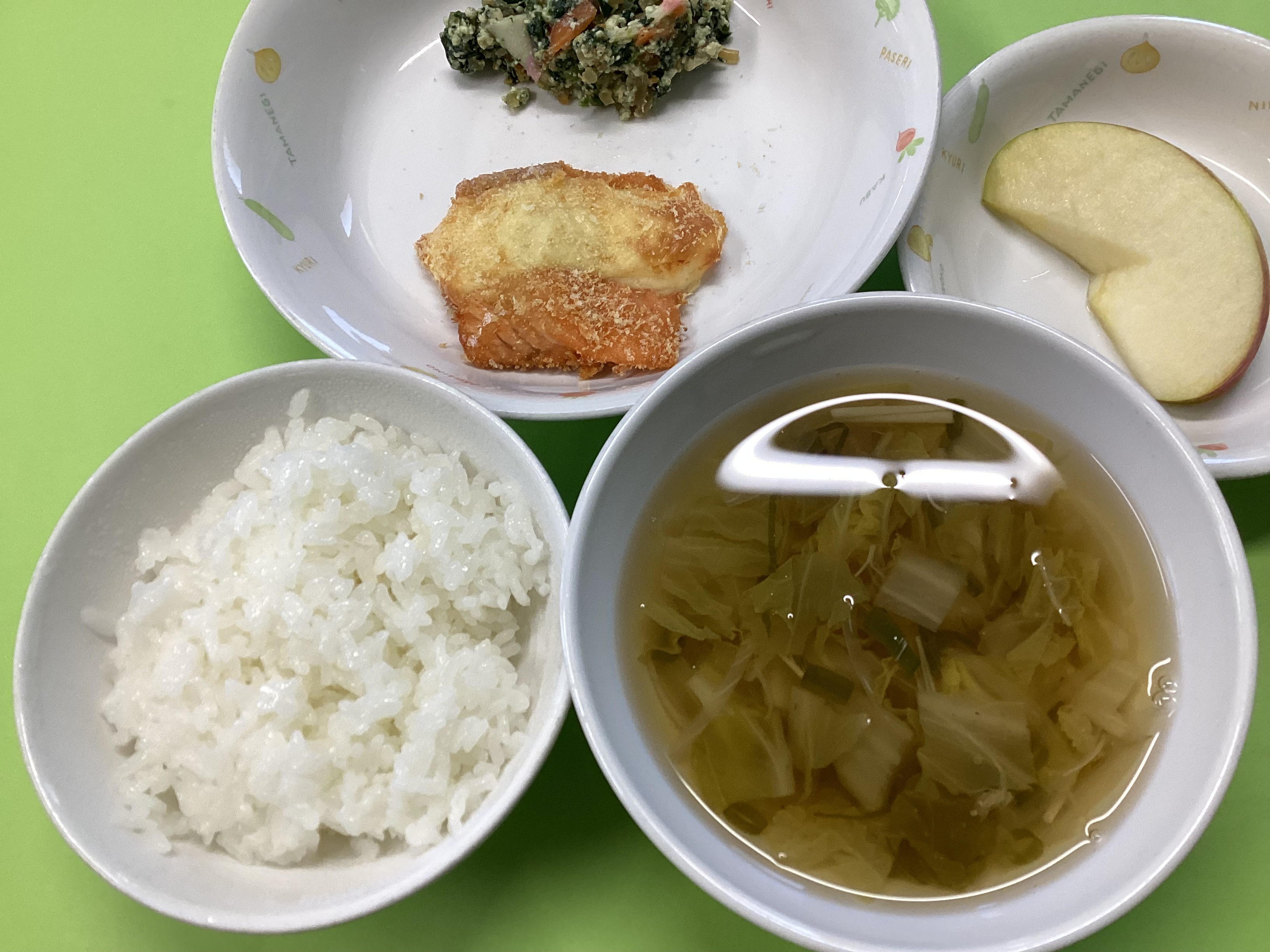 令和7年11月28日のお給食♪ 2025年 11月 29日 Sat 管理者 ・炊き込みご飯 ・鰆の西京焼き(未満児は白身魚の西京焼き) ・ブロッコリーのフレンチ和え ・わかめスープ ・キウイフルーツ(未満児はりんご) (幼児) (未満児)
