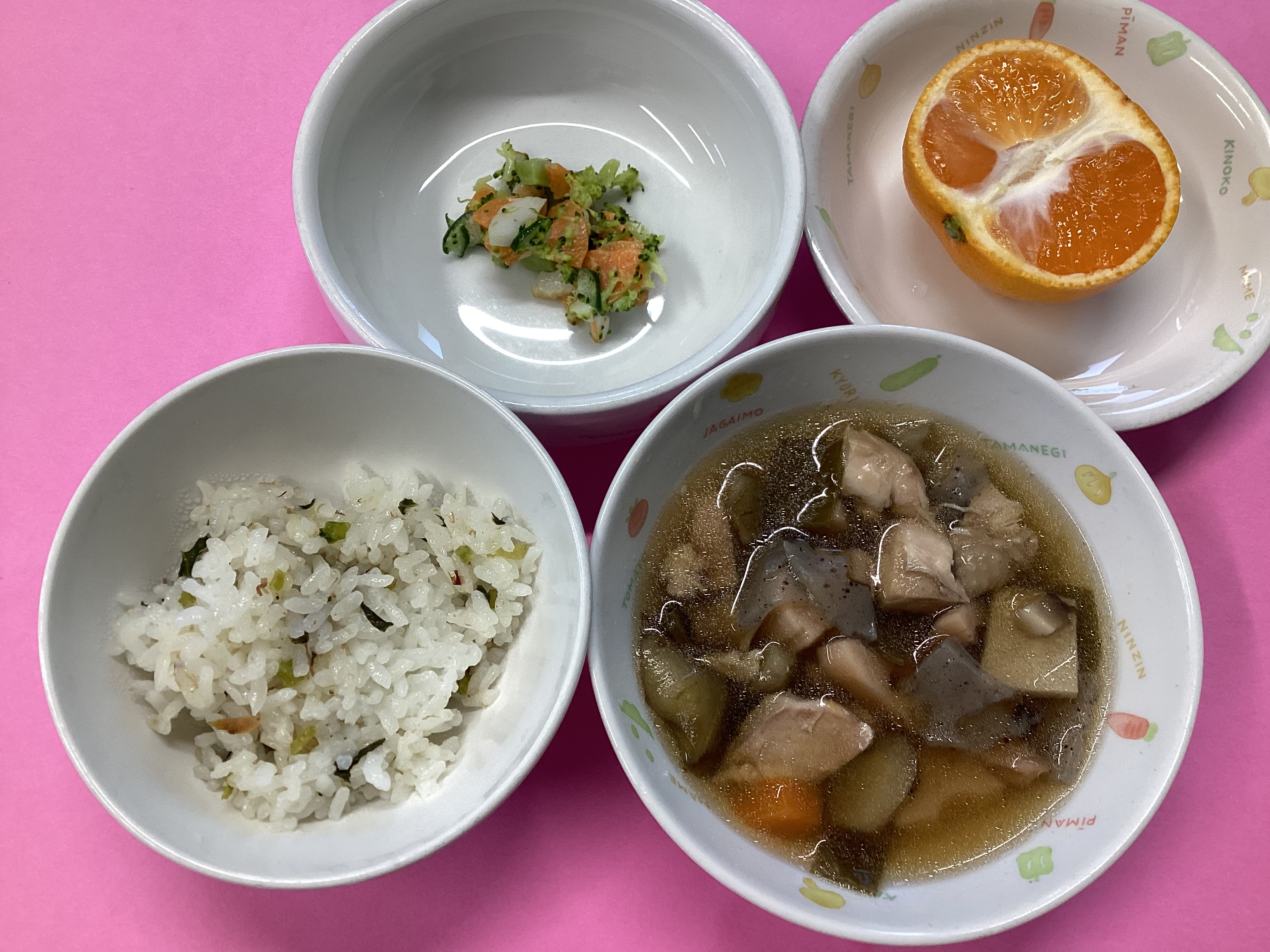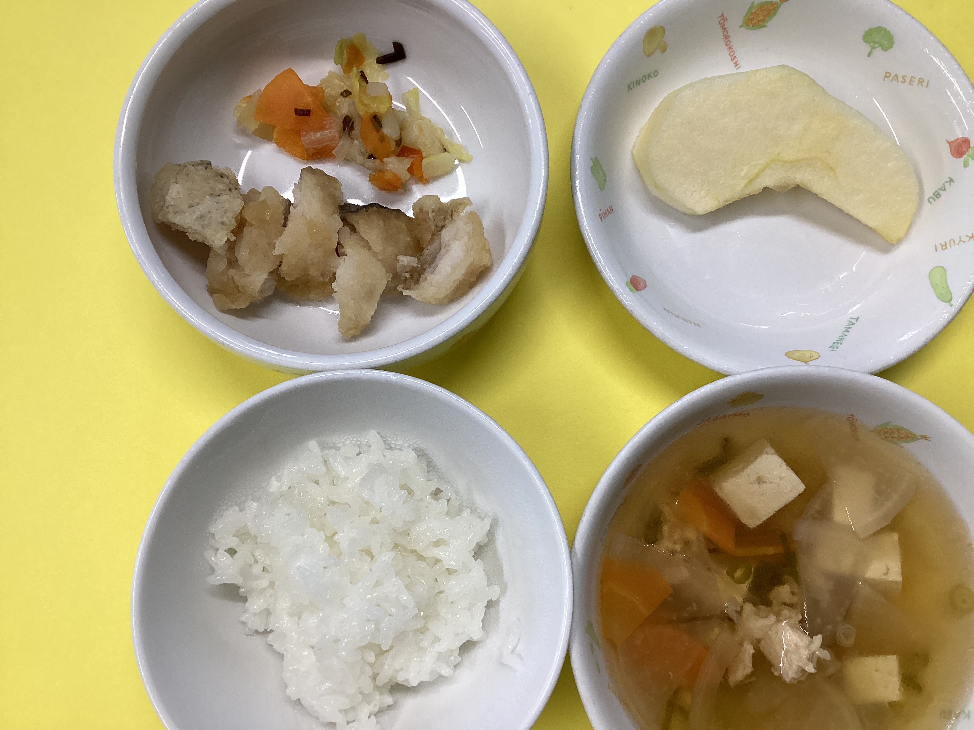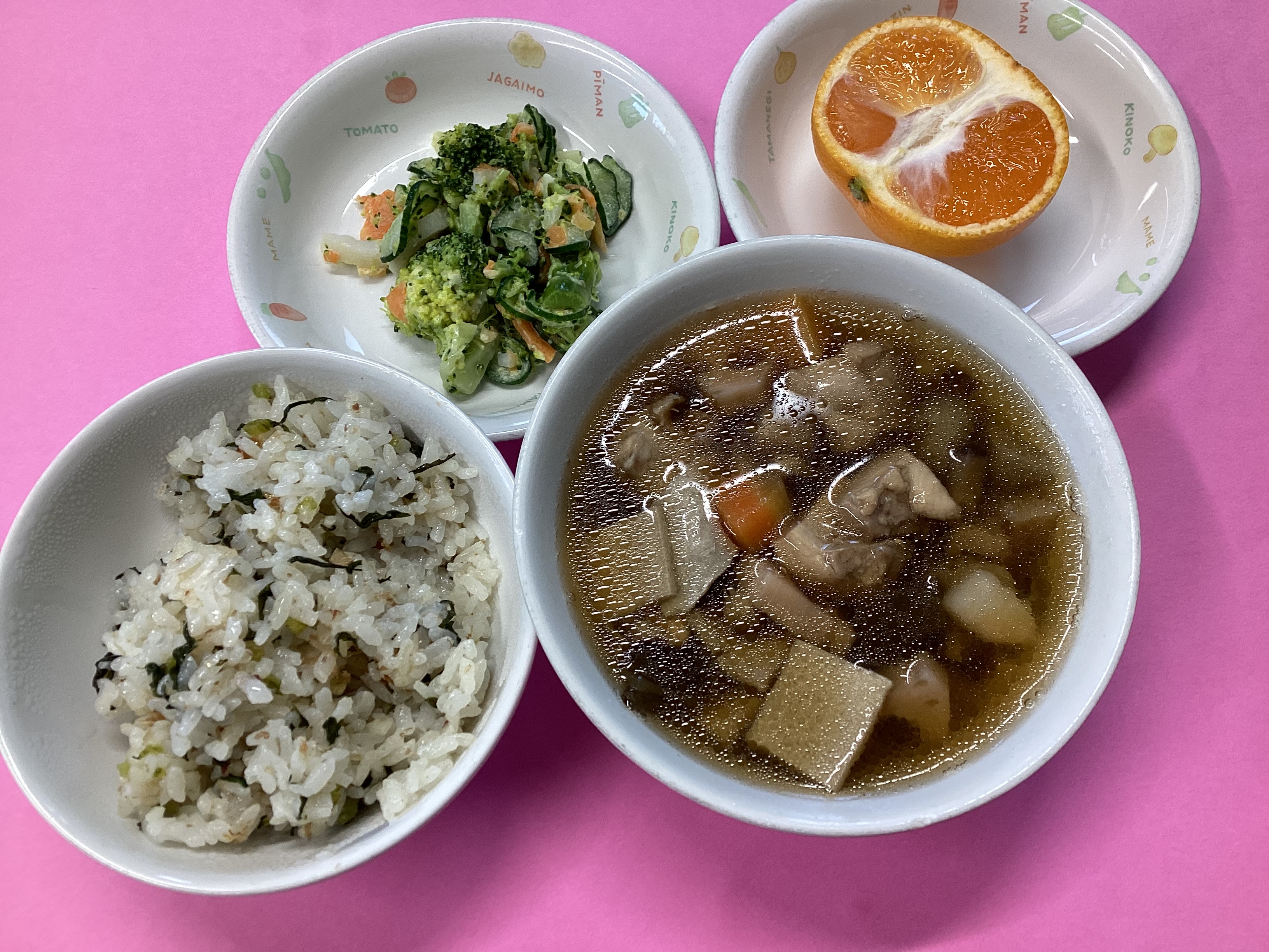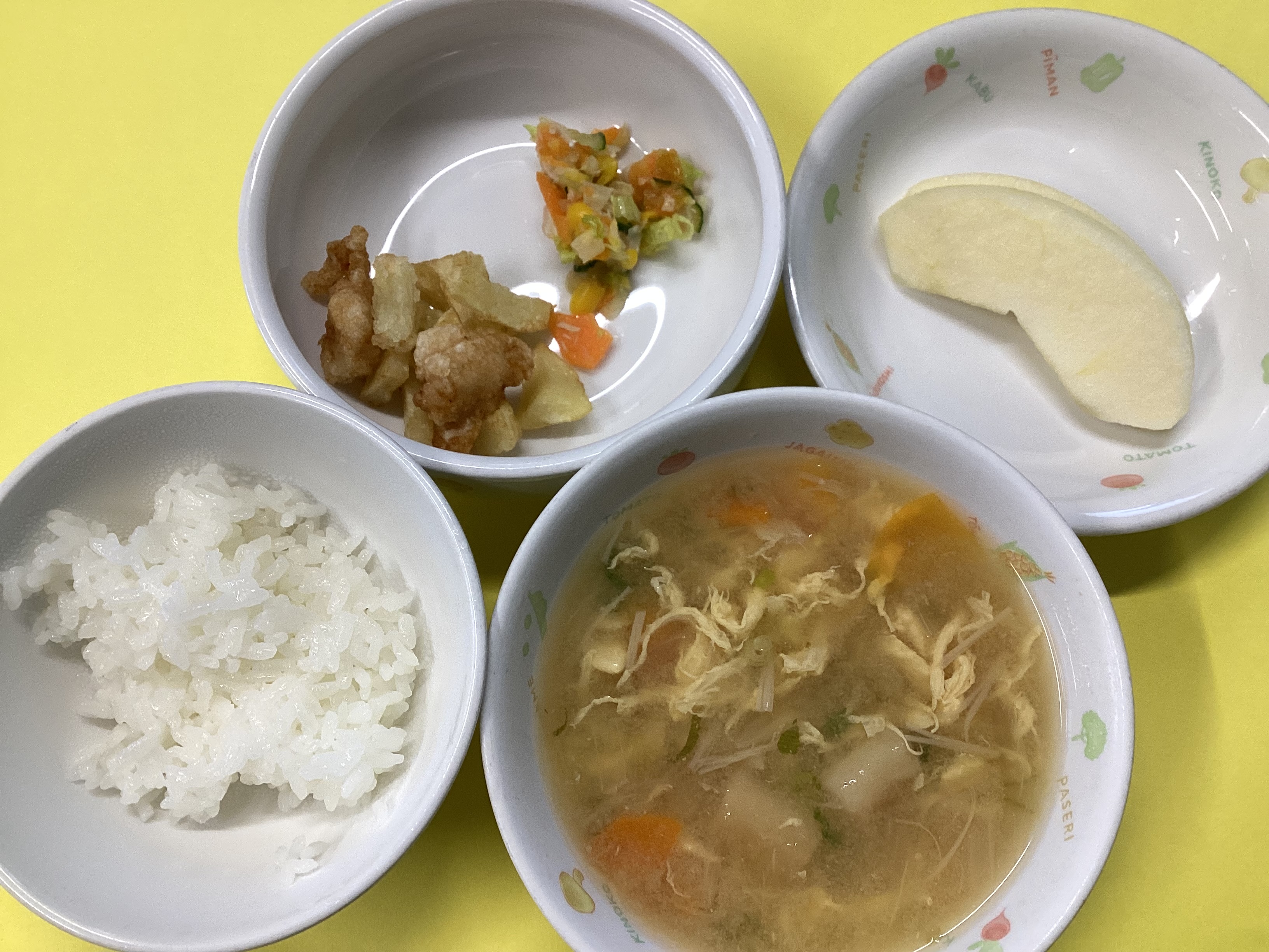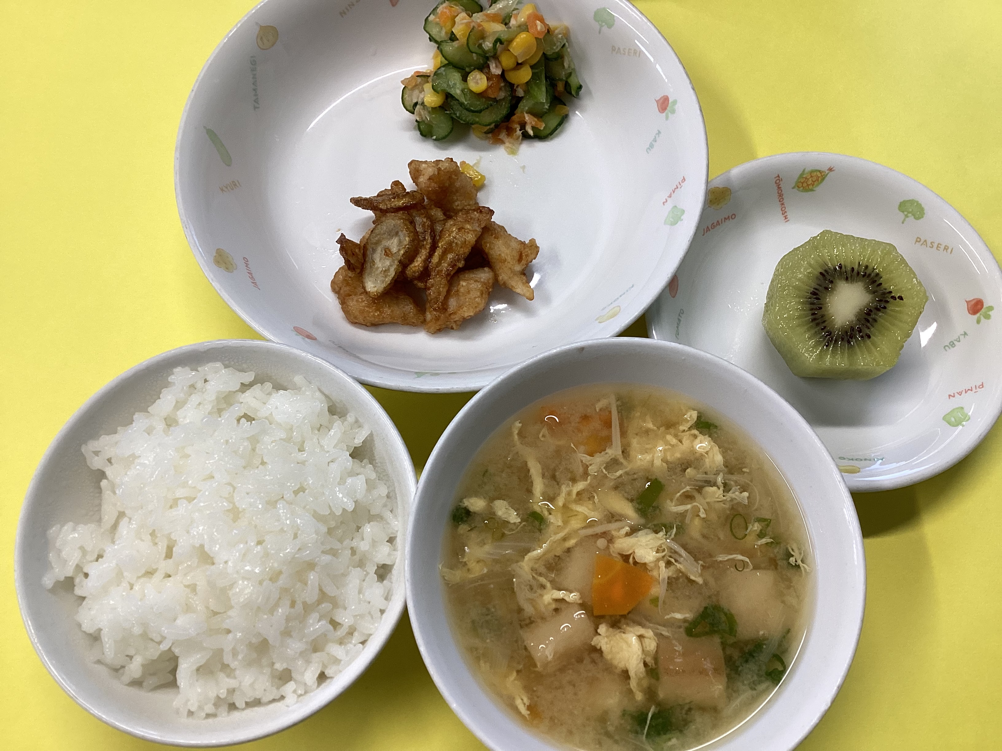 令和7年11月17日のお給食♪ 2025年 11月 22日 Sat 管理者 ・ご飯 ・チキンチキンごぼう(たまご組のみチキンチキンじゃが芋) ・コーンサラダ ・かき玉味噌汁 ・キウイフルーツ(未満児はりんご) (幼児) (未満児)