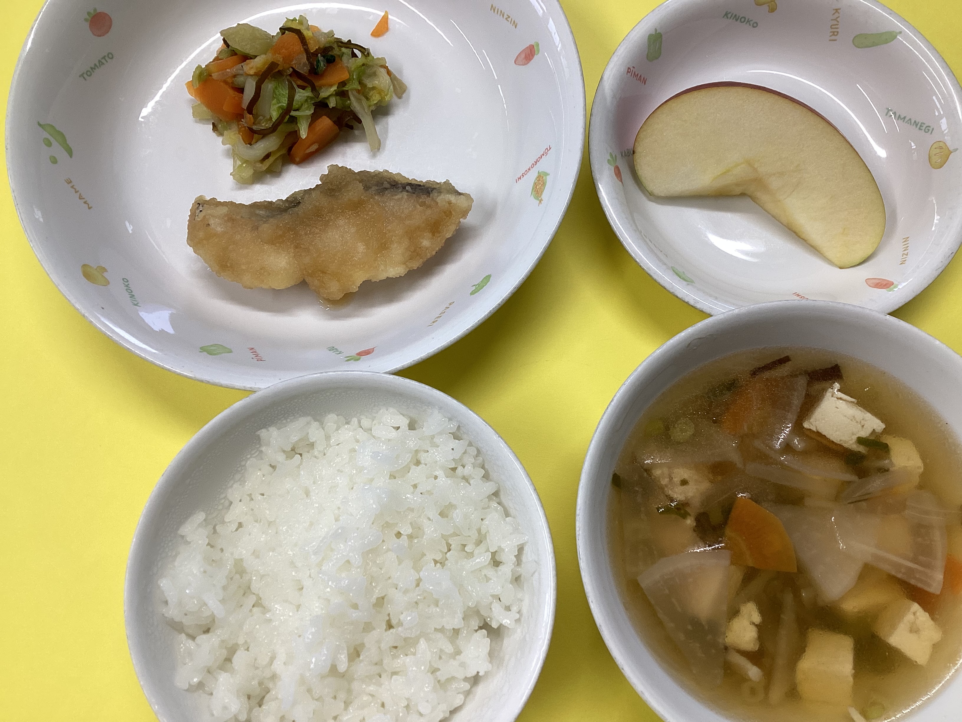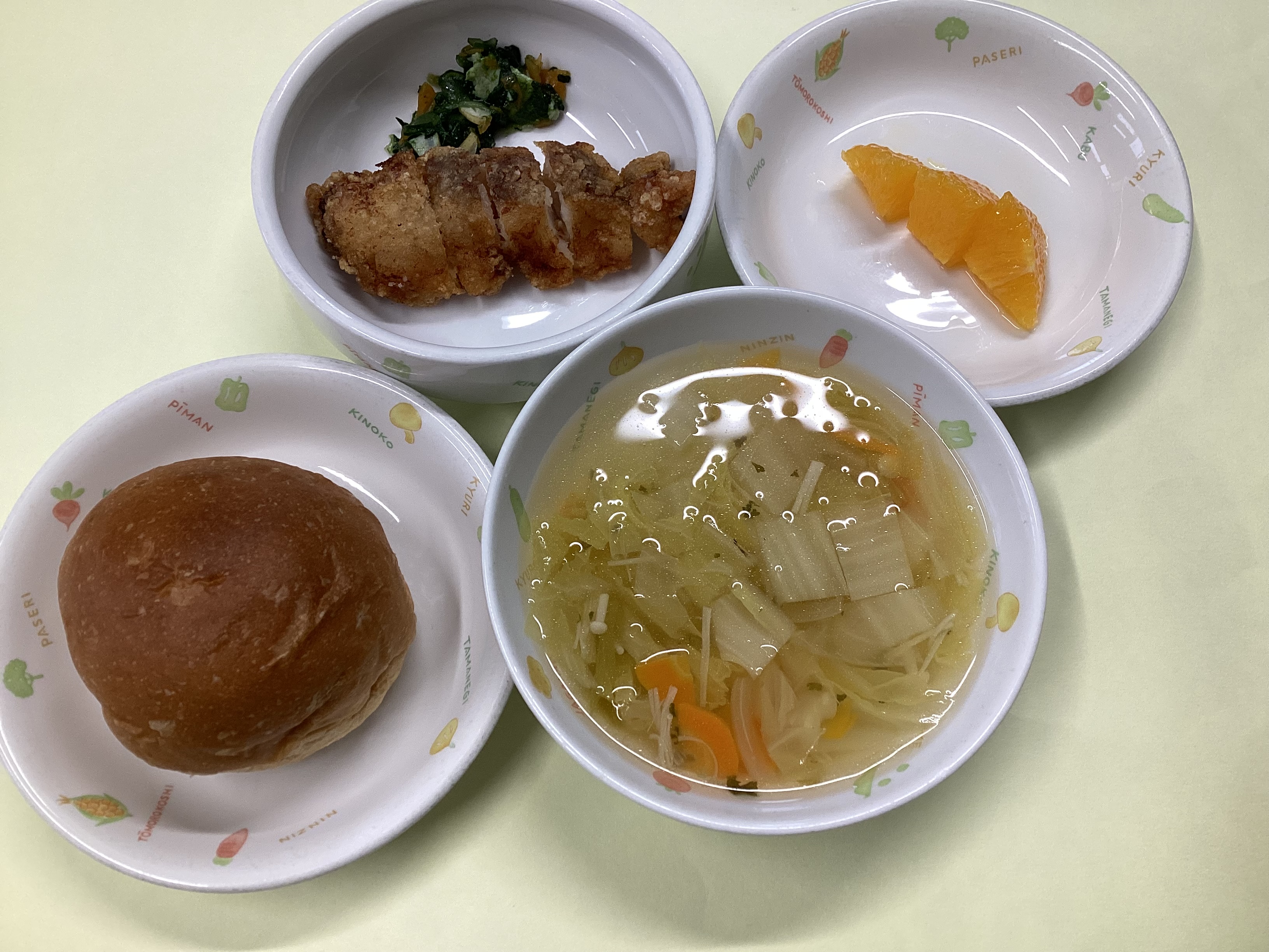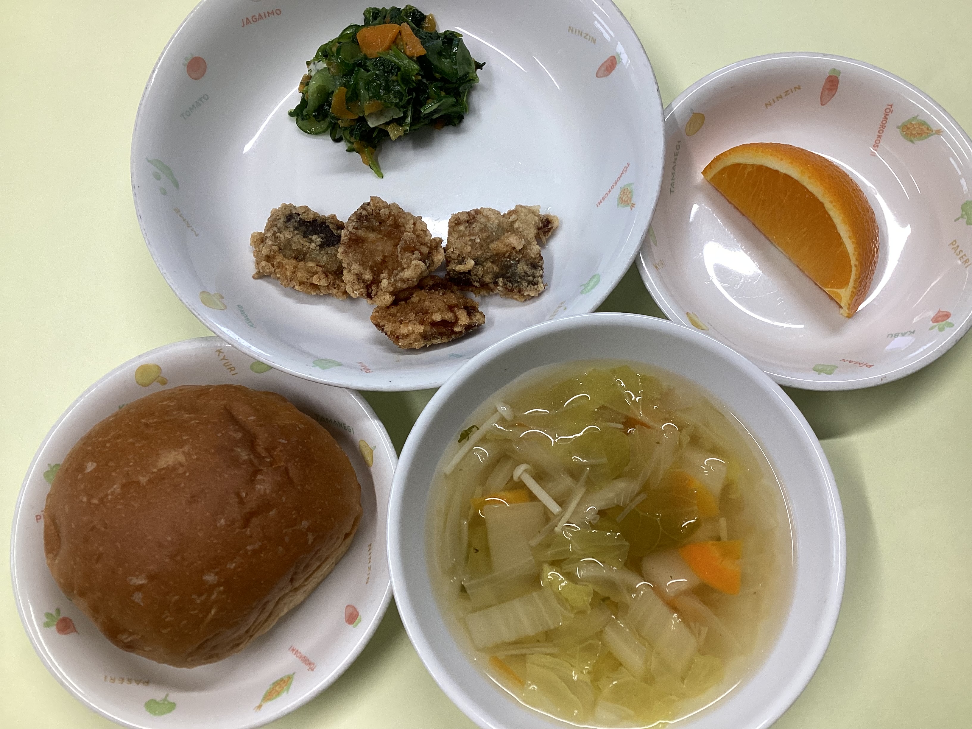 令和7年11月18日のお給食♪ 2025年 11月 22日 Sat 管理者 ・黒糖丸パン ・鰯の竜田揚げ(未満児は白身魚の竜田揚げ) ・ほうれん草のフレンチ和え ・野菜スープ ・オレンジ (幼児) (未満児)