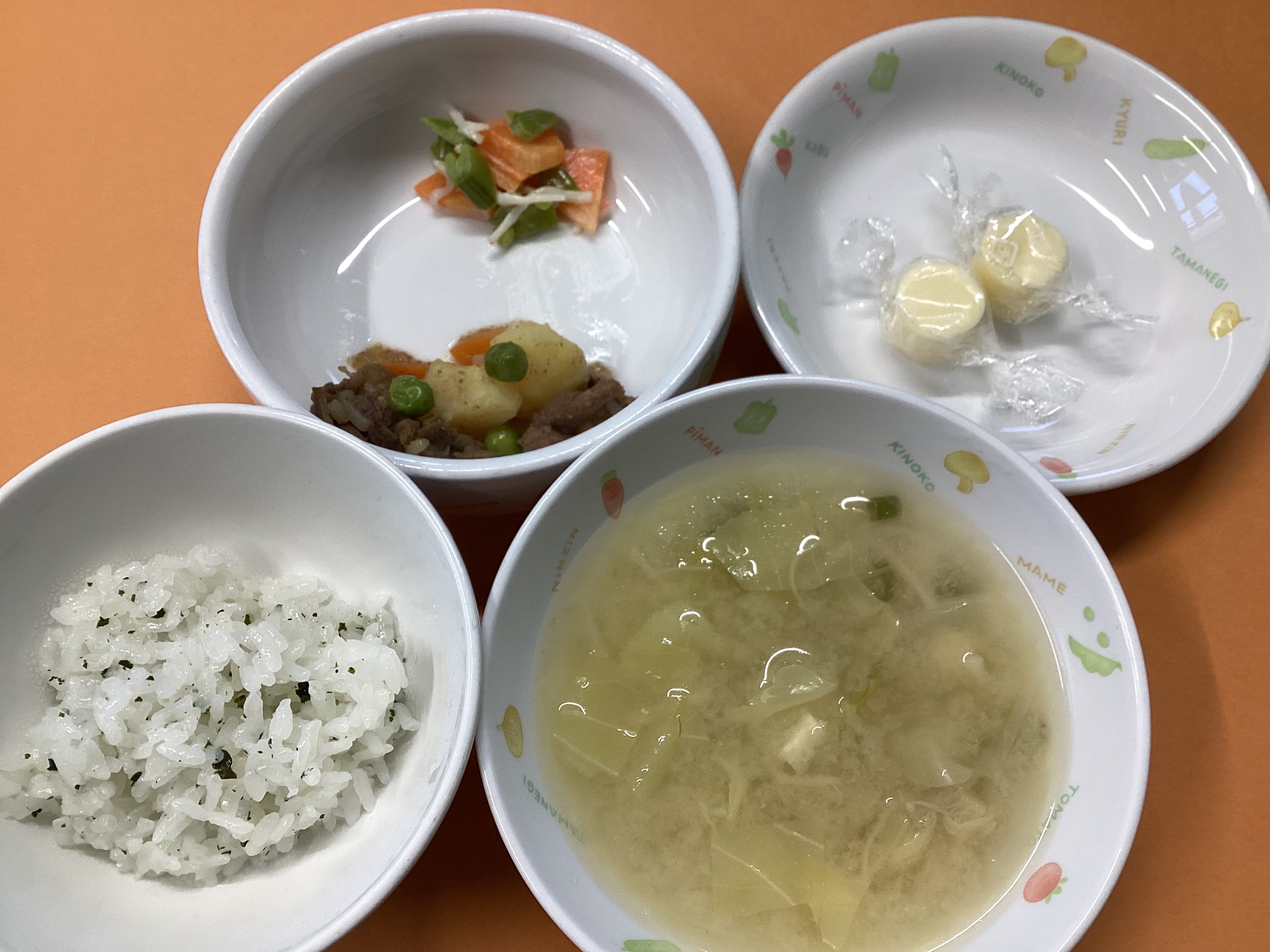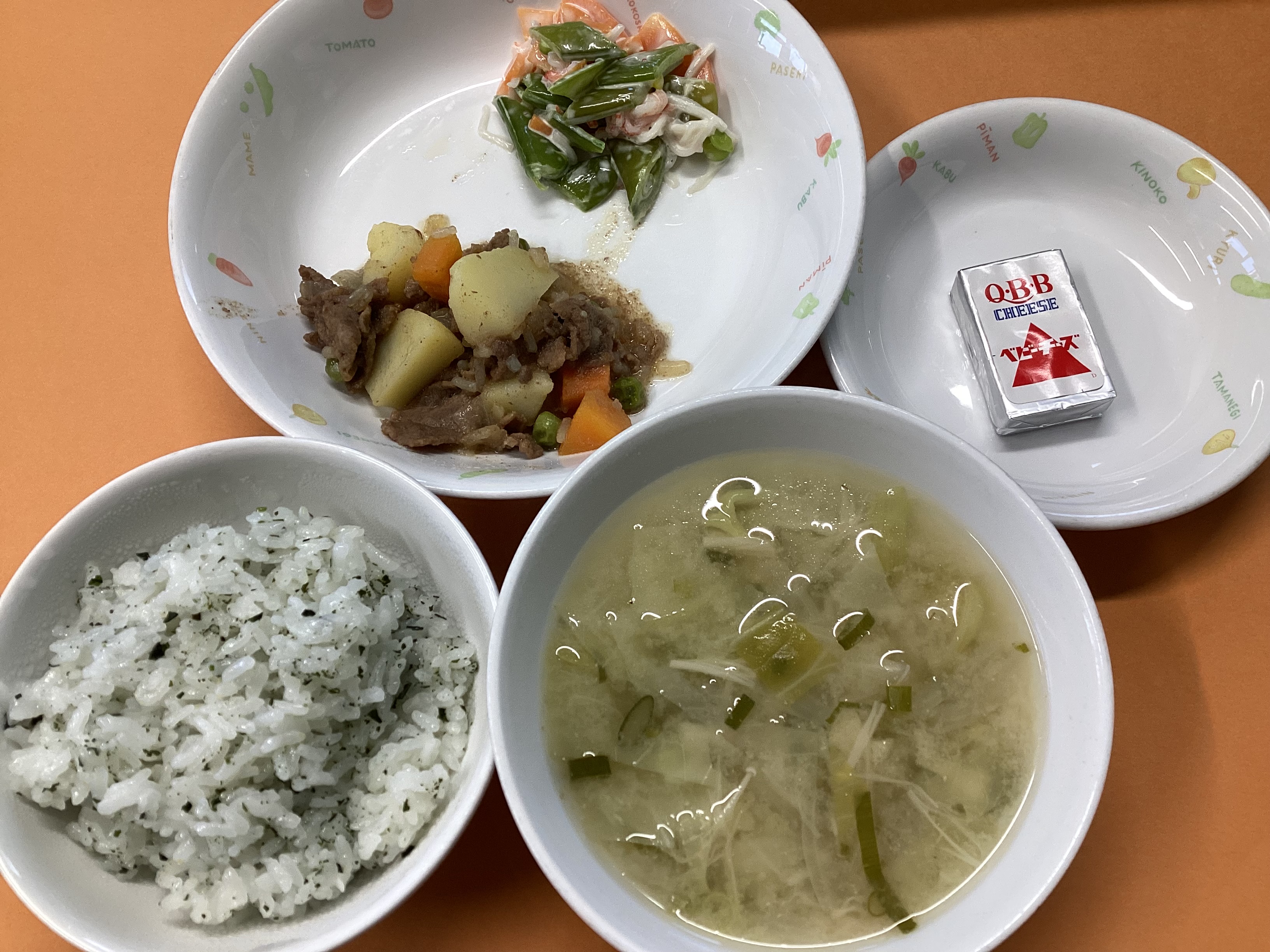 令和8年4月8日のお給食♪ 2026年 4月 13日 Mon 管理者 ~昼食~ ・わかめごはん ・肉じゃが ・スナップエンドウとカニカマのサラダ ・キャベツの味噌汁 ・チーズ (幼児) (未満児) ~おやつ~ ・ポパイケーキ ・スキムミルク ホットケーキミックスがベースのほうれん草入りのケーキです♡
