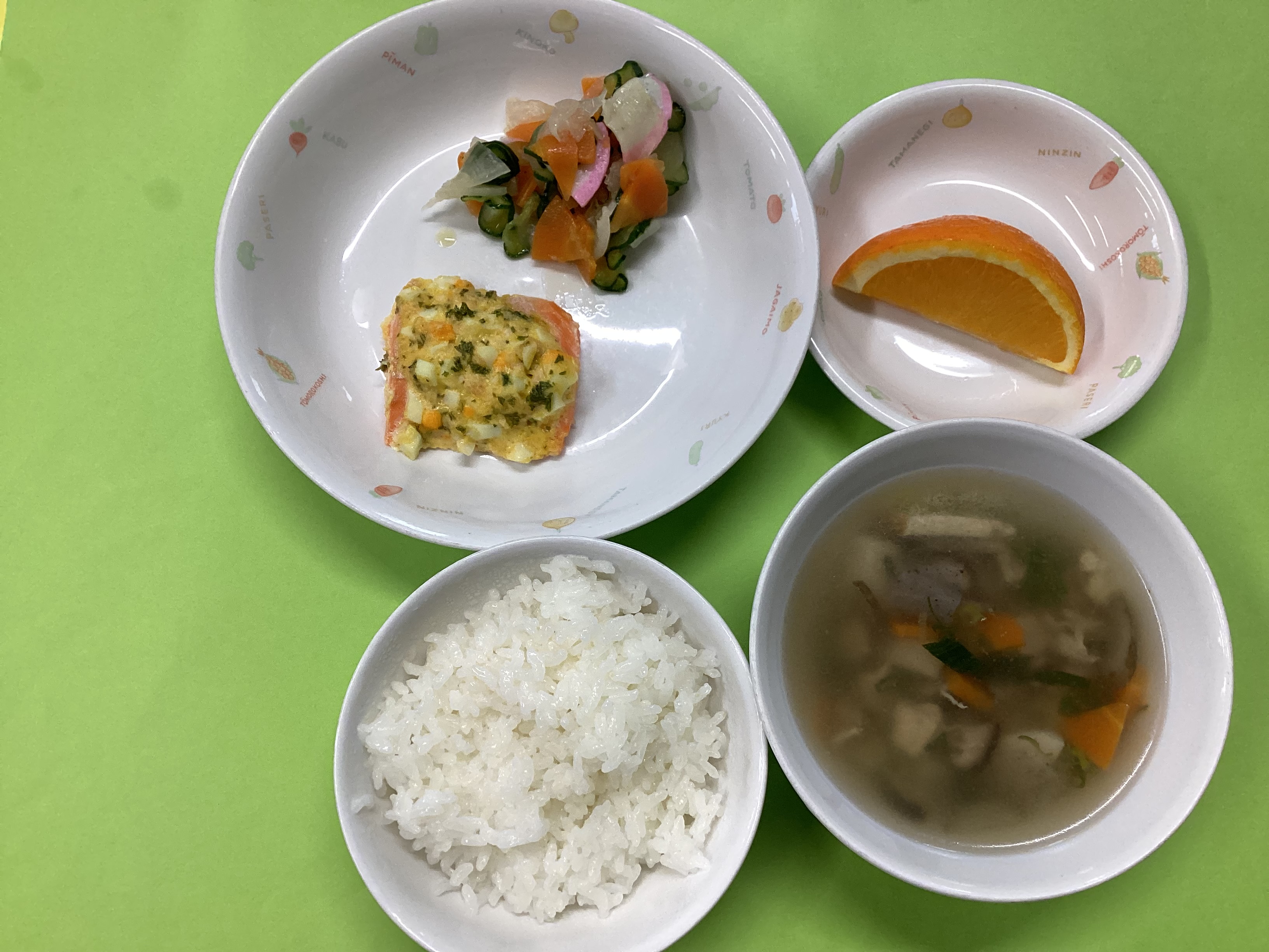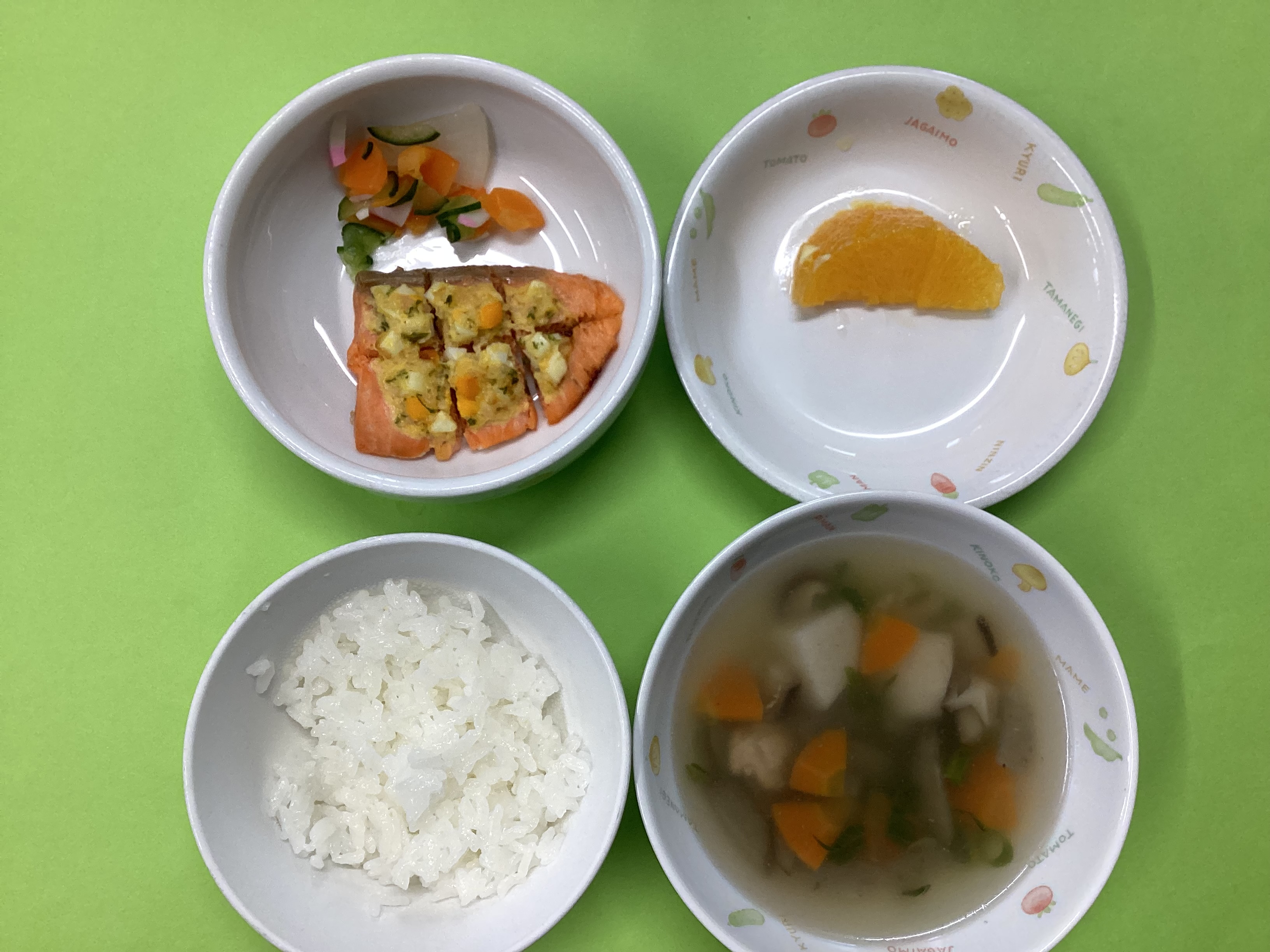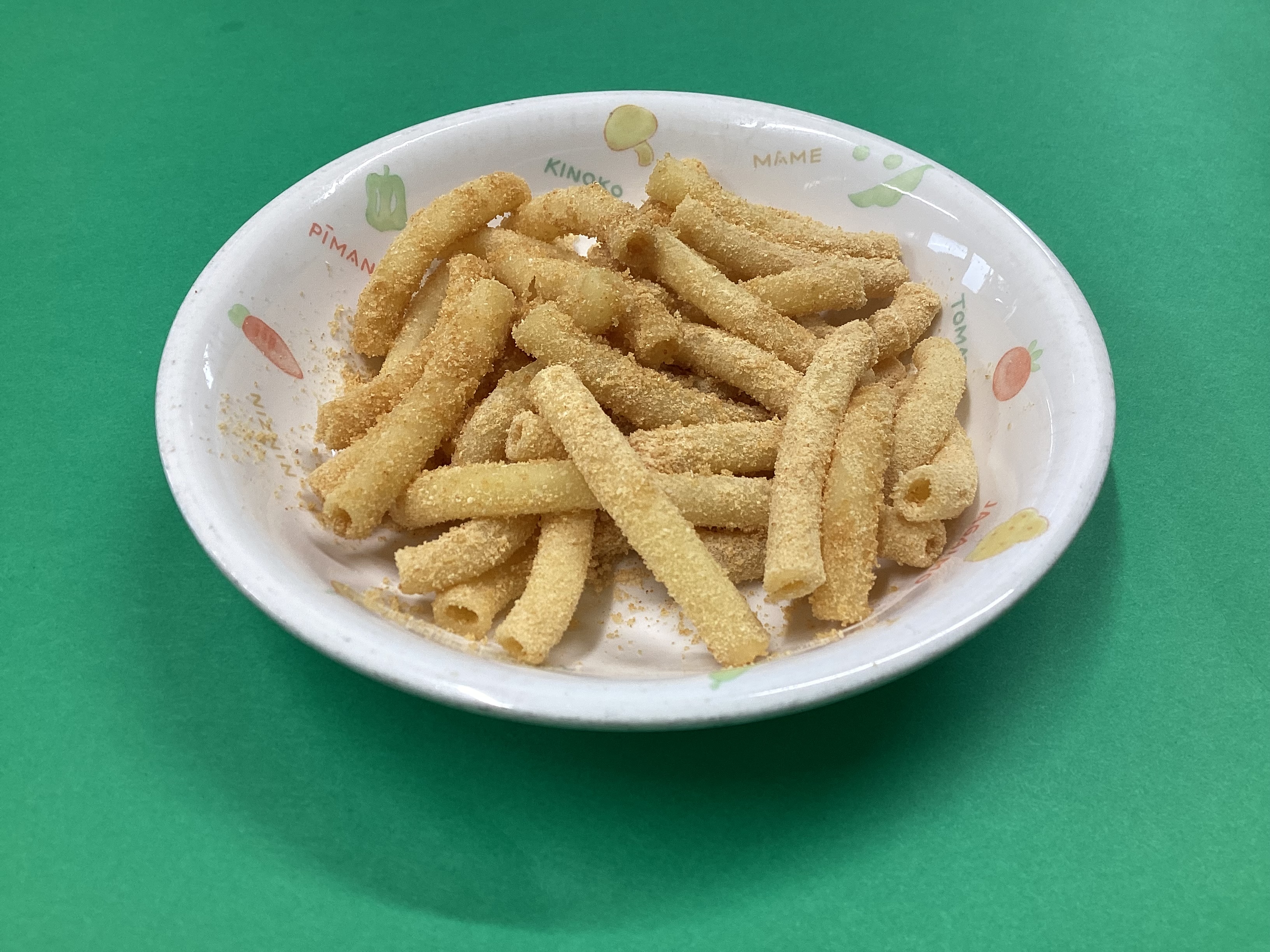 令和8年4月9日のお給食♪ 2026年 4月 13日 Mon 管理者 ~昼食~ ・ごはん ・鮭の菜種焼き ・大根ナムル ・のっぺい汁 ・オレンジ (幼児) (未満児) ~おやつ~ ・マカロニきな粉 ・スキムミルク その名のとおりマカロニにきな粉をまぶした簡単おやつ!
