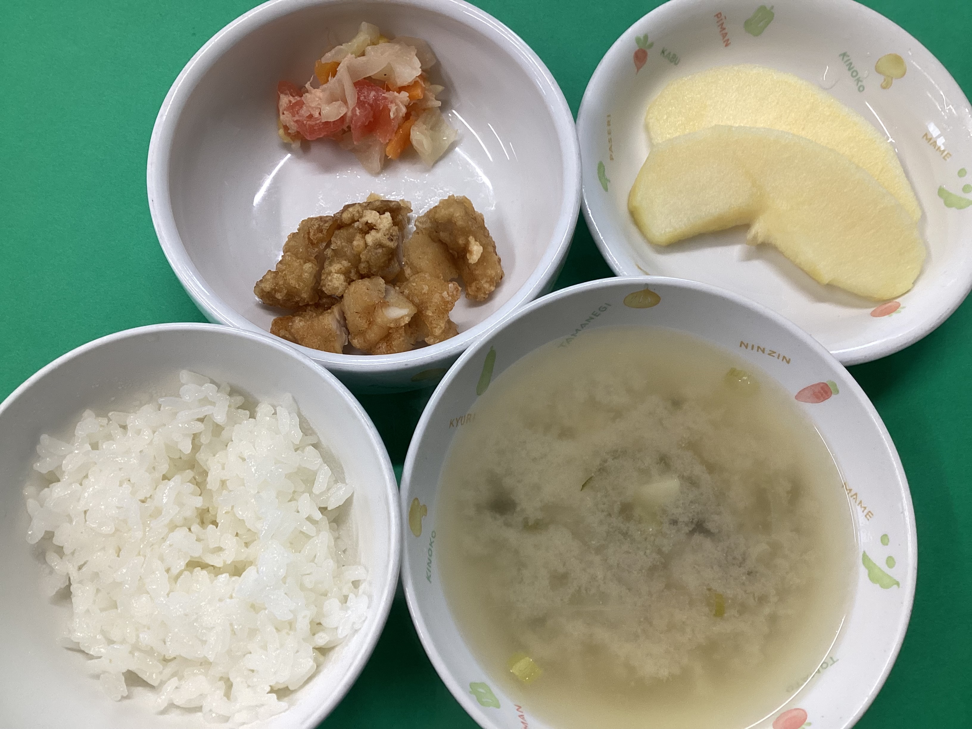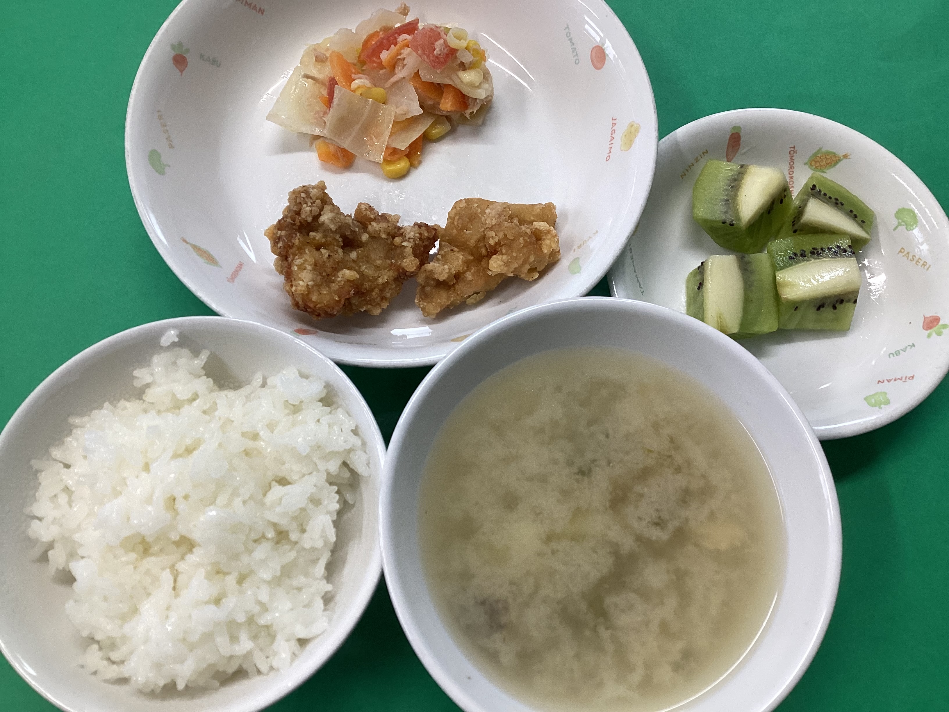 令和8年4月10日のお給食♪ 2026年 4月 13日 Mon 管理者 ~昼食~ ・ごはん ・鶏のから揚げ ・カラフルサラダ ・じゃが芋の味噌汁 ・キウイフルーツ(未満児はりんご) (幼児) (未満児) ~おやつ~ (幼児) ・かえり ・炒り大豆 ・お茶 (未満児) ・麩ラスク ・お茶