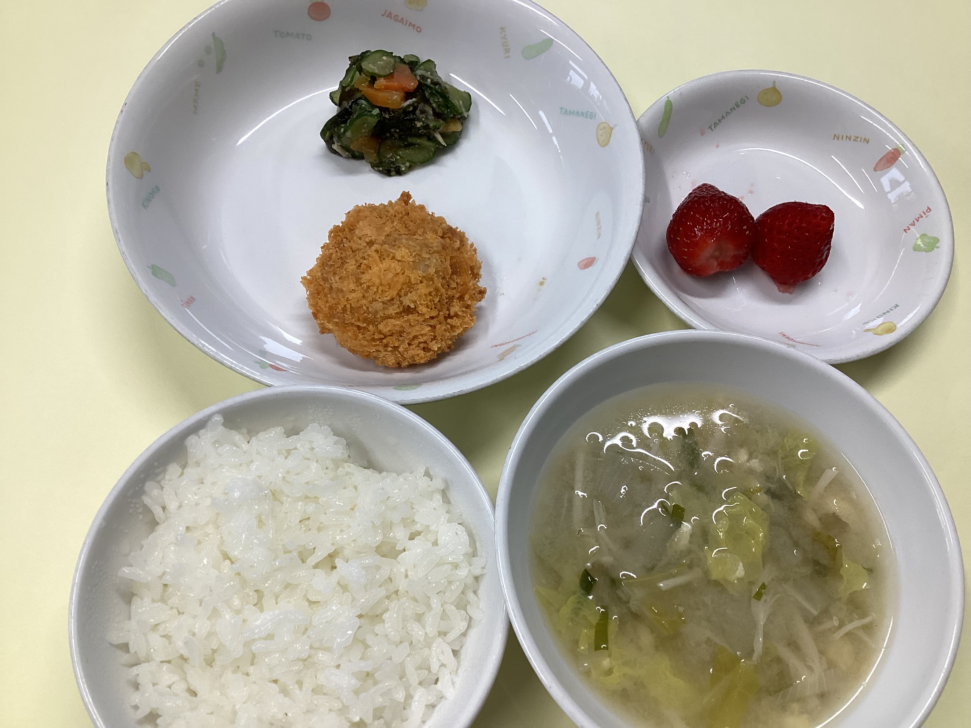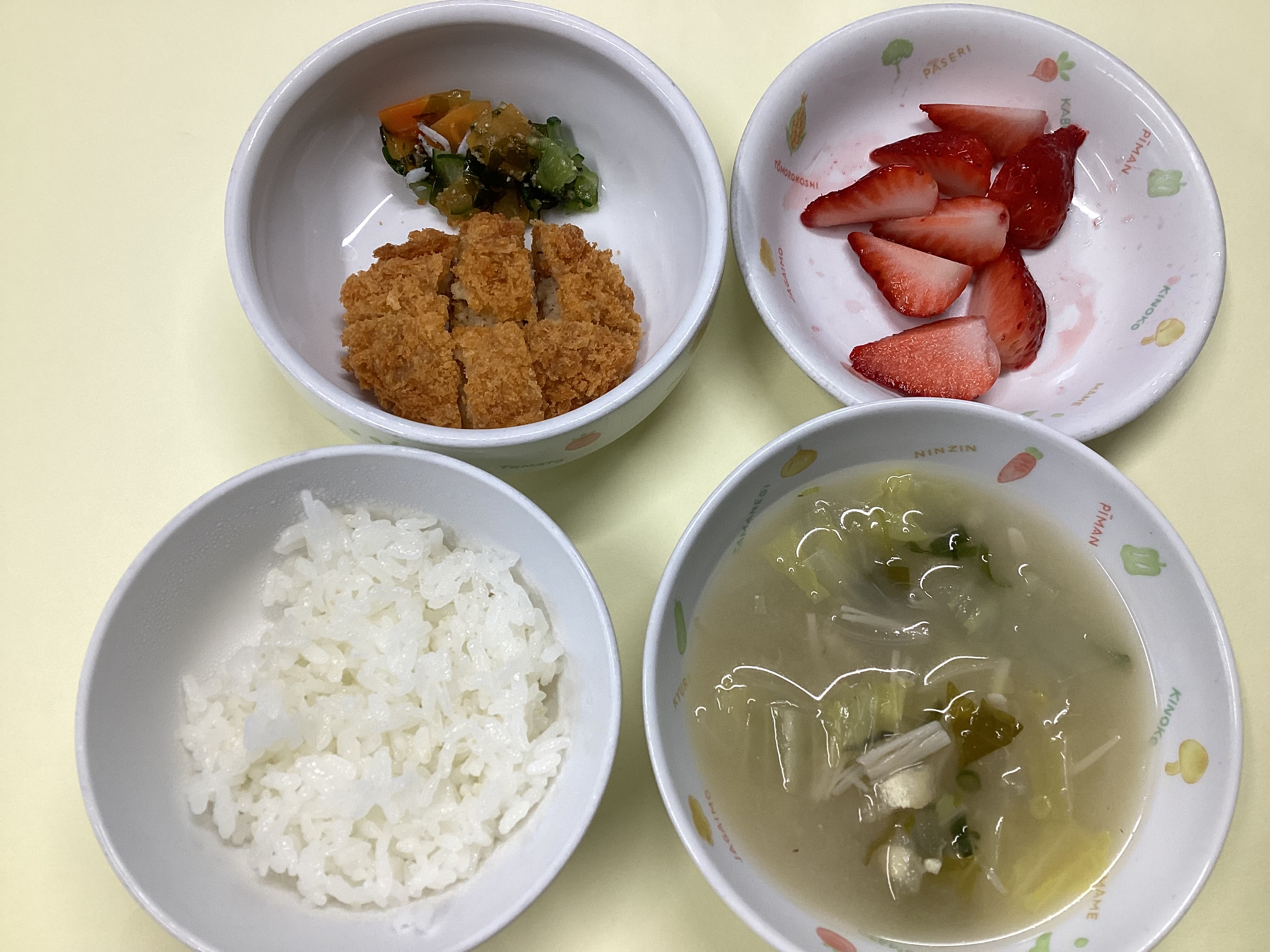 令和8年4月15日のお給食♪ 2026年 4月 16日 Thu 管理者 ~昼食~ ・ごはん ・ツナマヨフライ ・きゅうりとわかめの酢の物 ・白菜の味噌汁 ・いちご (幼児) (未満児) ~おやつ~ ・さつま芋トースト(あんこトーストから変更してます) ・スキムミルク さつま芋あんをパンに塗ってトーストしてます♡