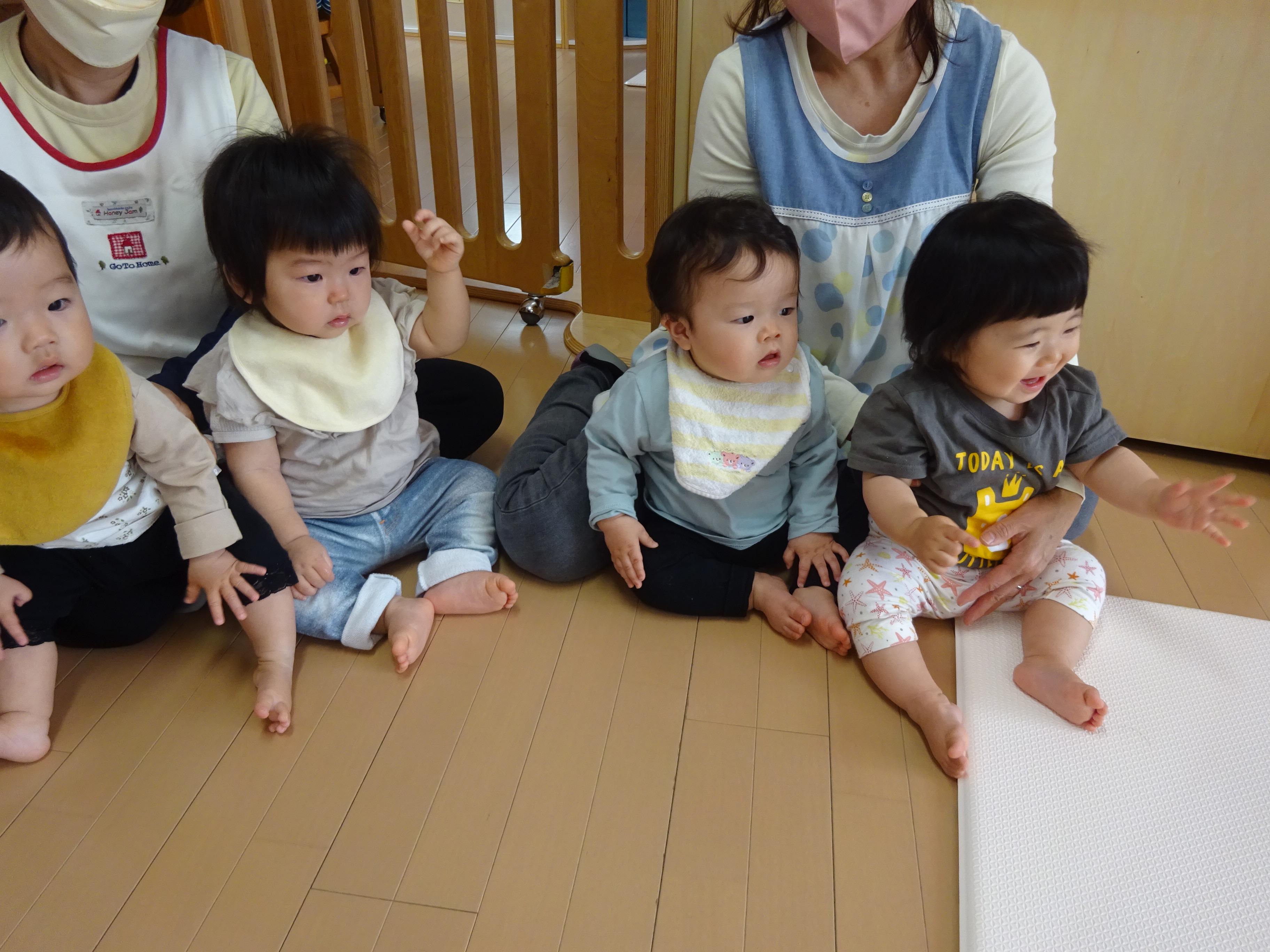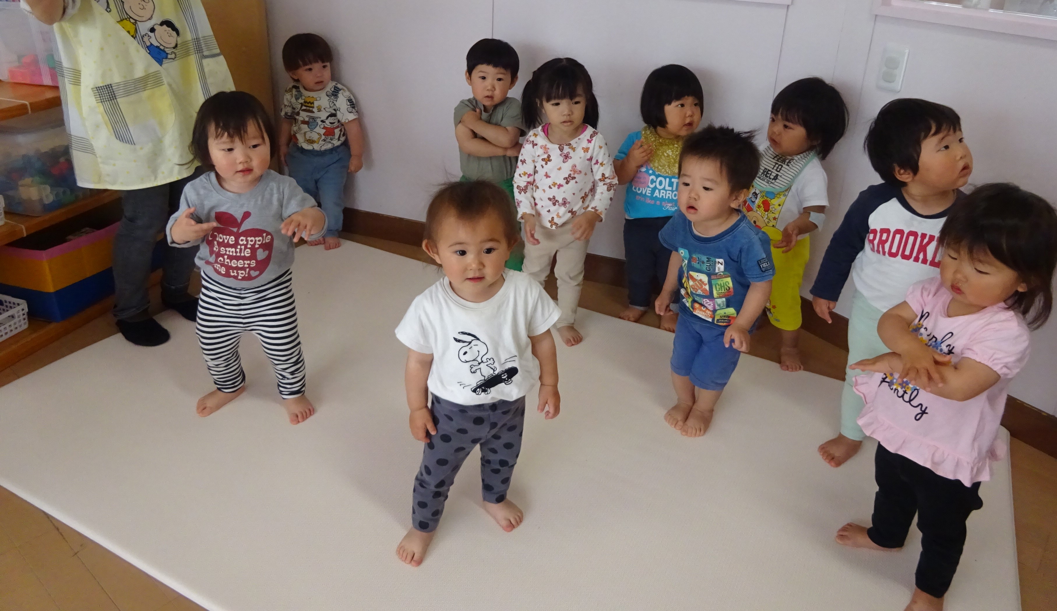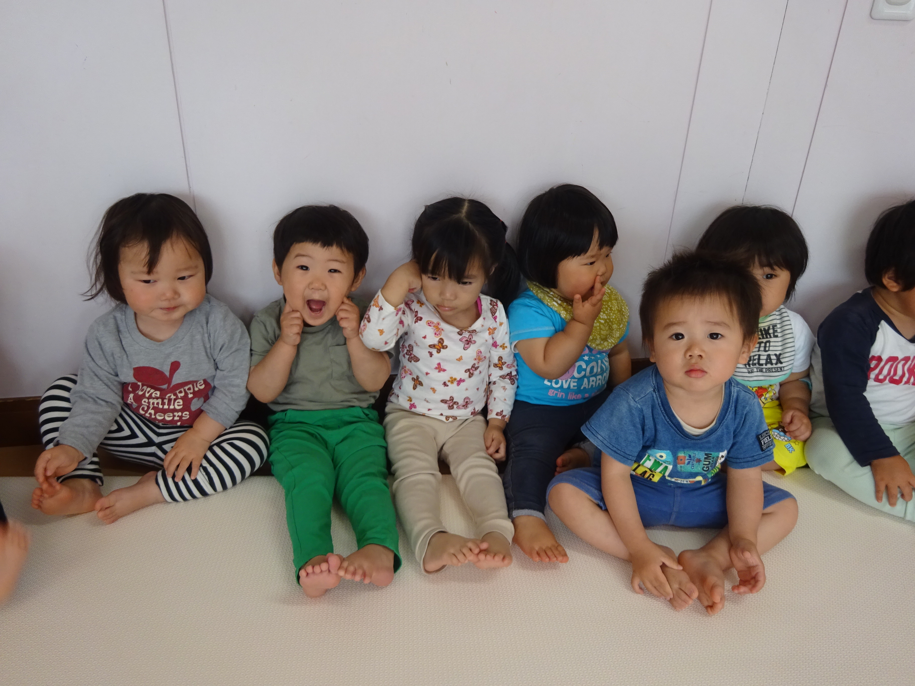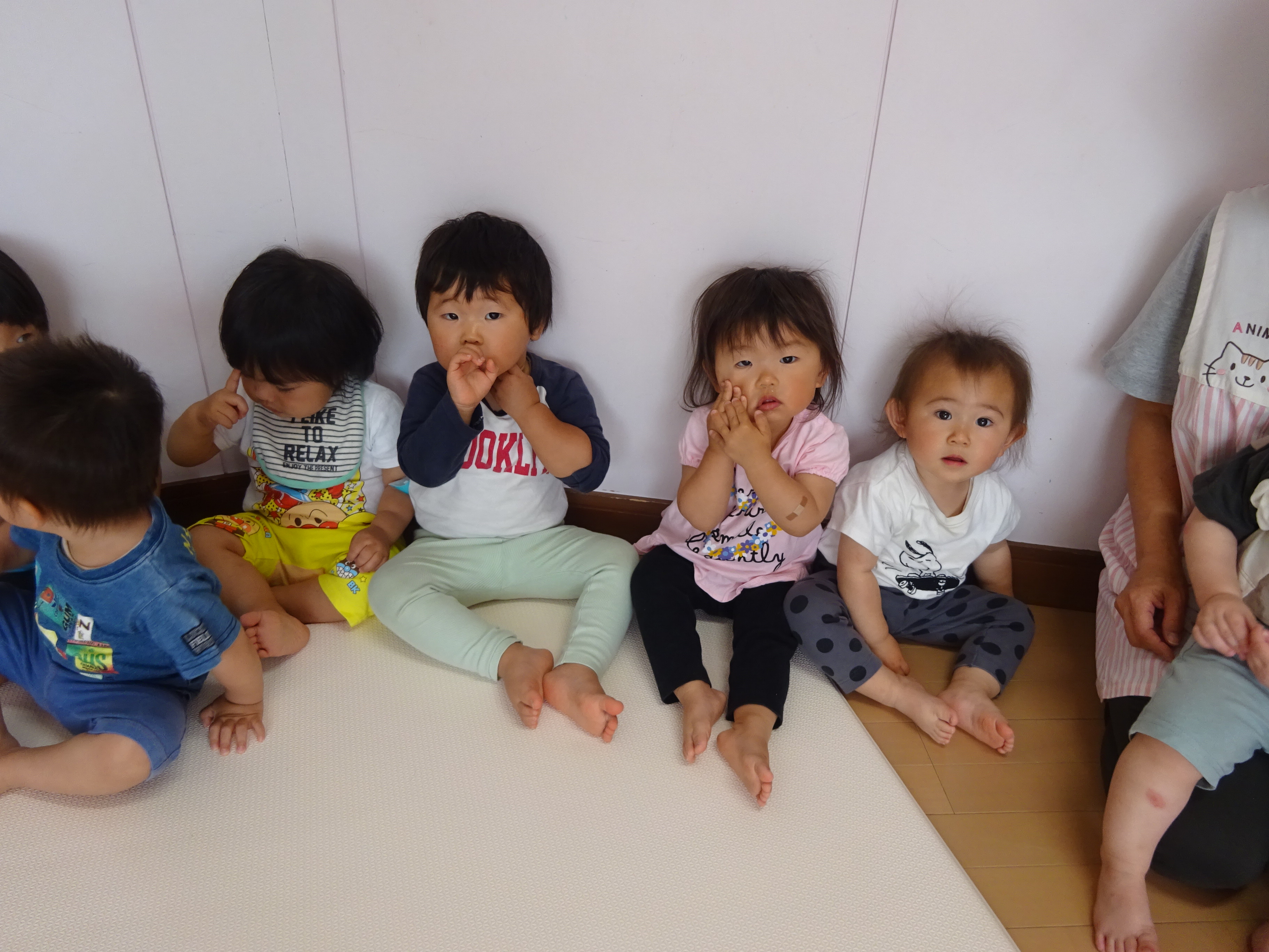 壁ぺったんで集まると、おはよう♪おはよう♪と朝の歌、朝のご挨拶、わらべうたや体操をするなど楽しんでます。