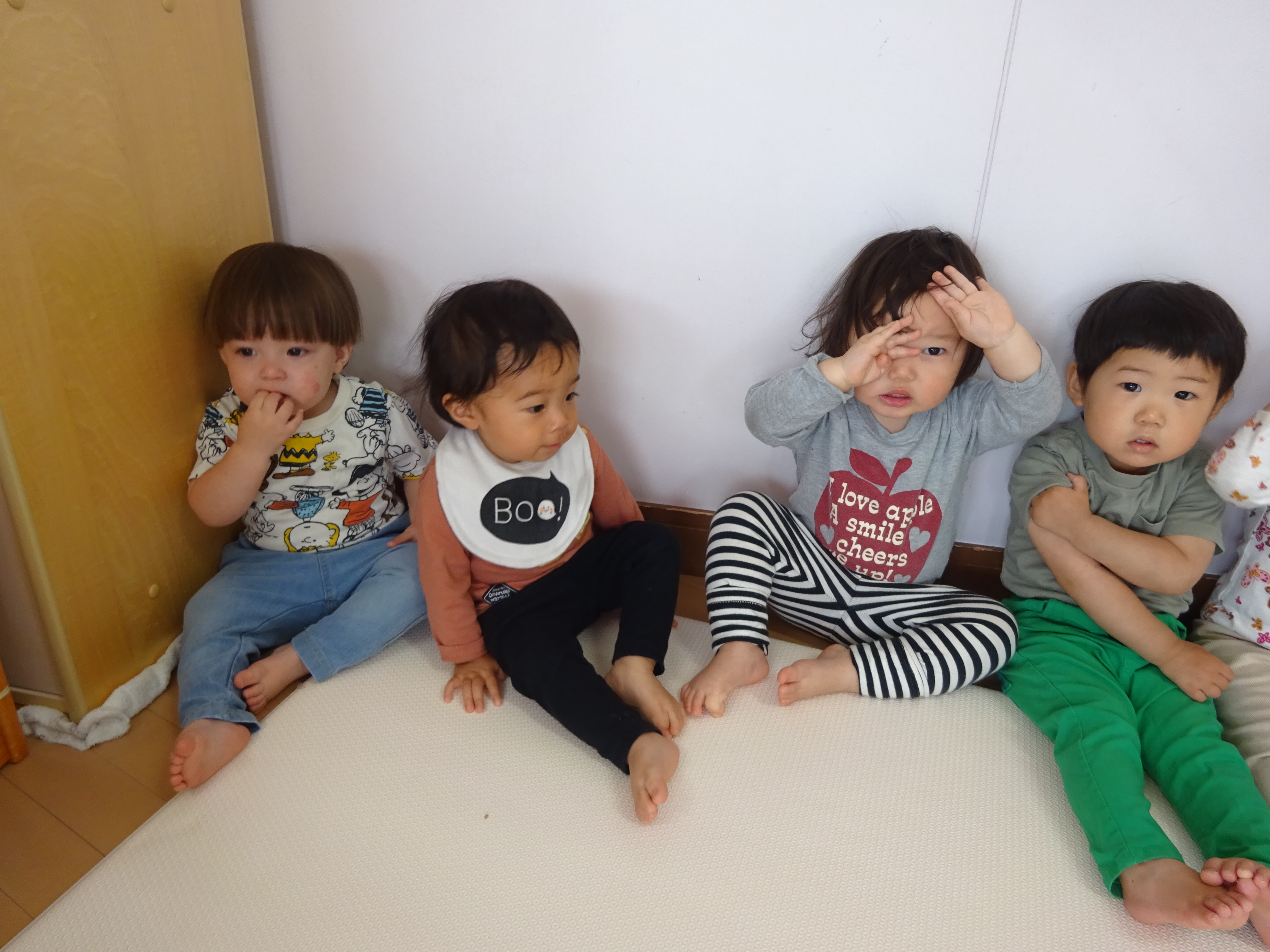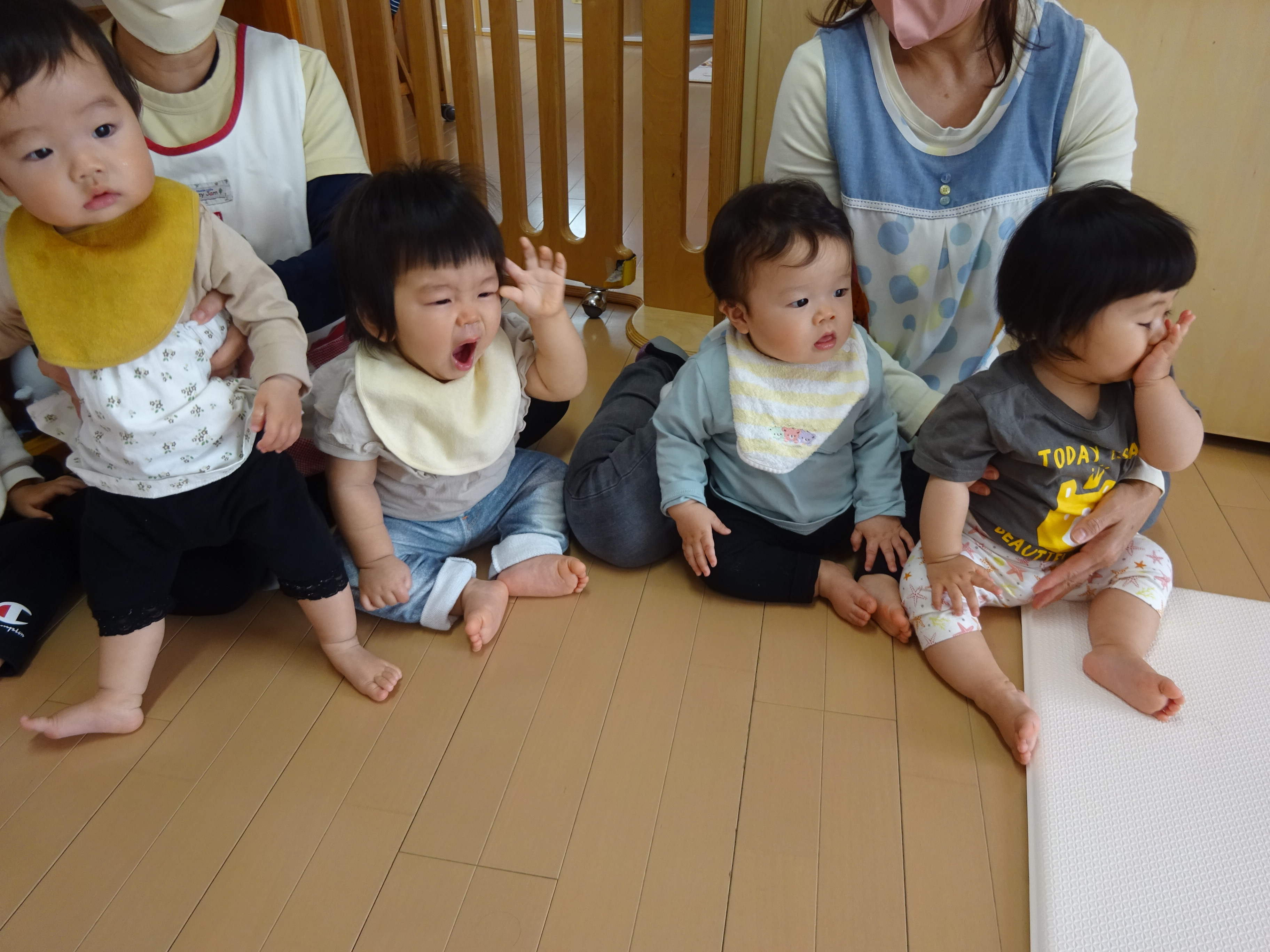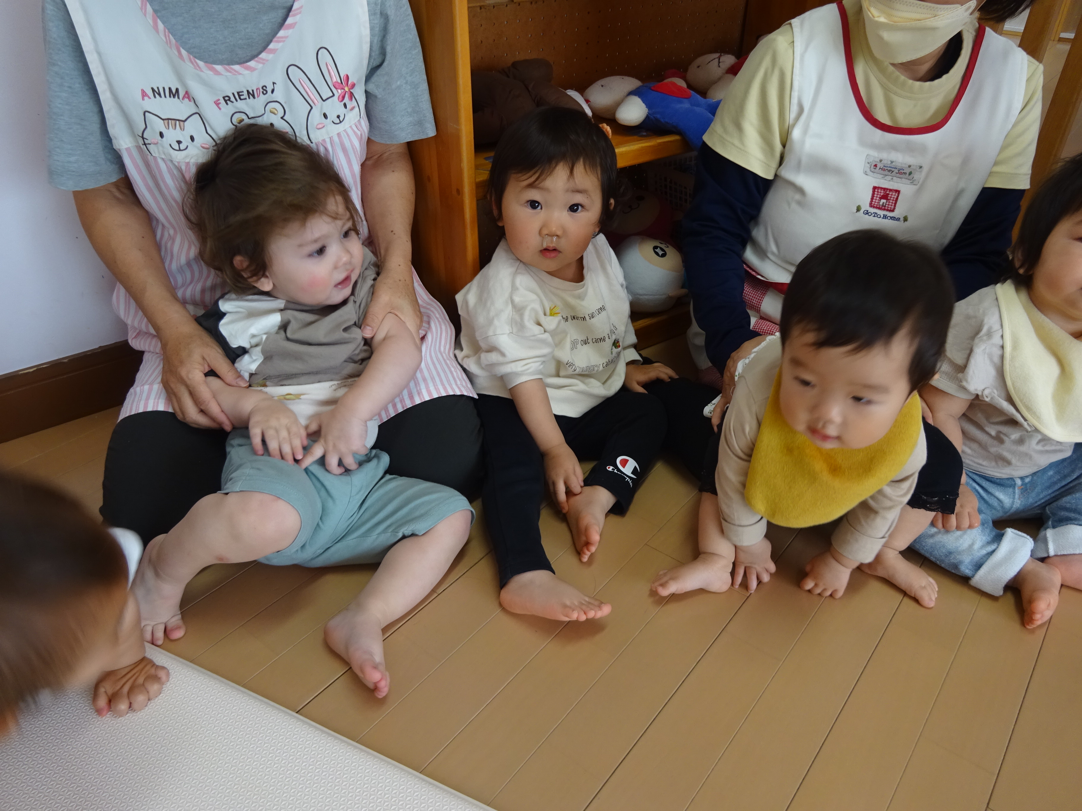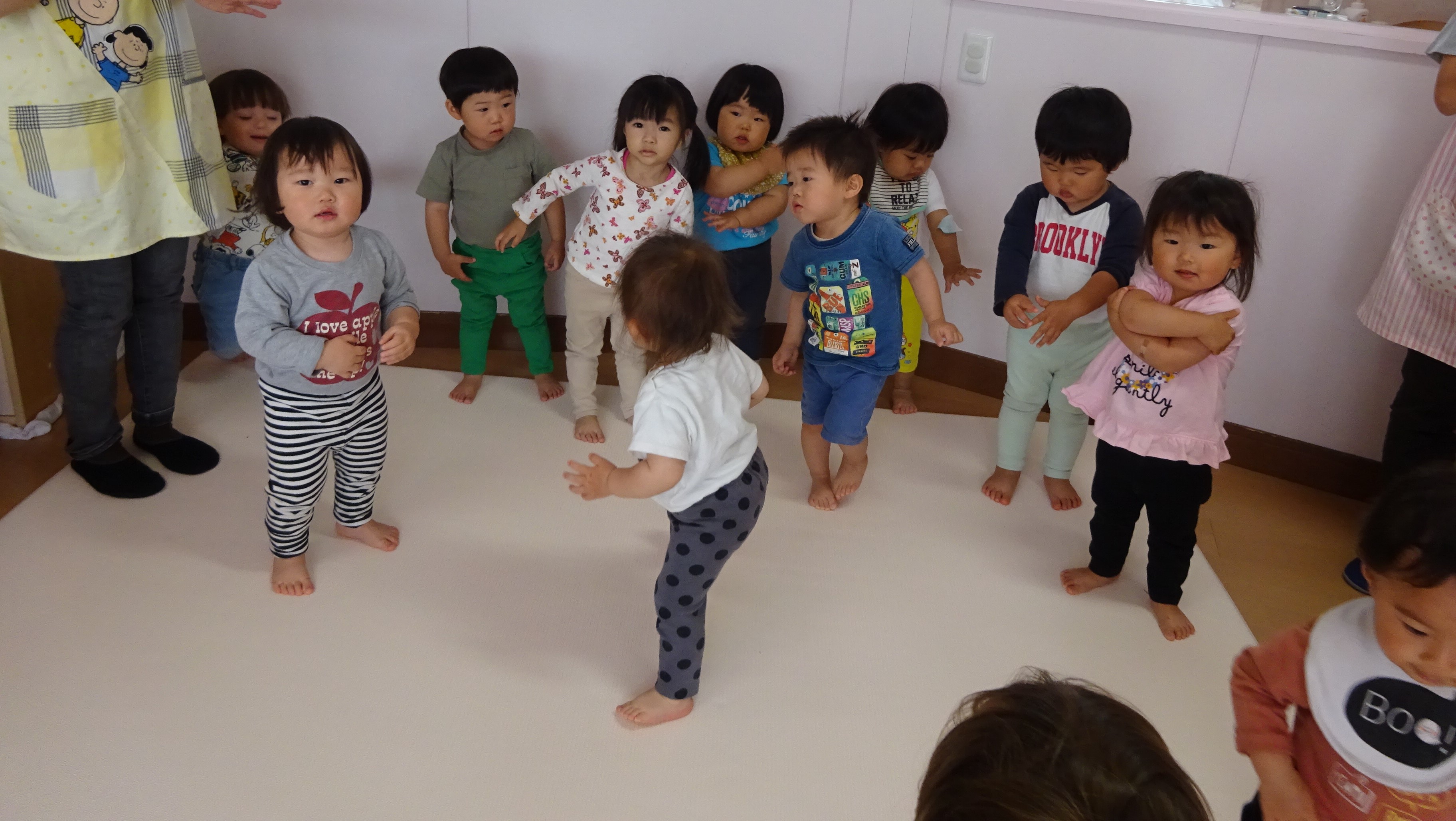 壁ぺったんで集まると、おはよう♪おはよう♪と朝の歌、朝のご挨拶、わらべうたや体操をするなど楽しんでます。