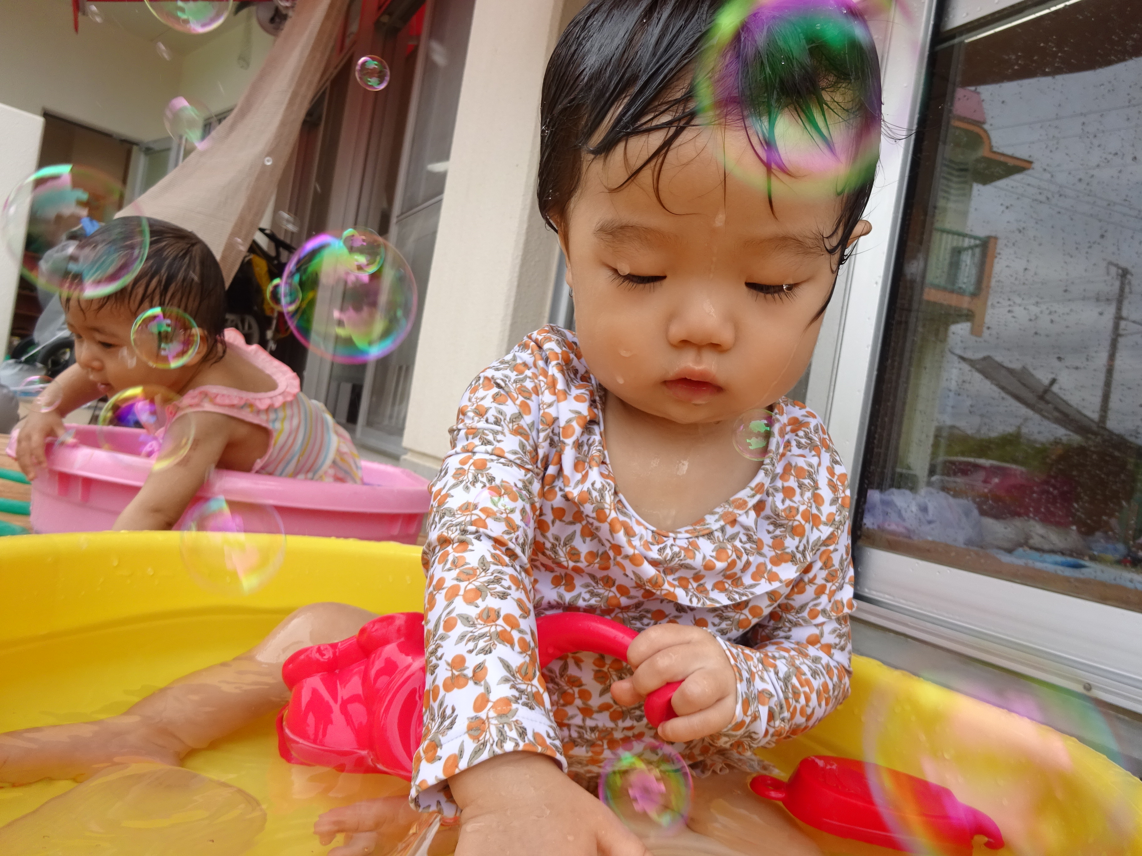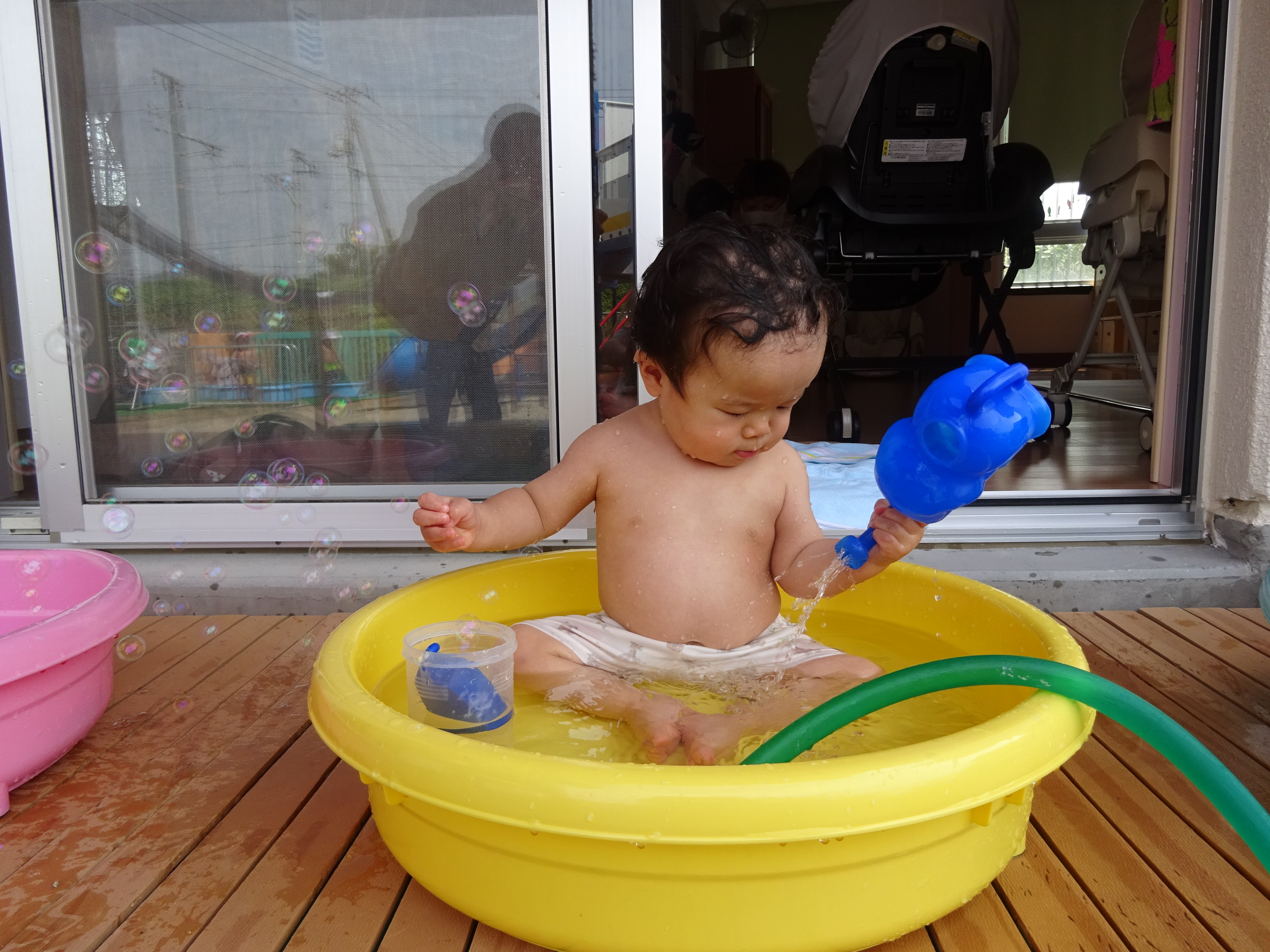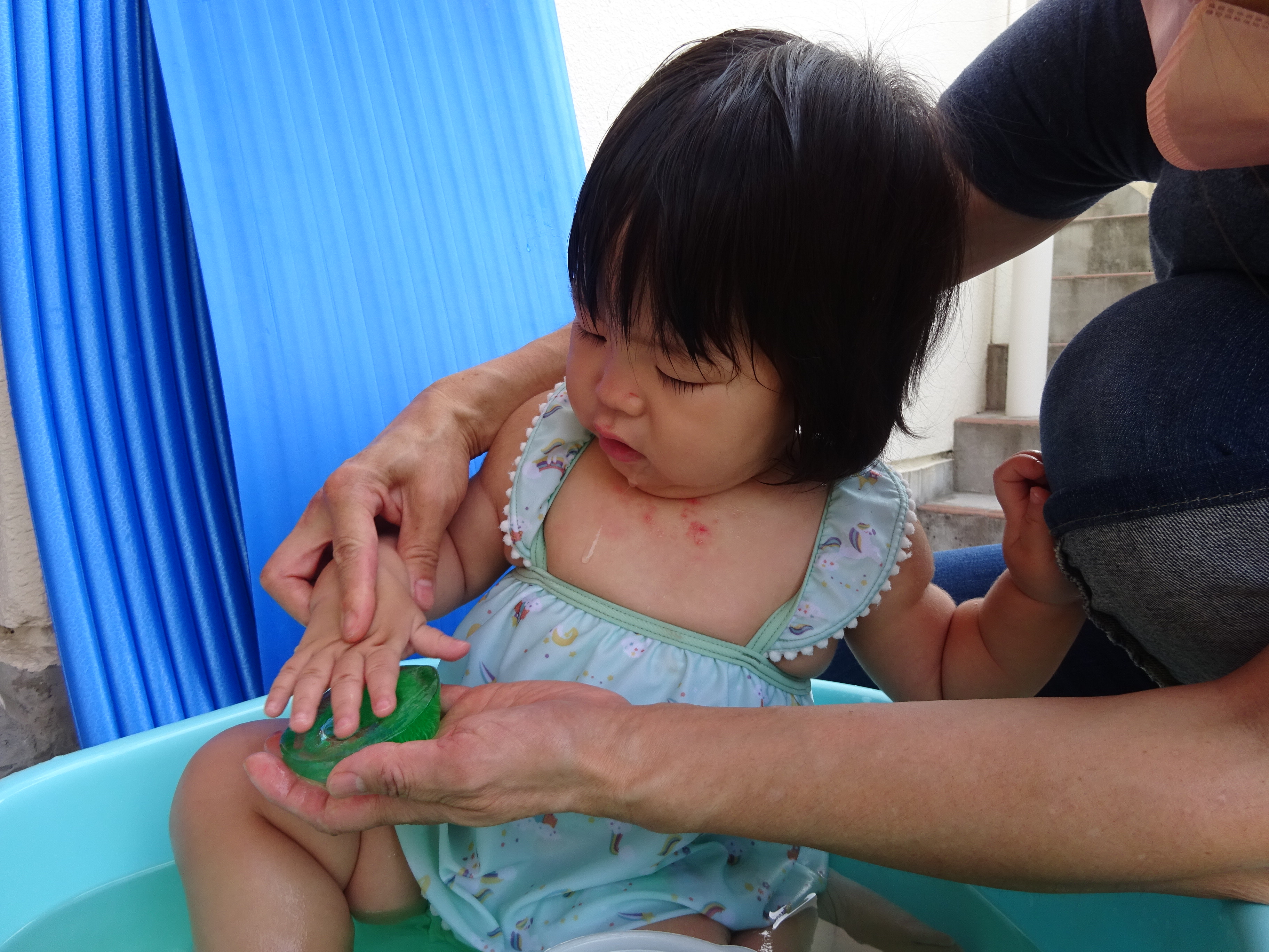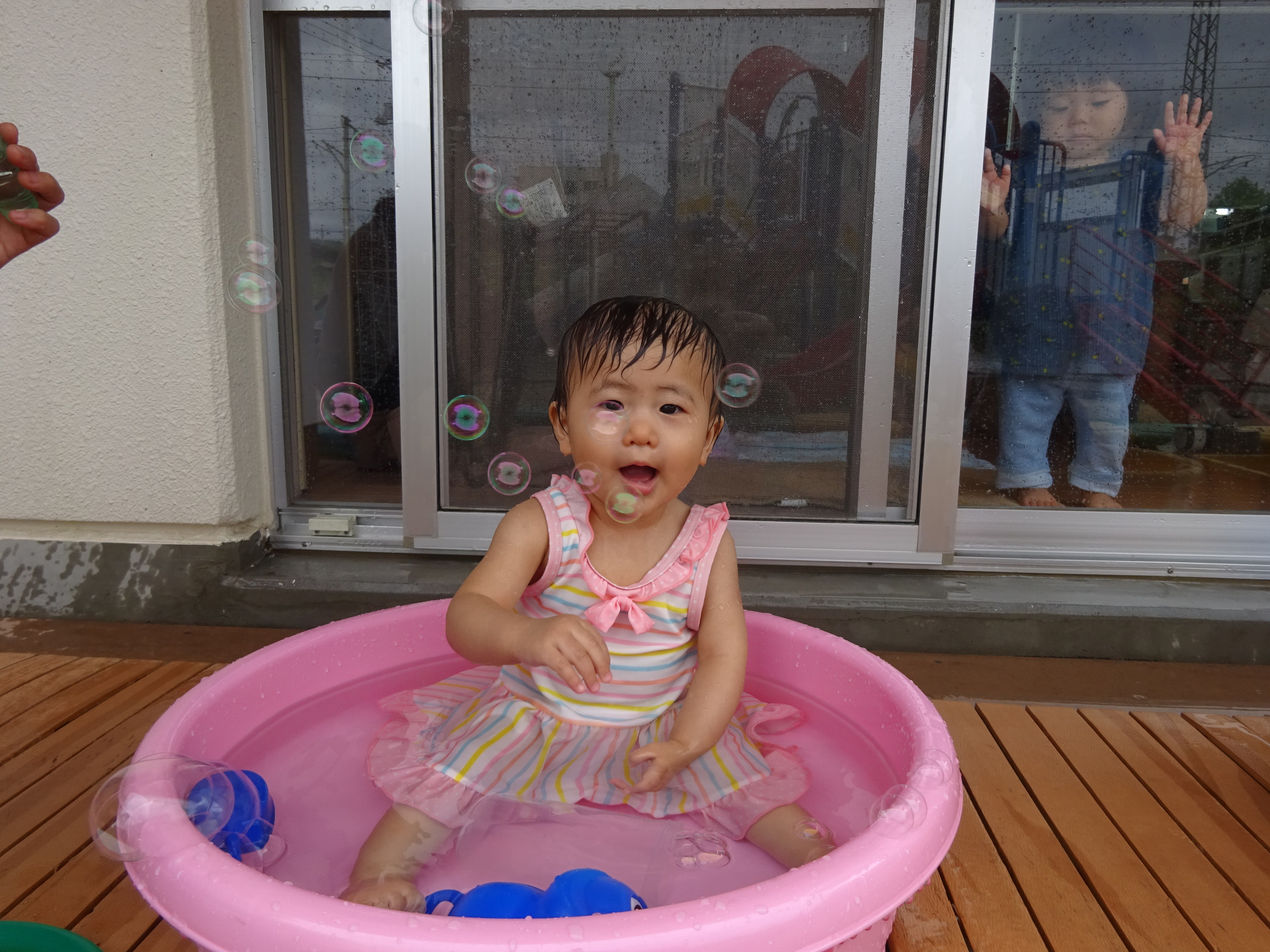 しゃぼん玉で遊んだよ 2022年 8月 24日 Wed 管理者 水遊びが大好きなたまご組0歳のみんなは ベランダで遊んでいます。 しゃぼん玉が飛んでくると じっと見たり、手を伸ばして取ろうとしたり、 水に浮かんだしゃぼん玉を触ろうとしますが 消えてしまいます。 氷遊びもしました。氷を手のひらに乗せると 直ぐに落とす子や なでなでする子など いろいろな表情を見せています。 楽しい水遊びでした。 バナナ 前の記事 次の記事