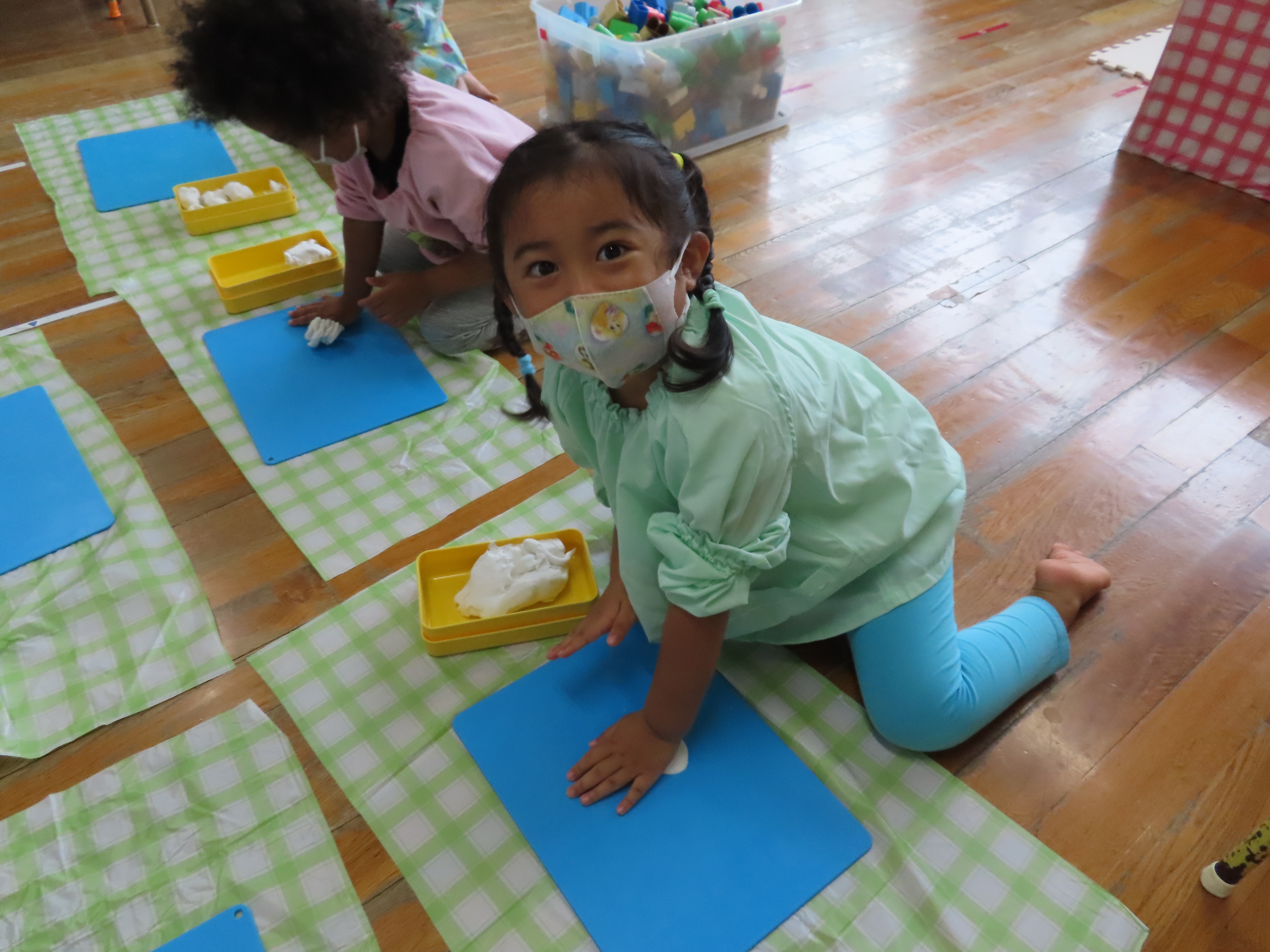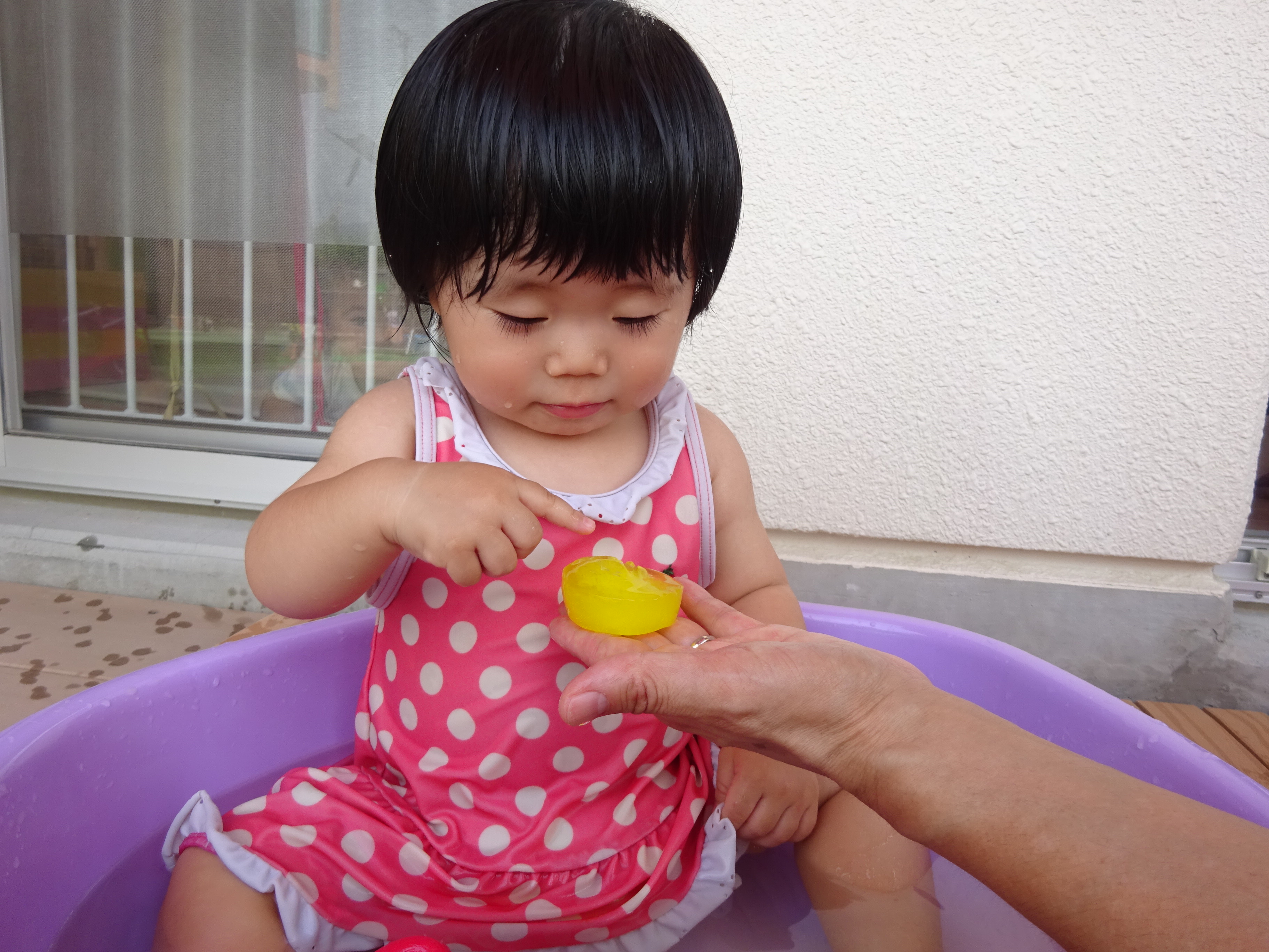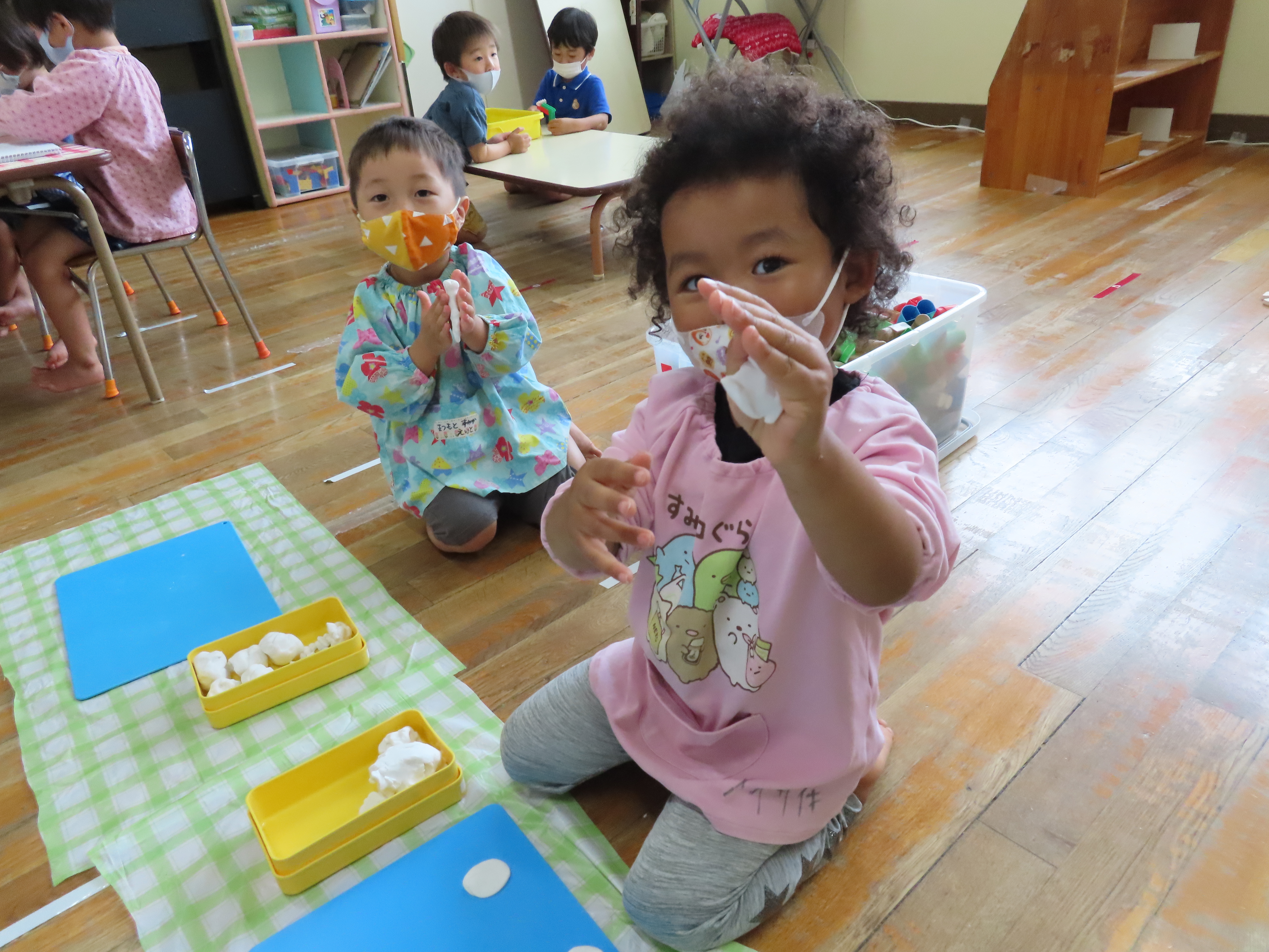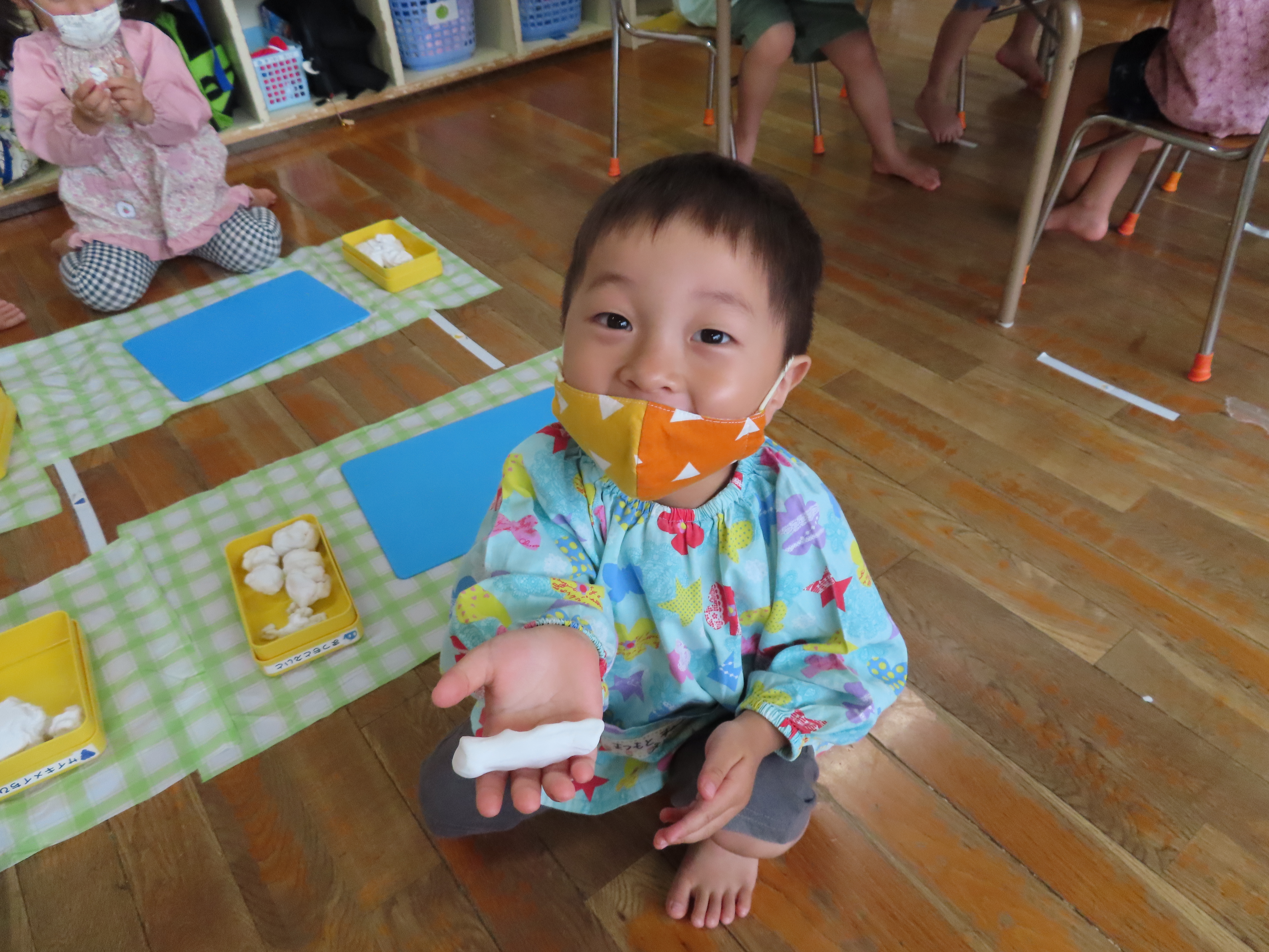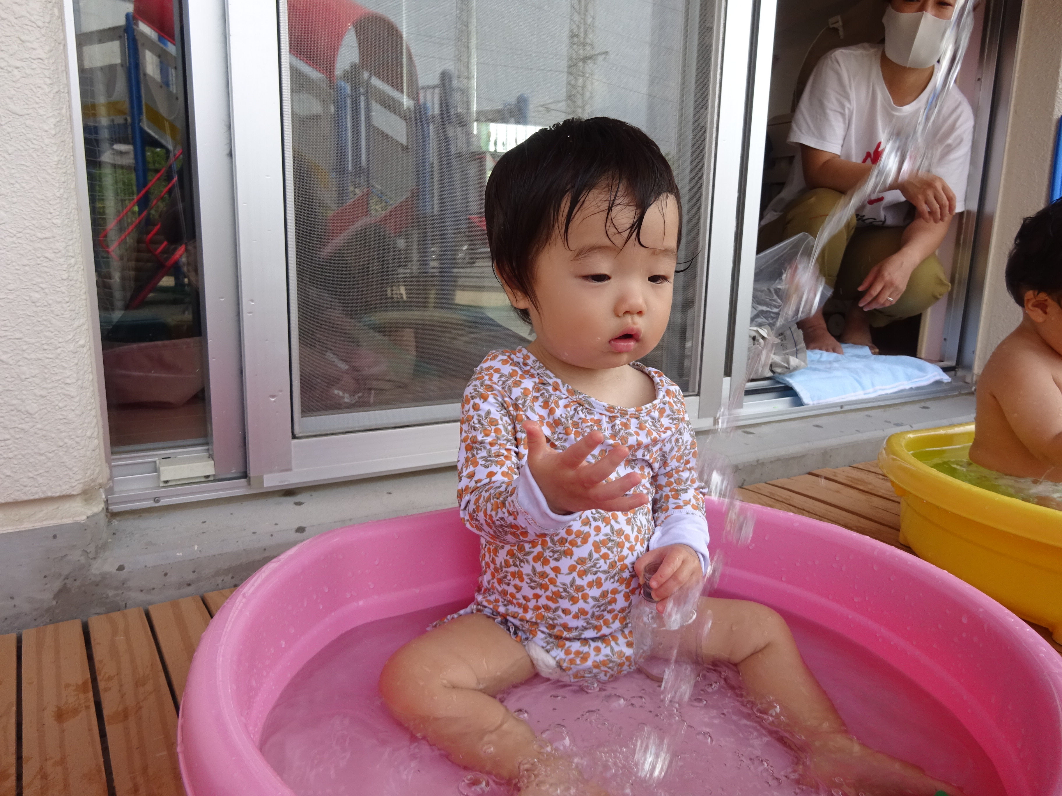 しゃぼん玉で遊んだよ 2022年 8月 24日 Wed 管理者 水遊びが大好きなたまご組0歳のみんなは ベランダで遊んでいます。 しゃぼん玉が飛んでくると じっと見たり、手を伸ばして取ろうとしたり、 水に浮かんだしゃぼん玉を触ろうとしますが 消えてしまいます。 氷遊びもしました。氷を手のひらに乗せると 直ぐに落とす子や なでなでする子など いろいろな表情を見せています。 楽しい水遊びでした。 バナナ 前の記事 次の記事