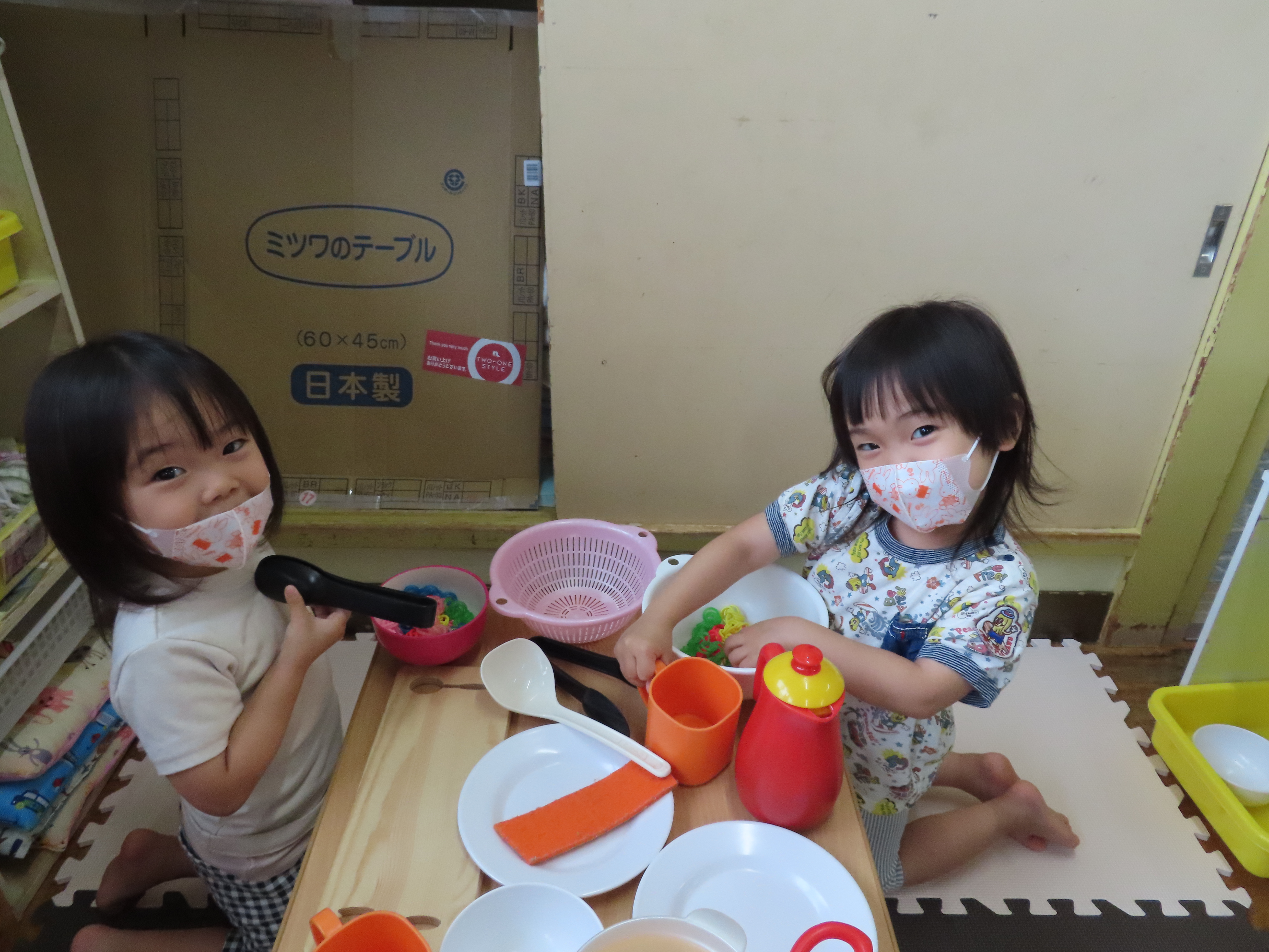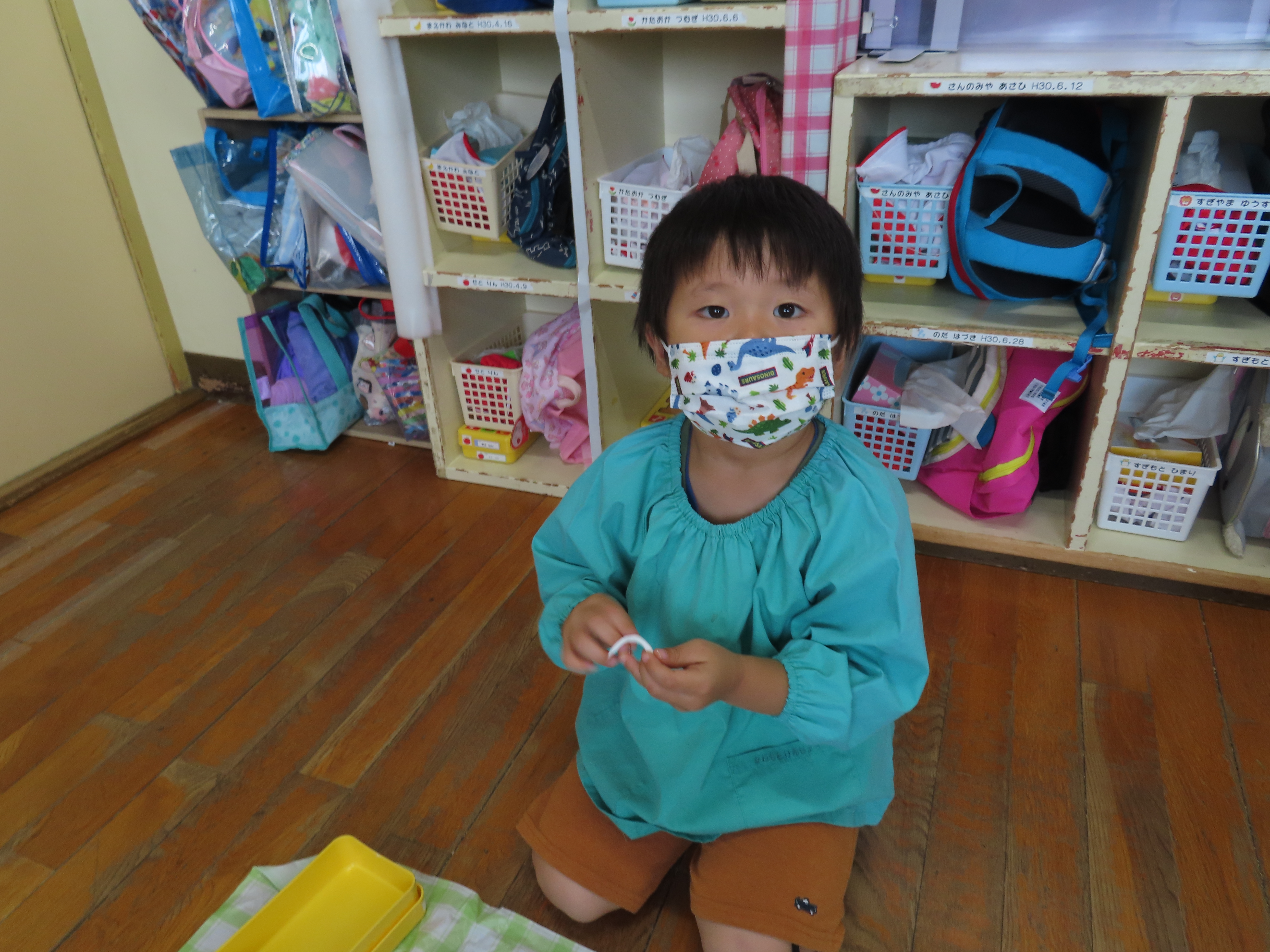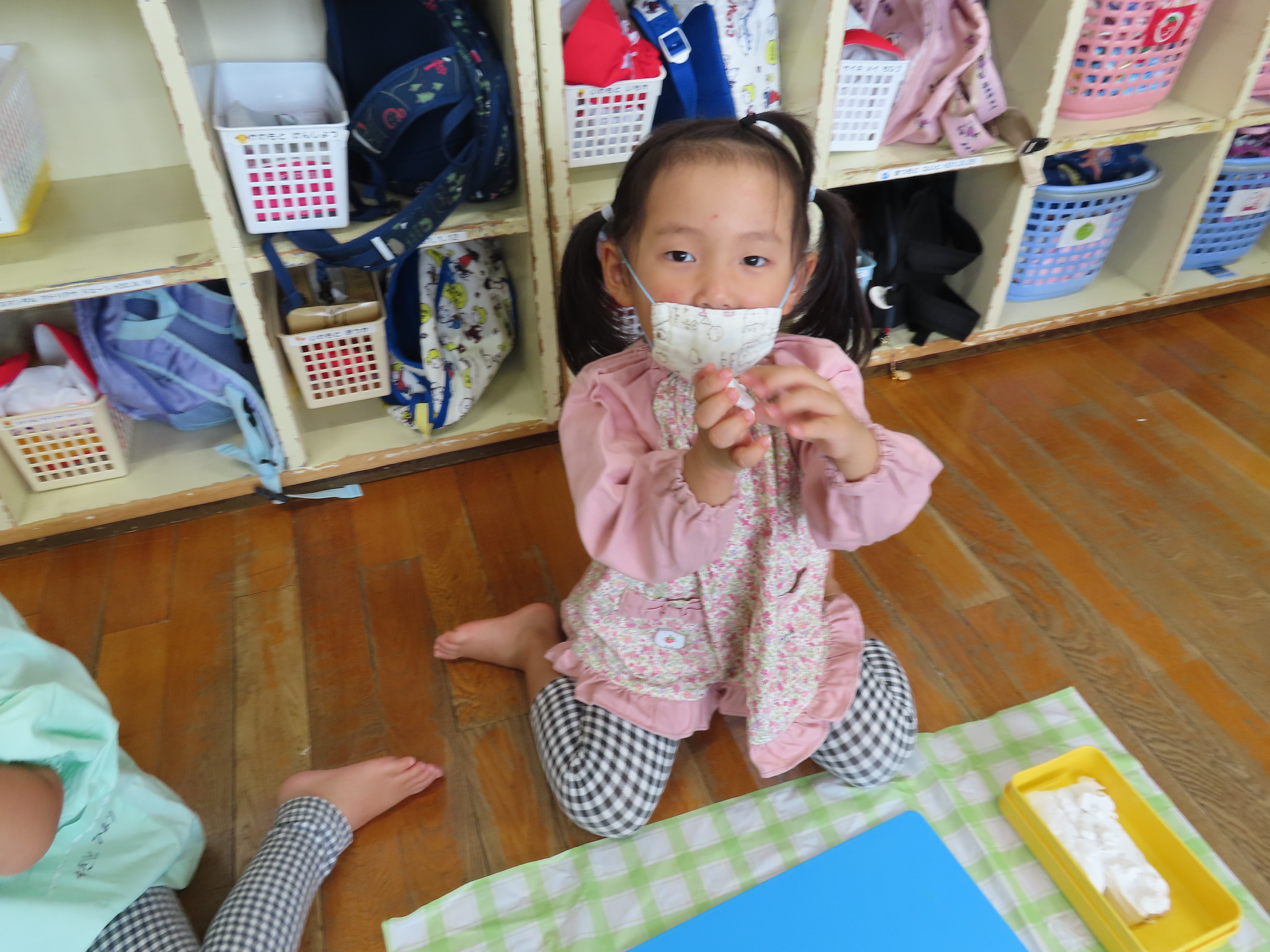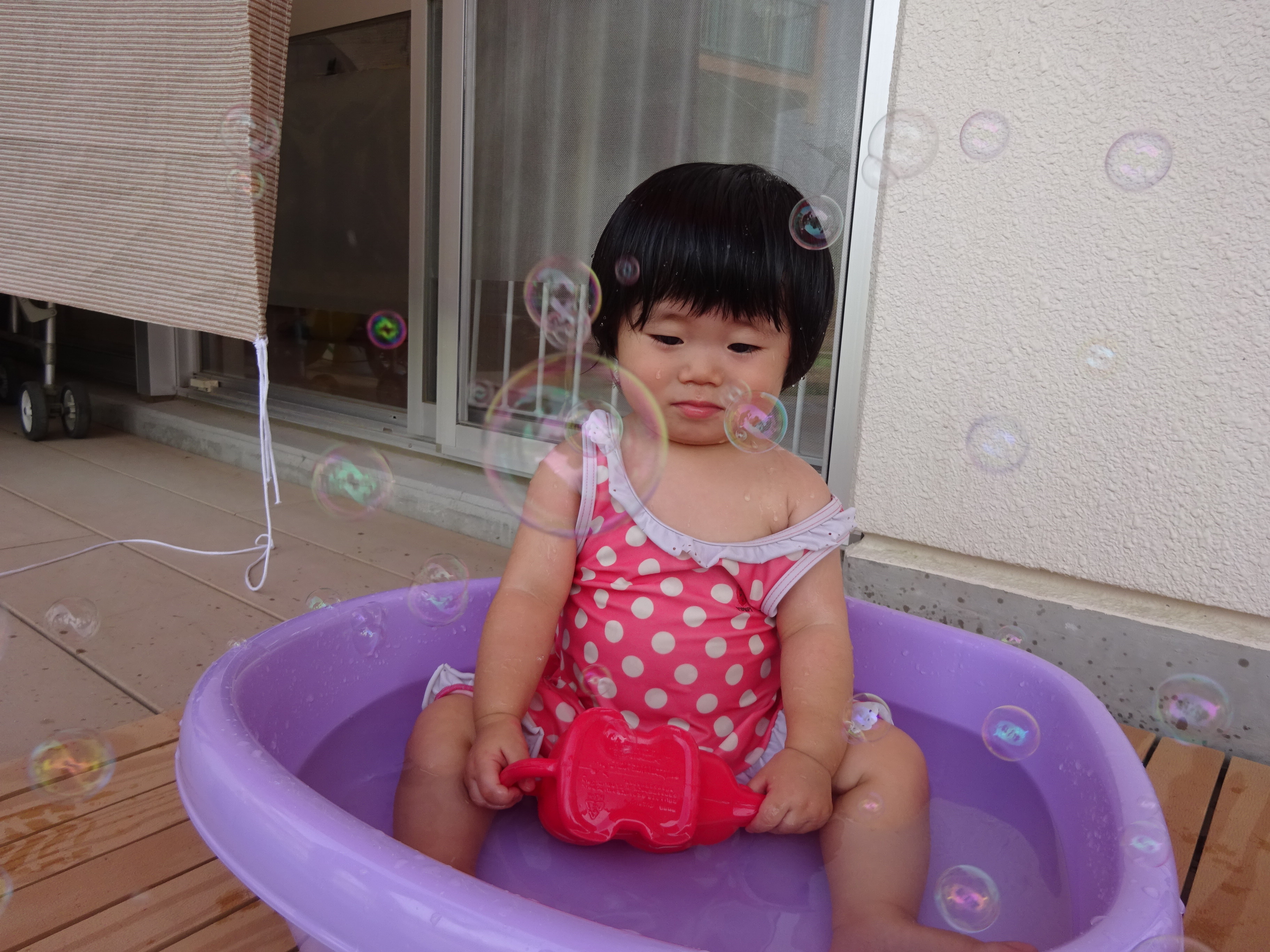 しゃぼん玉で遊んだよ 2022年 8月 24日 Wed 管理者 水遊びが大好きなたまご組0歳のみんなは ベランダで遊んでいます。 しゃぼん玉が飛んでくると じっと見たり、手を伸ばして取ろうとしたり、 水に浮かんだしゃぼん玉を触ろうとしますが 消えてしまいます。 氷遊びもしました。氷を手のひらに乗せると 直ぐに落とす子や なでなでする子など いろいろな表情を見せています。 楽しい水遊びでした。 バナナ 前の記事 次の記事
