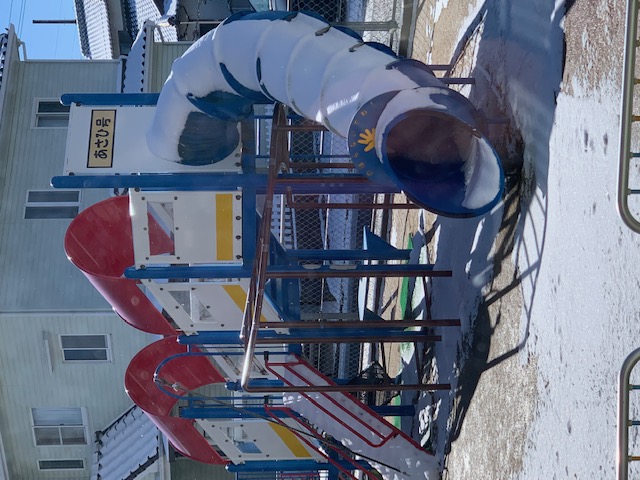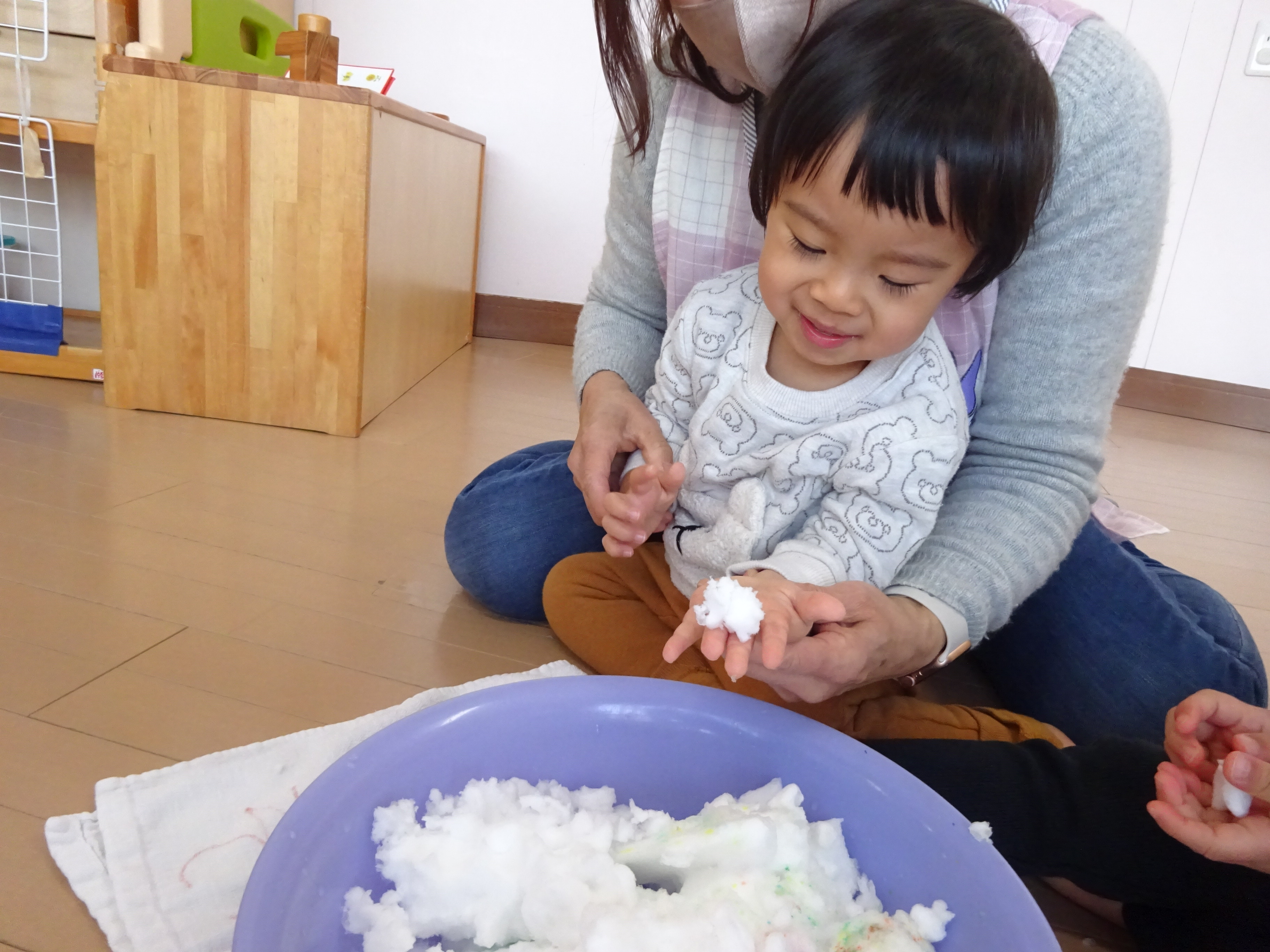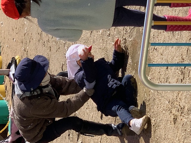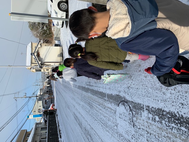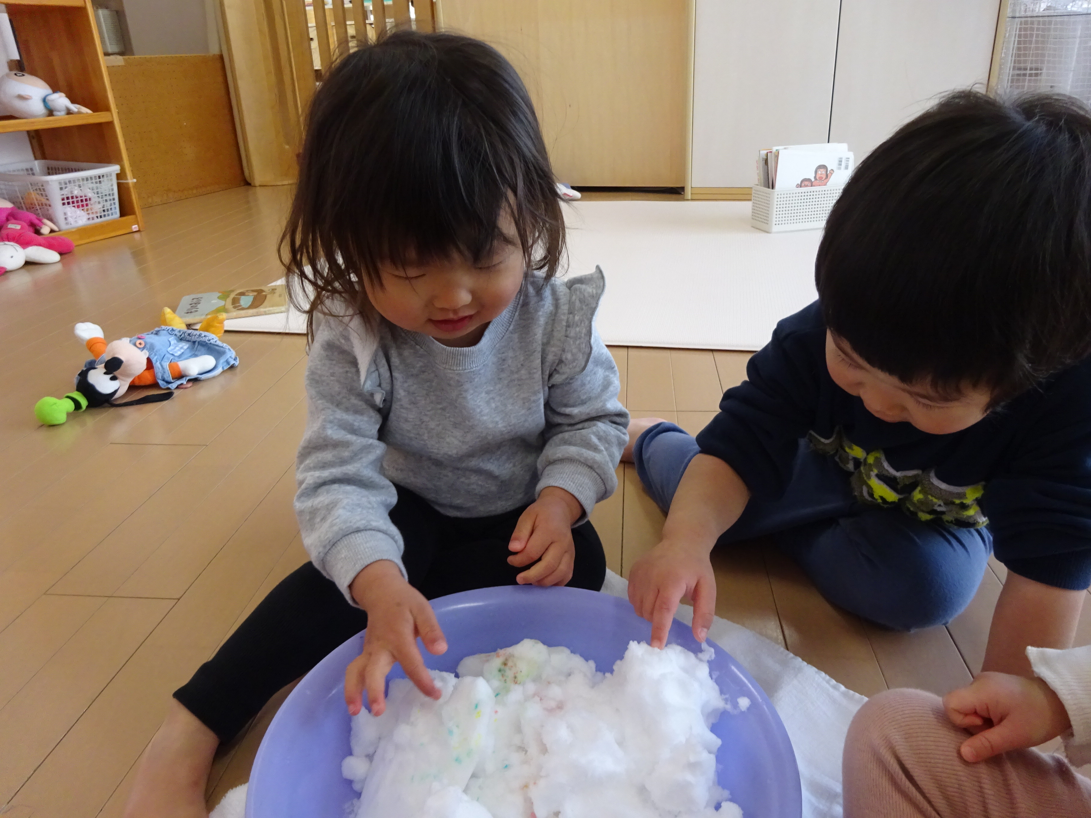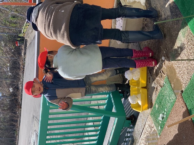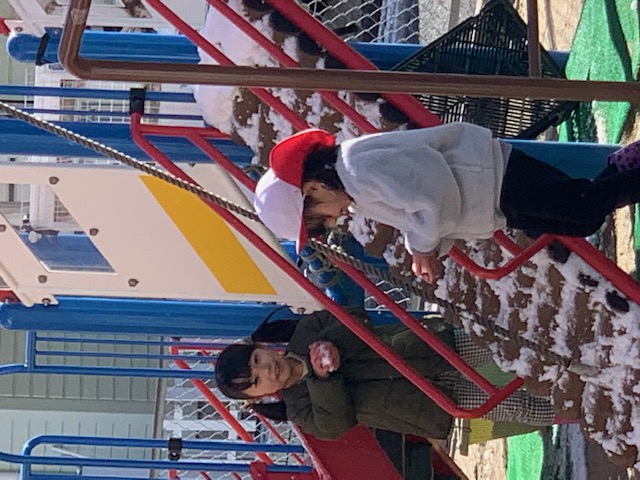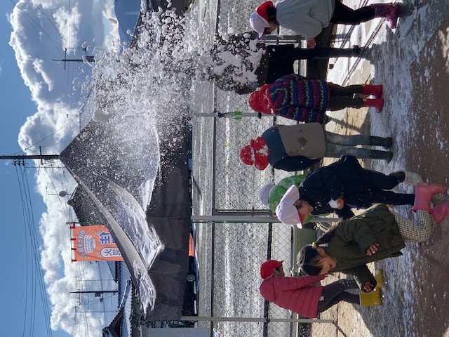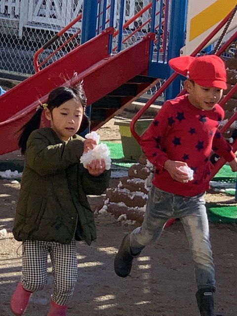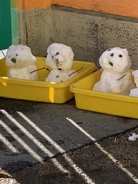 雪遊び(きりんくみ) 2023年 2月 2日 Thu 管理者 園庭の滑り台にも雪が降り積もり、さあ、はやく雪で遊びたーい。 手が冷たいのもなんのその、サラサラの雪をかきあつめるのは、きもちいーい。 雪だるまができたぞ 走り回って、なんと裸足。 雪合戦がエキサイトして、すってんころりん。あらあらビチャビチャです~。 かわいい雪だるまが並びます、翌朝まで解けずにみんなを待っていましたよ。 山椒 前の記事 次の記事