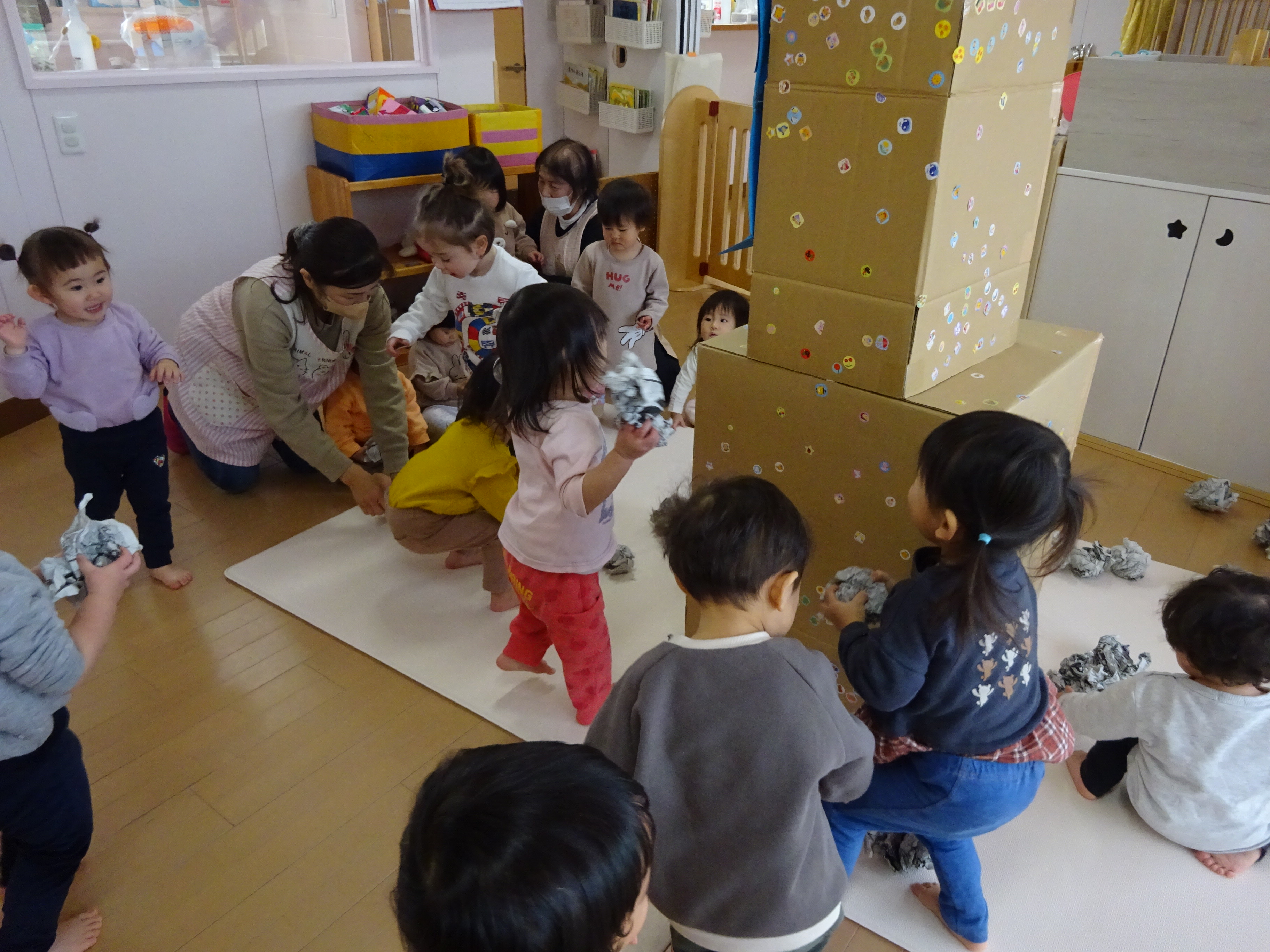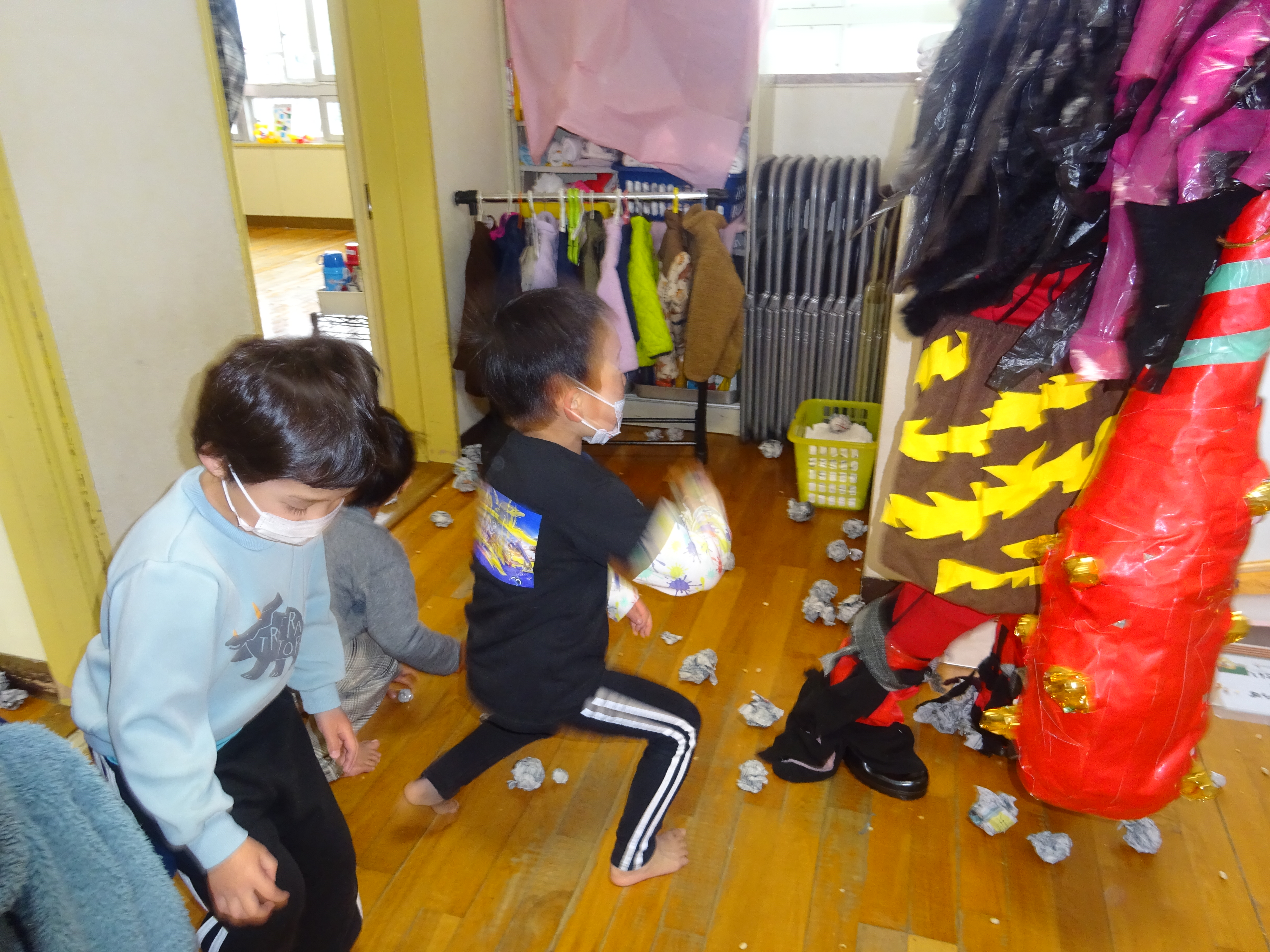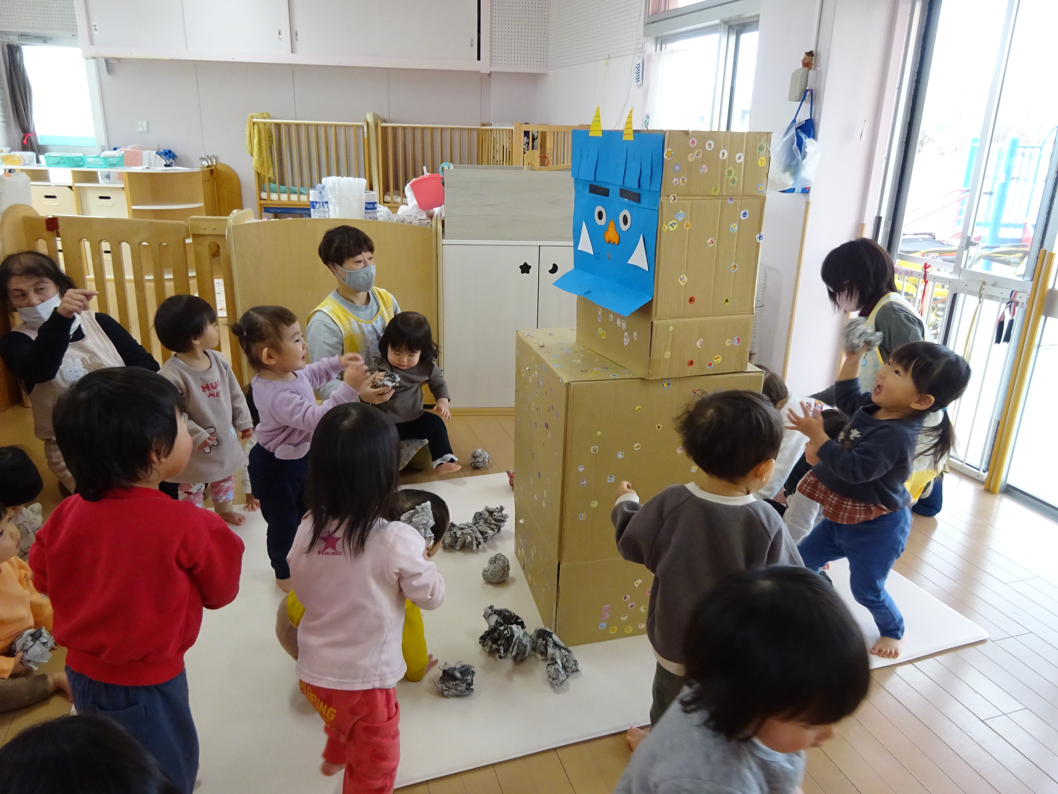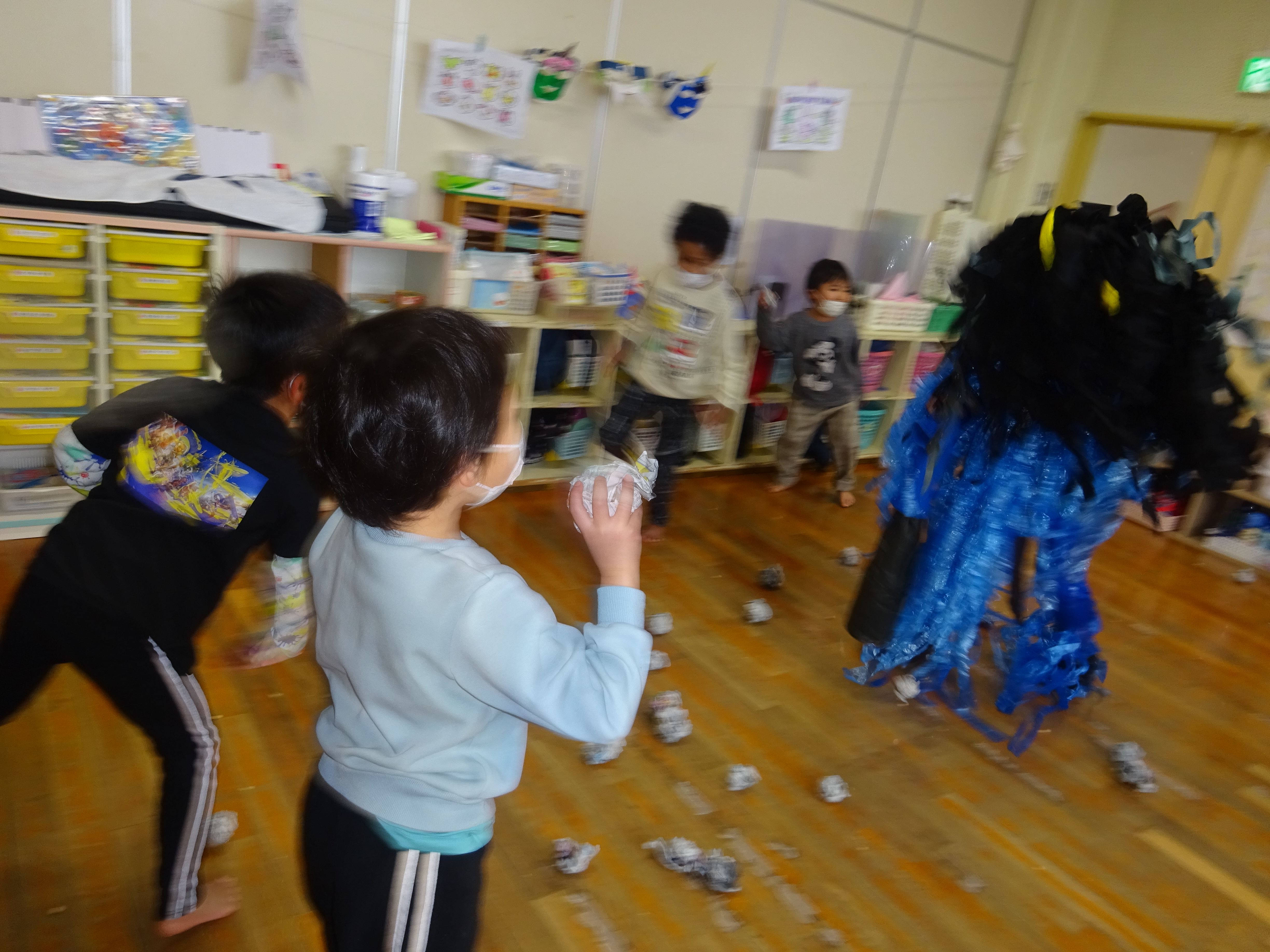オニ遊び楽しんでまーす❤ 2023年 2月 3日 Fri 管理者 シール貼りを楽しみました。 新聞を丸めて新聞ボールをつくってます。ぎゅー‼ シールを貼ったダンボール箱を組み立てて、丸めた新聞で鬼退治ごっこ遊びスタート!! 元気いっぱい楽しそうに投げて遊びました。えーい(^^) 鬼さんトンネル 鬼さん遊び引き続き楽しみまーす。 ぽん