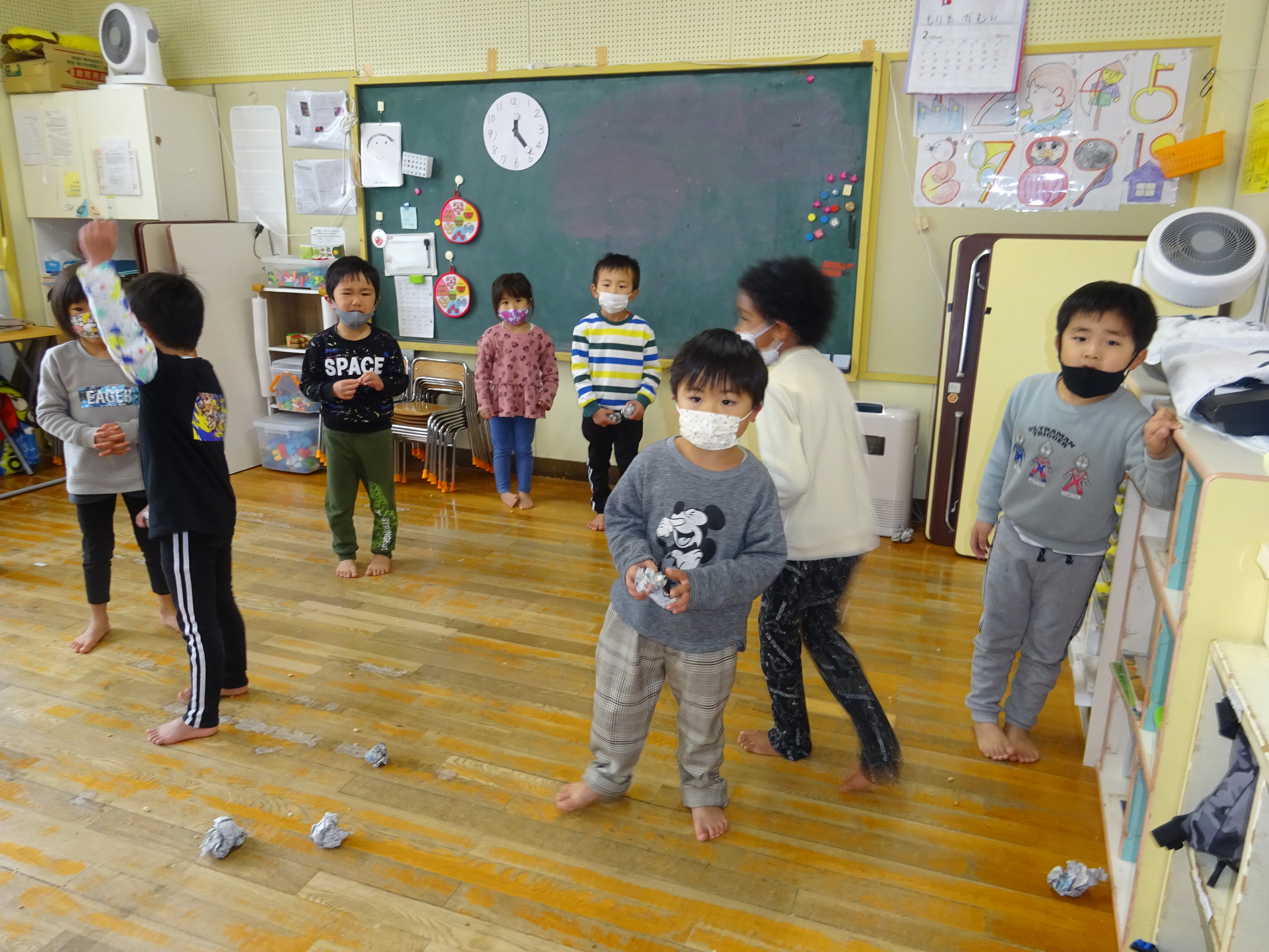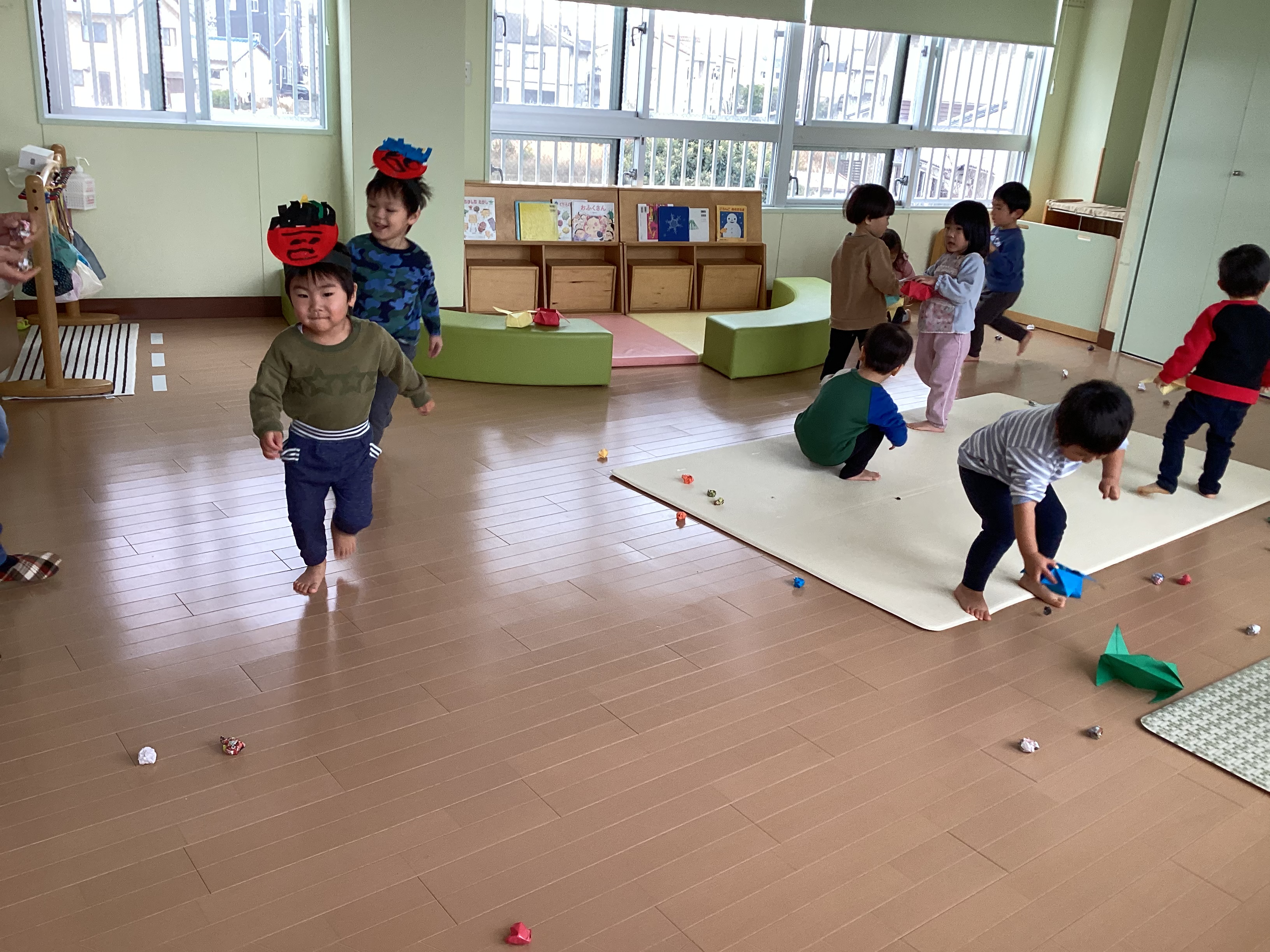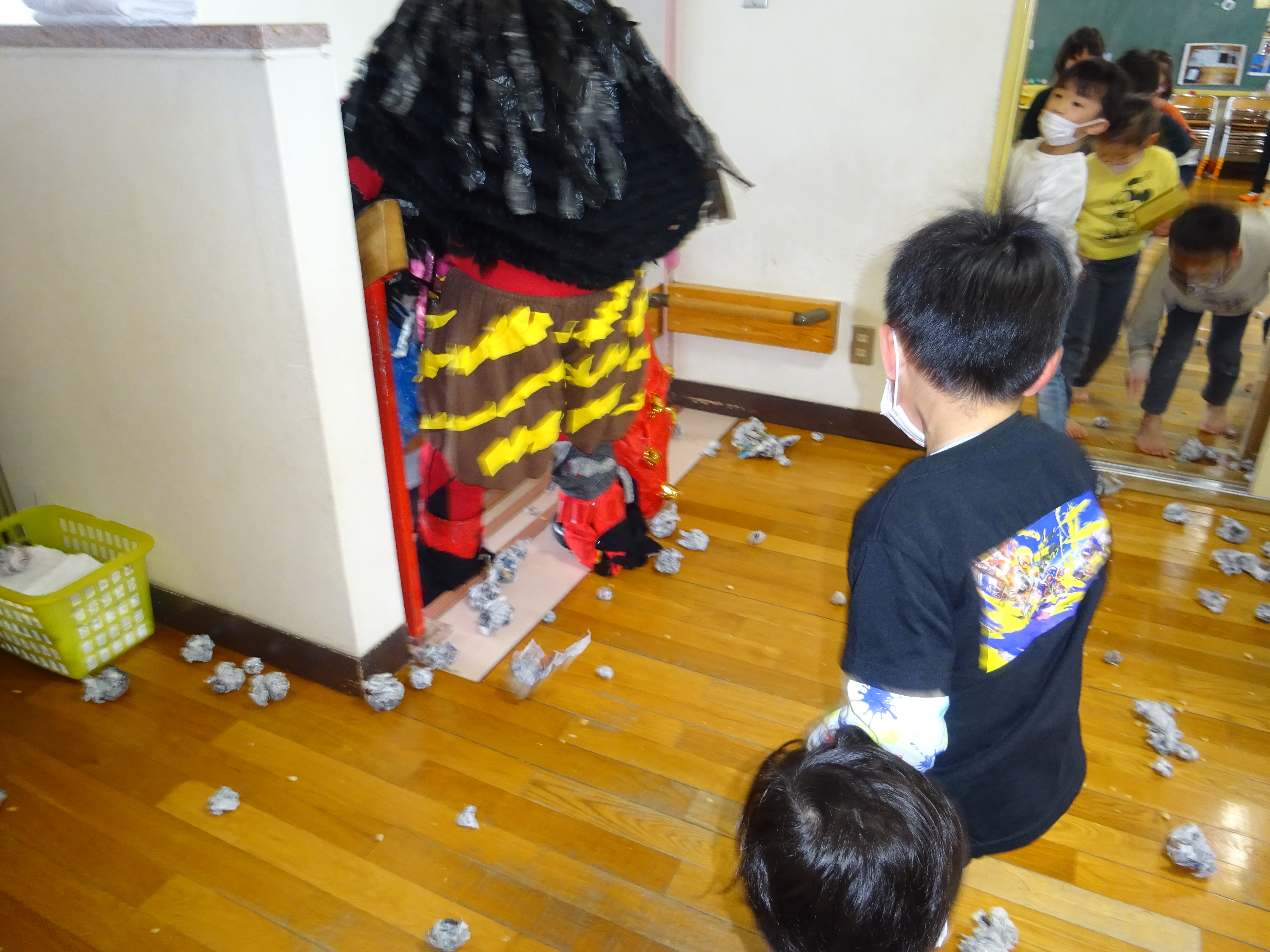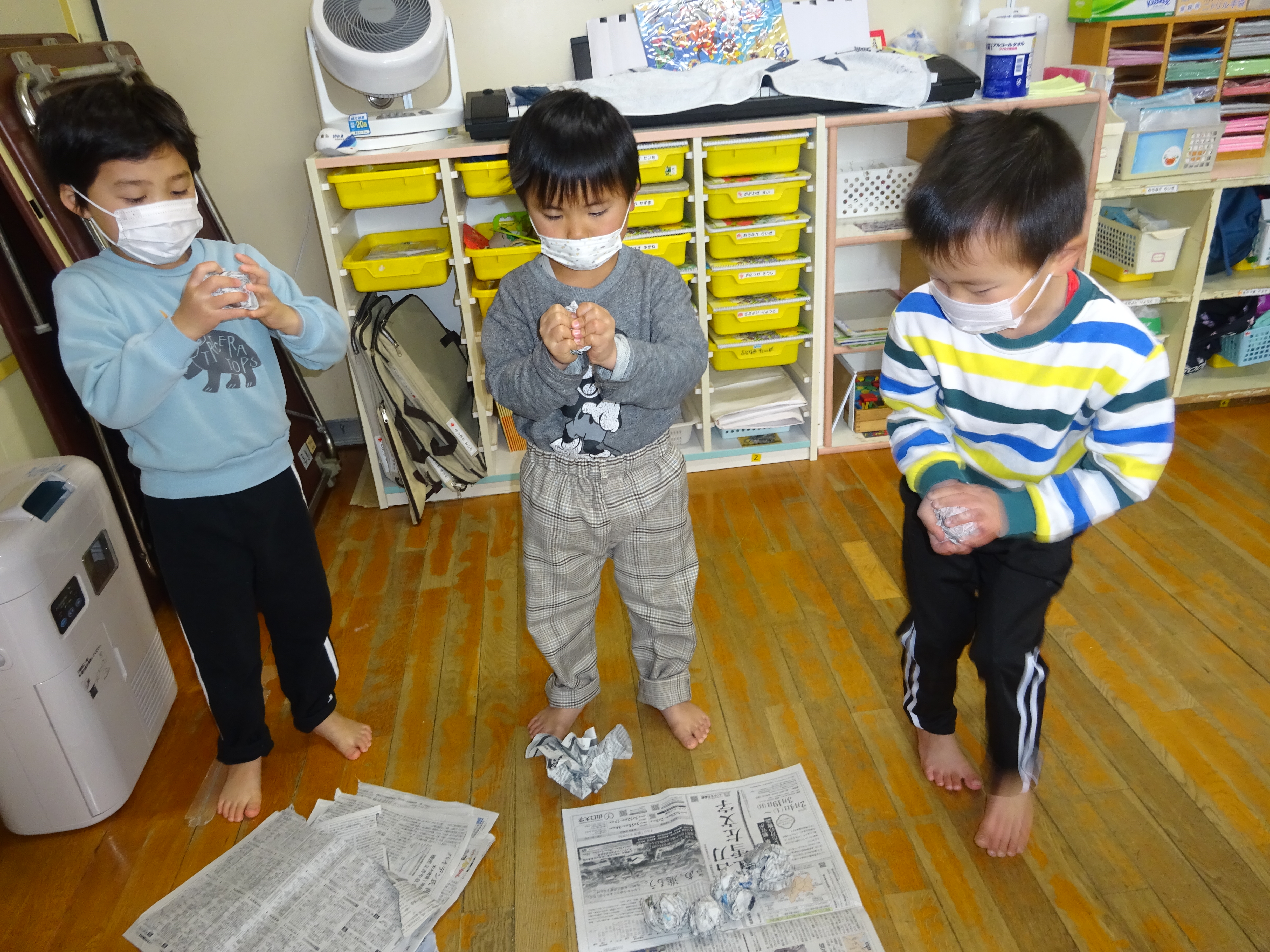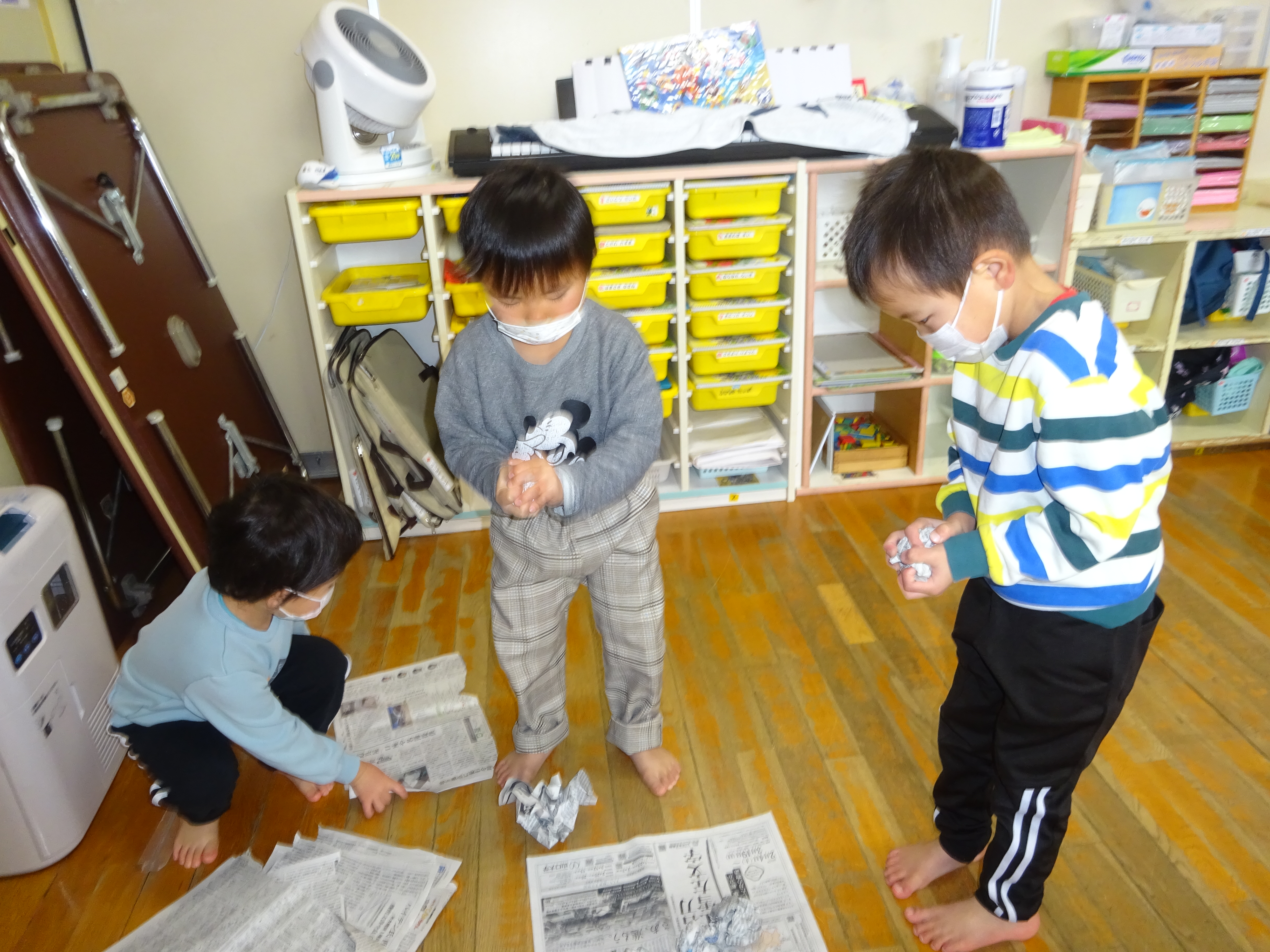 オニ遊び楽しんでまーす❤ 2023年 2月 3日 Fri 管理者 シール貼りを楽しみました。 新聞を丸めて新聞ボールをつくってます。ぎゅー‼ シールを貼ったダンボール箱を組み立てて、丸めた新聞で鬼退治ごっこ遊びスタート!! 元気いっぱい楽しそうに投げて遊びました。えーい(^^) 鬼さんトンネル 鬼さん遊び引き続き楽しみまーす。 ぽん