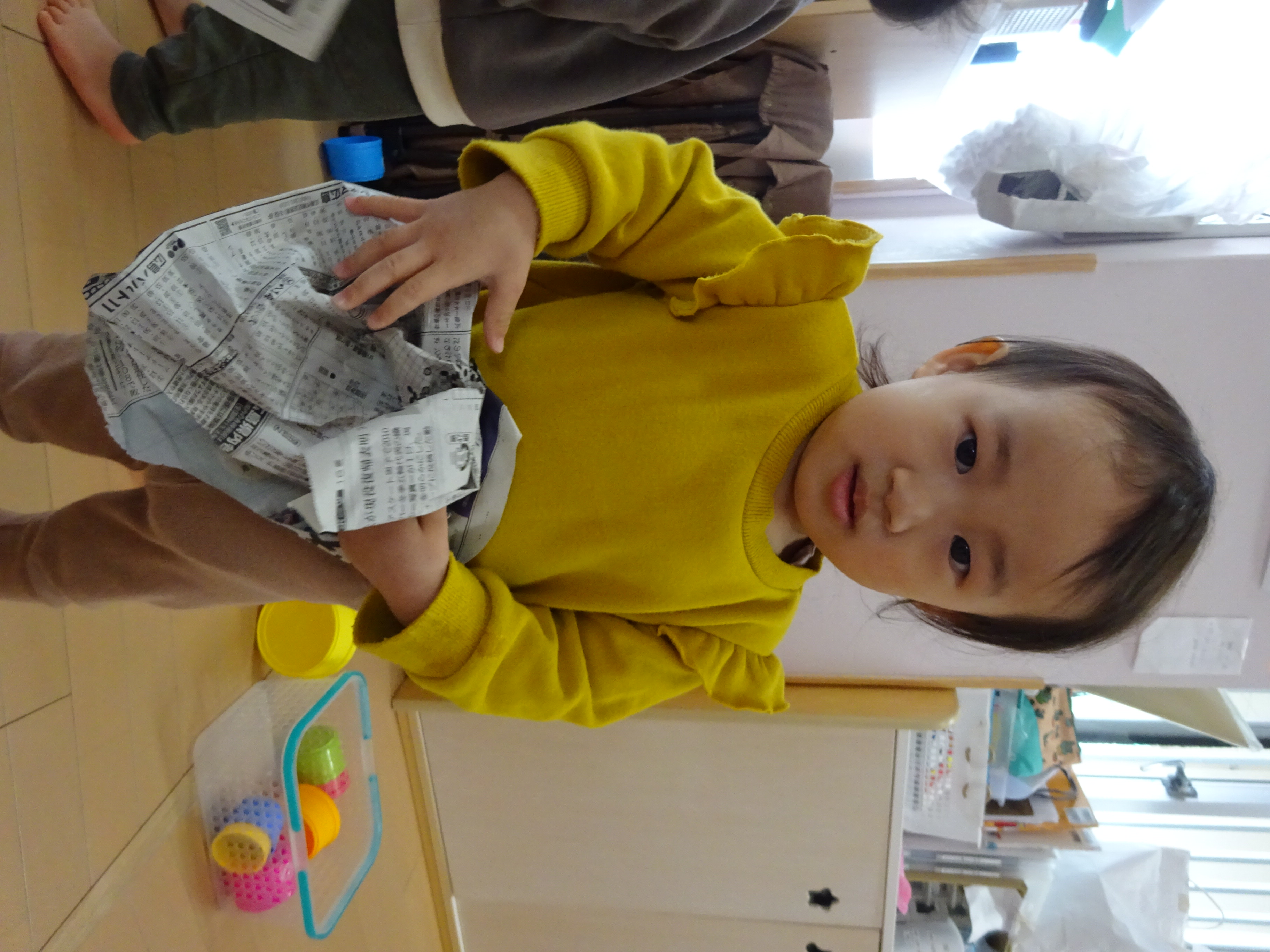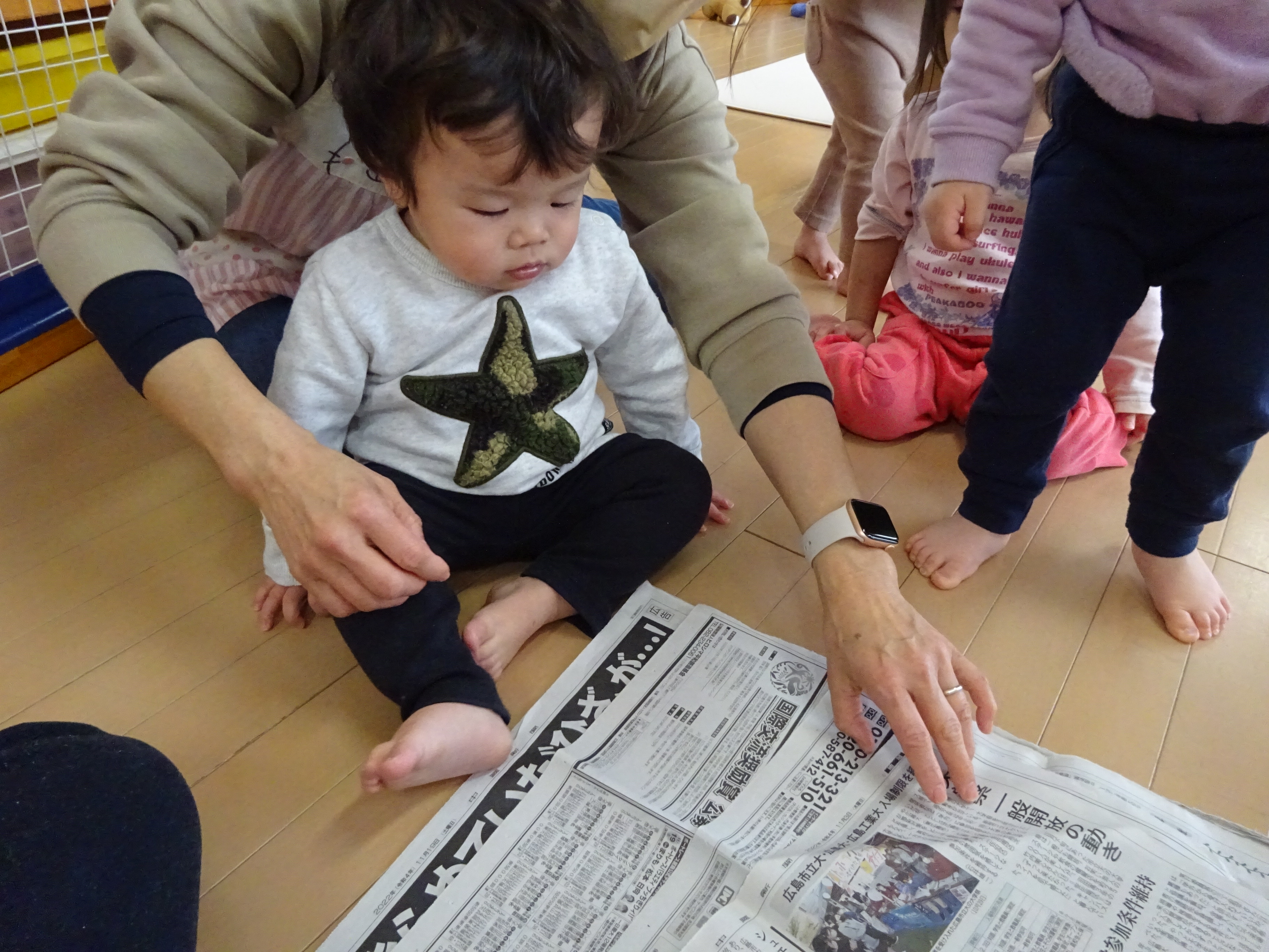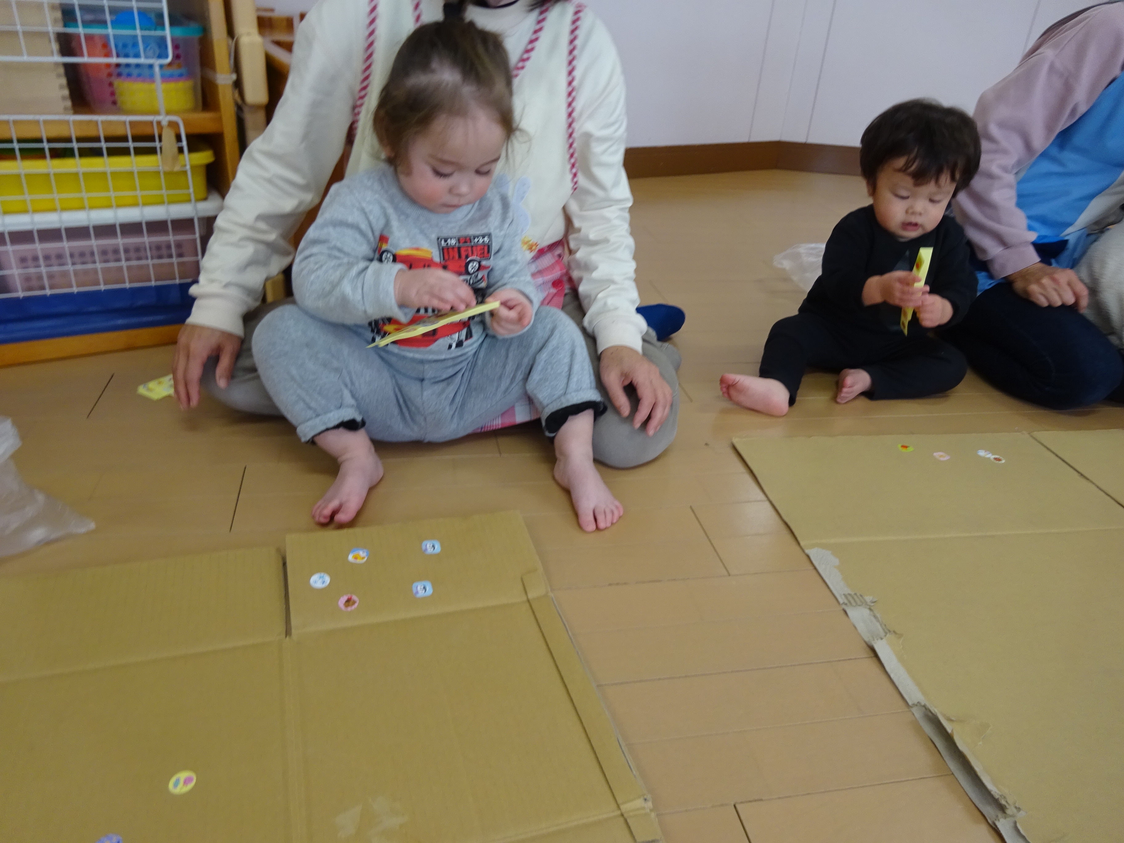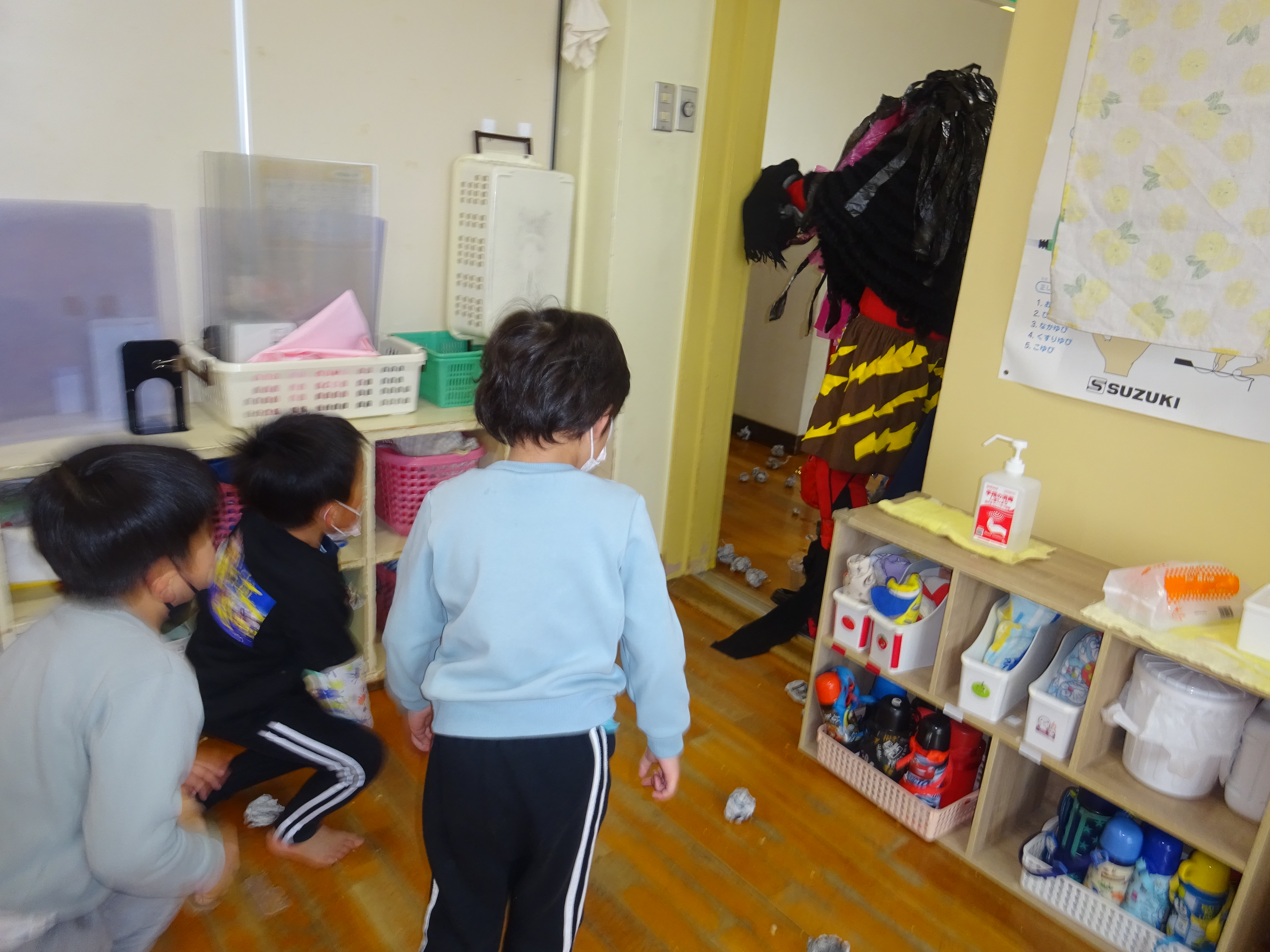 オニ遊び楽しんでまーす❤ 2023年 2月 3日 Fri 管理者 シール貼りを楽しみました。 新聞を丸めて新聞ボールをつくってます。ぎゅー‼ シールを貼ったダンボール箱を組み立てて、丸めた新聞で鬼退治ごっこ遊びスタート!! 元気いっぱい楽しそうに投げて遊びました。えーい(^^) 鬼さんトンネル 鬼さん遊び引き続き楽しみまーす。 ぽん