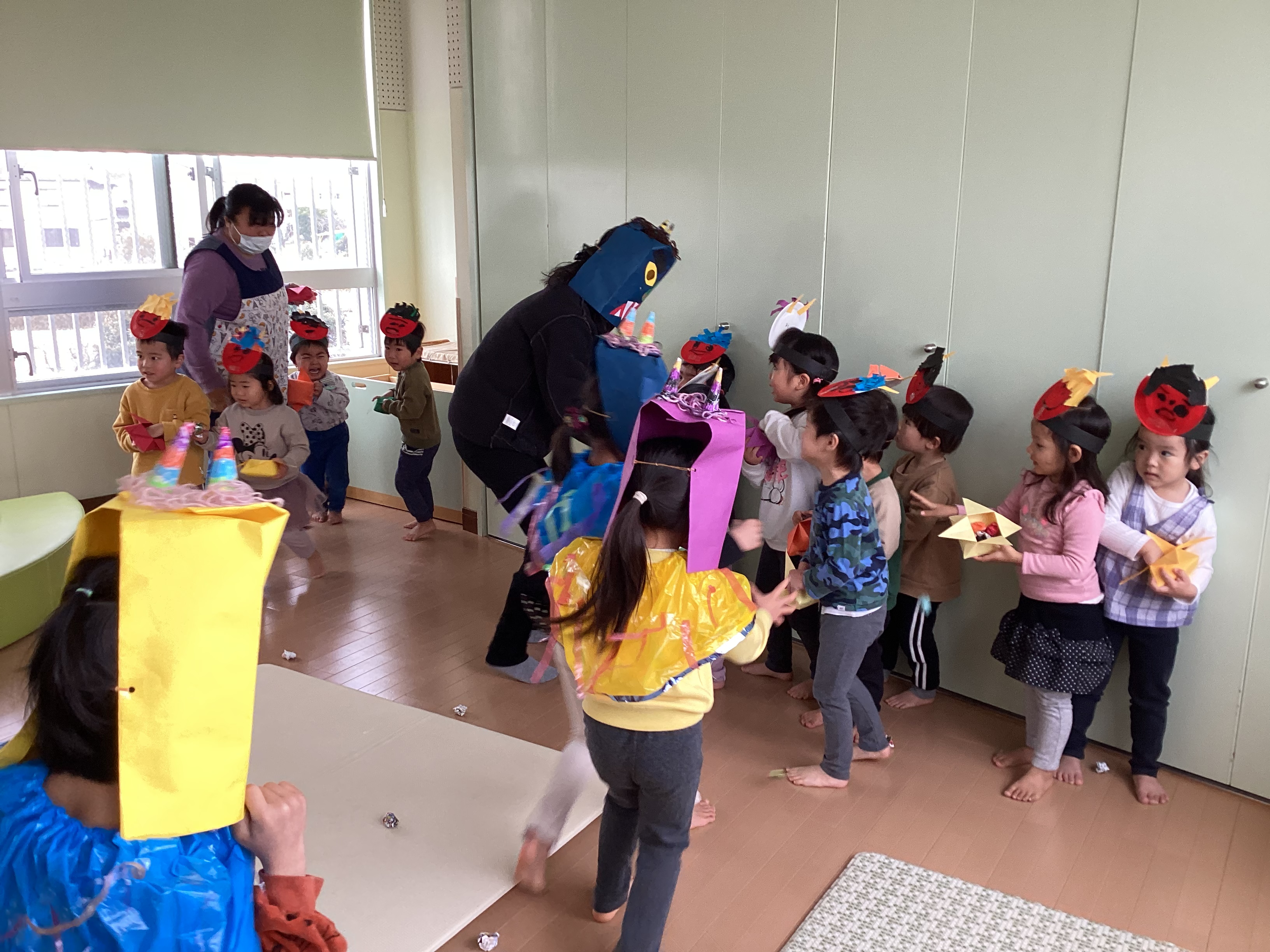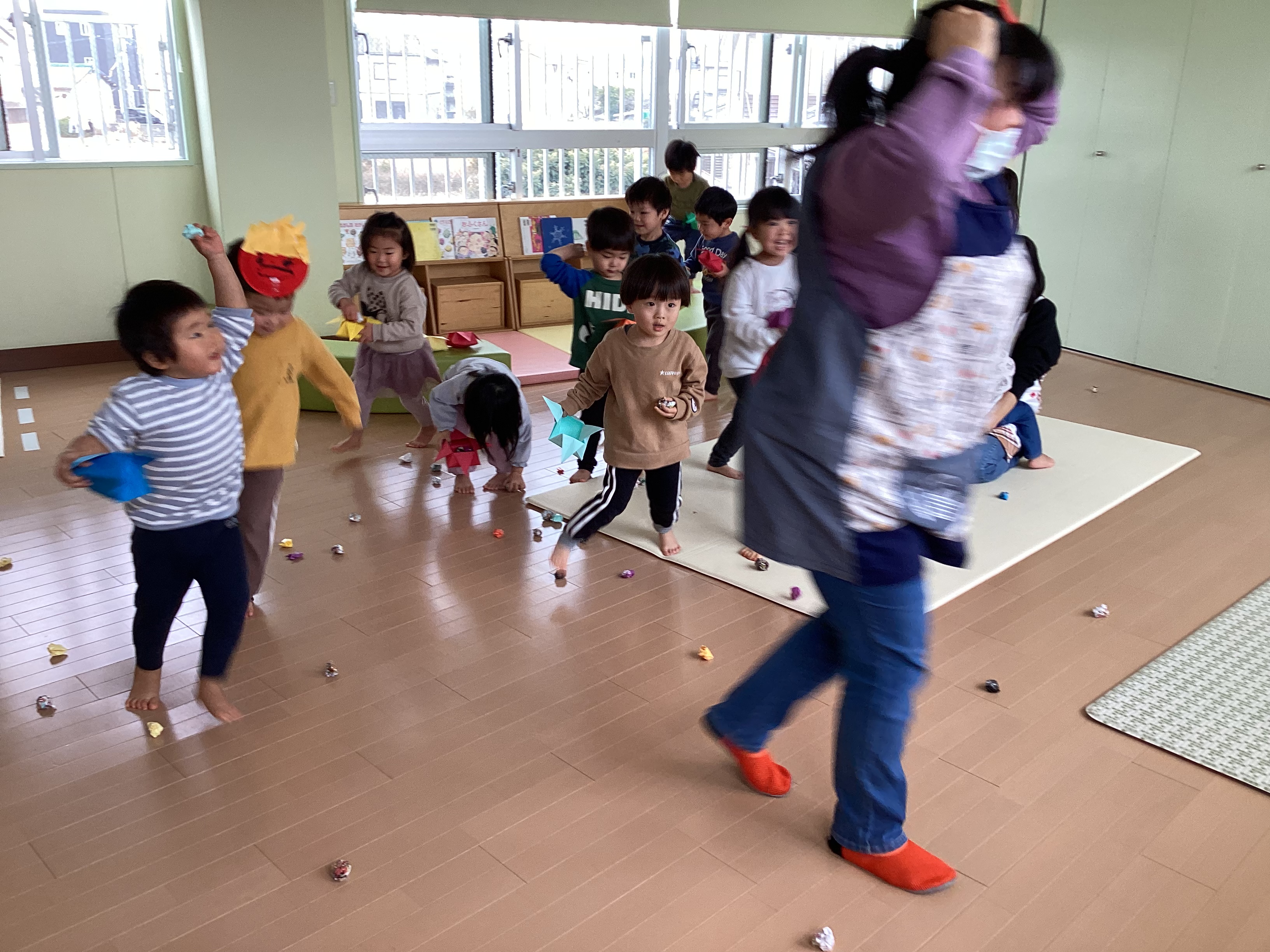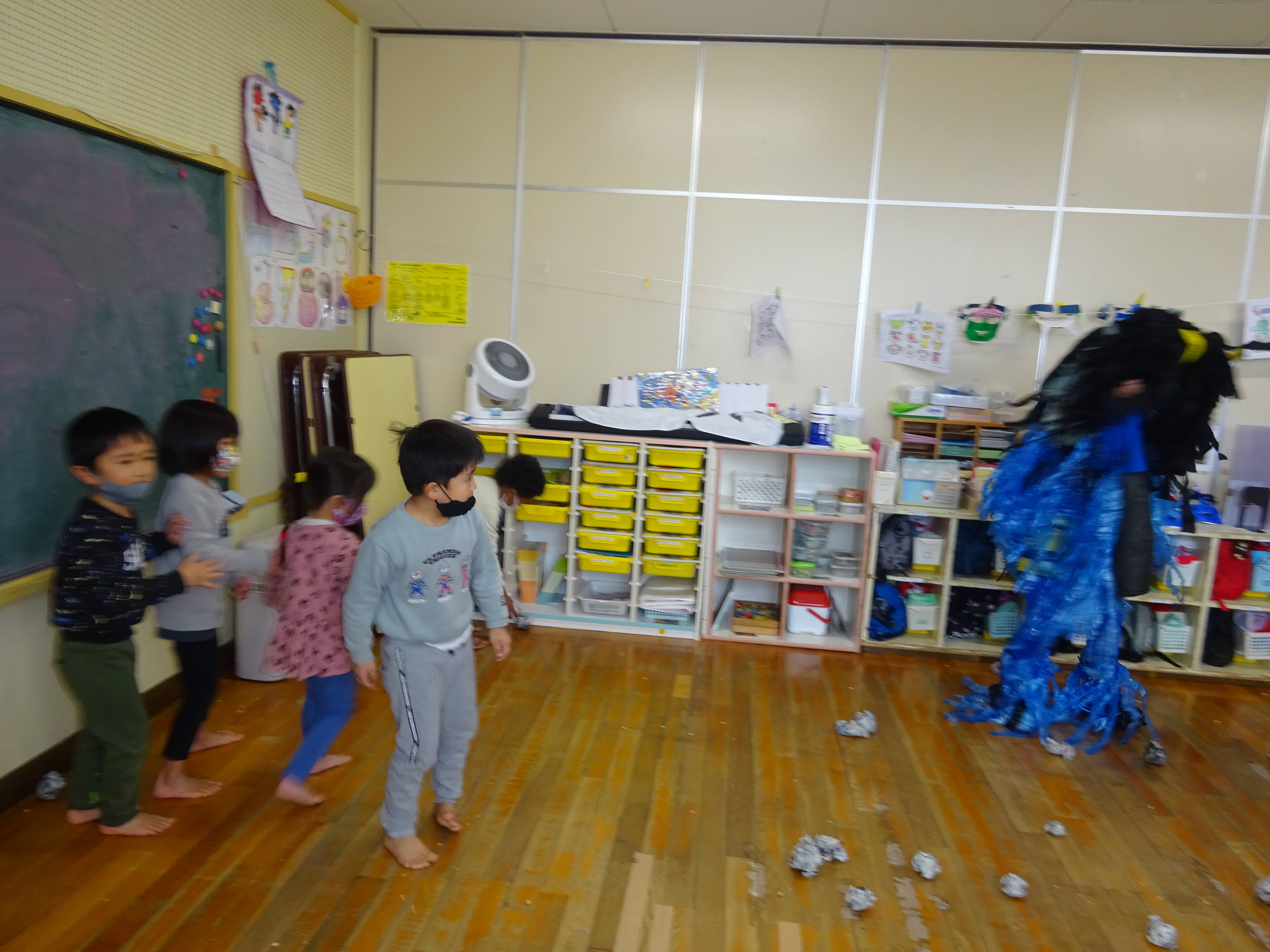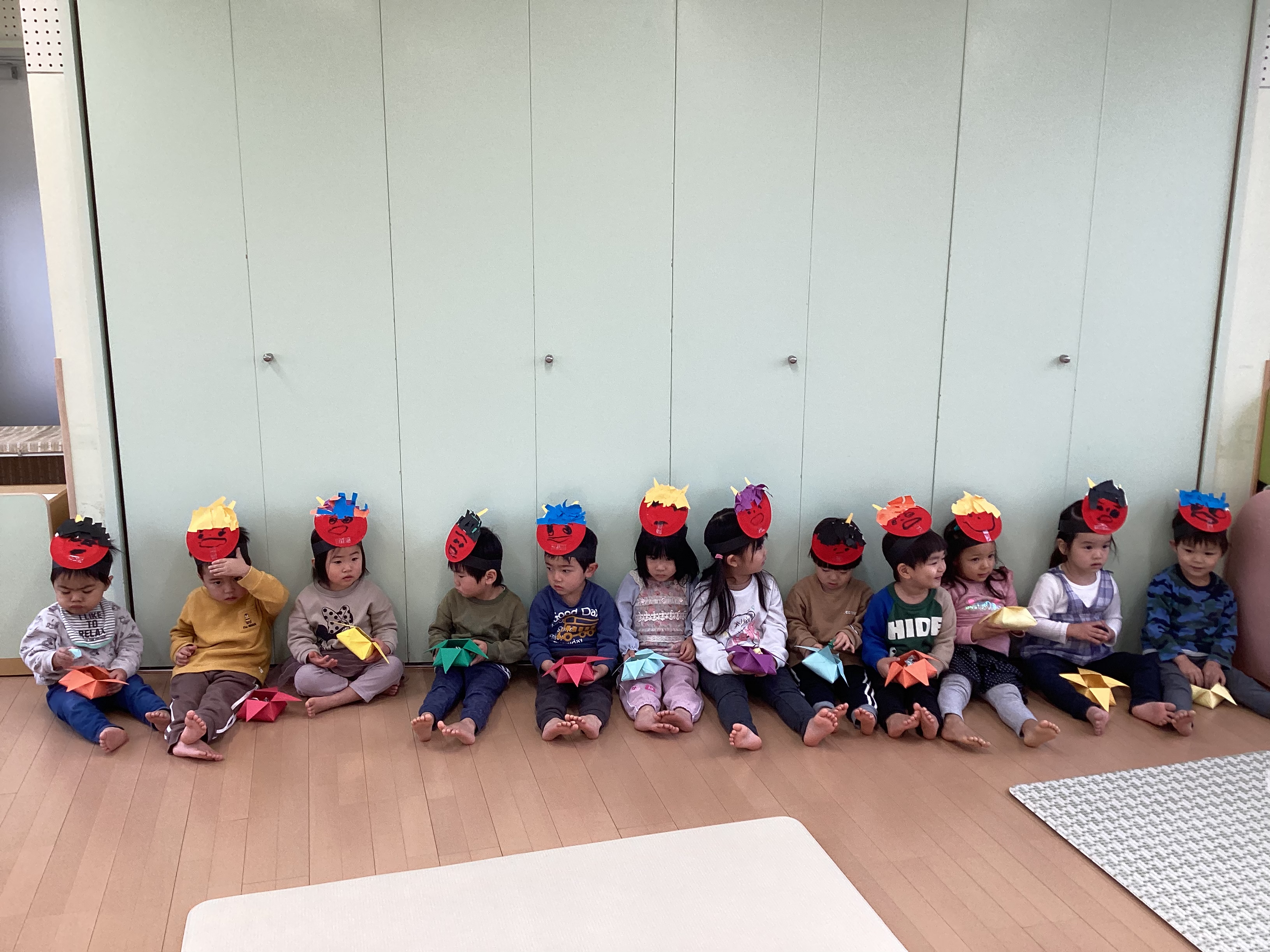 うさぎぐみの節分 2023年 2月 4日 Sat 管理者 オニが来たらいけんけー準備、準備 ib きりん組オニから登場。いつもは優しいお兄さん・お姉さんと分かっているから怖くない子もいれば、それでも怖い子も… きりん組オニがて帰って一安心、、と思っていたら 大きいオニ登場‼豆と、朝作った新聞紙ボールを投ます。 「鬼は外、福は内」逃げる・投げる事に必死でなかなか掛け声が出ません(;^ω^) オニをやっつけた~‼ 喜んでいたのも束の間…… 戻って来た(゚Д゚;)‼ 今度こそ、本当に帰ってね♡ 泣いているお友だちに優しい言葉を掛けてあげています♡あきらくん 今年も元気に過ごそうね! れもん 前の記事 次の記事