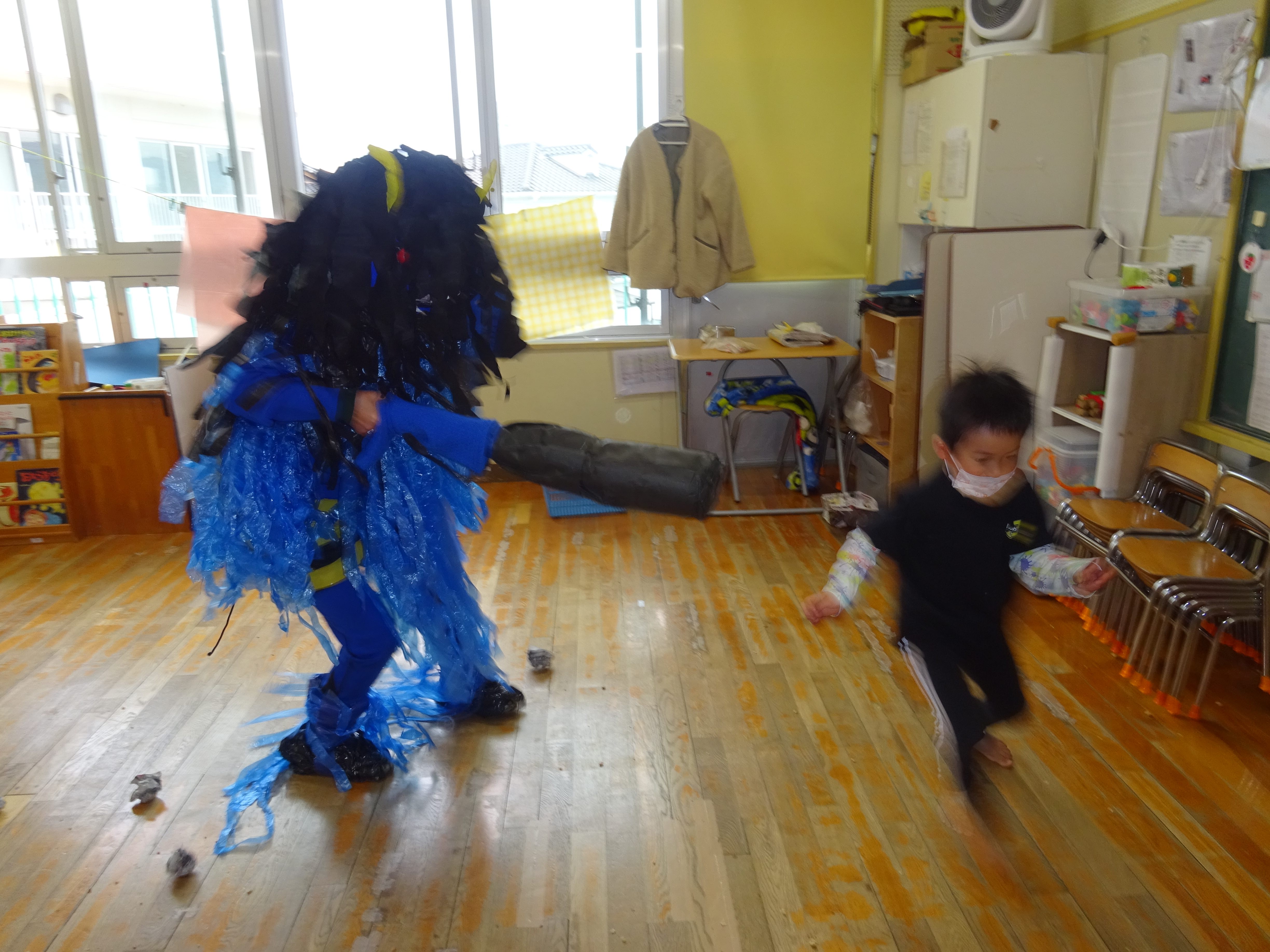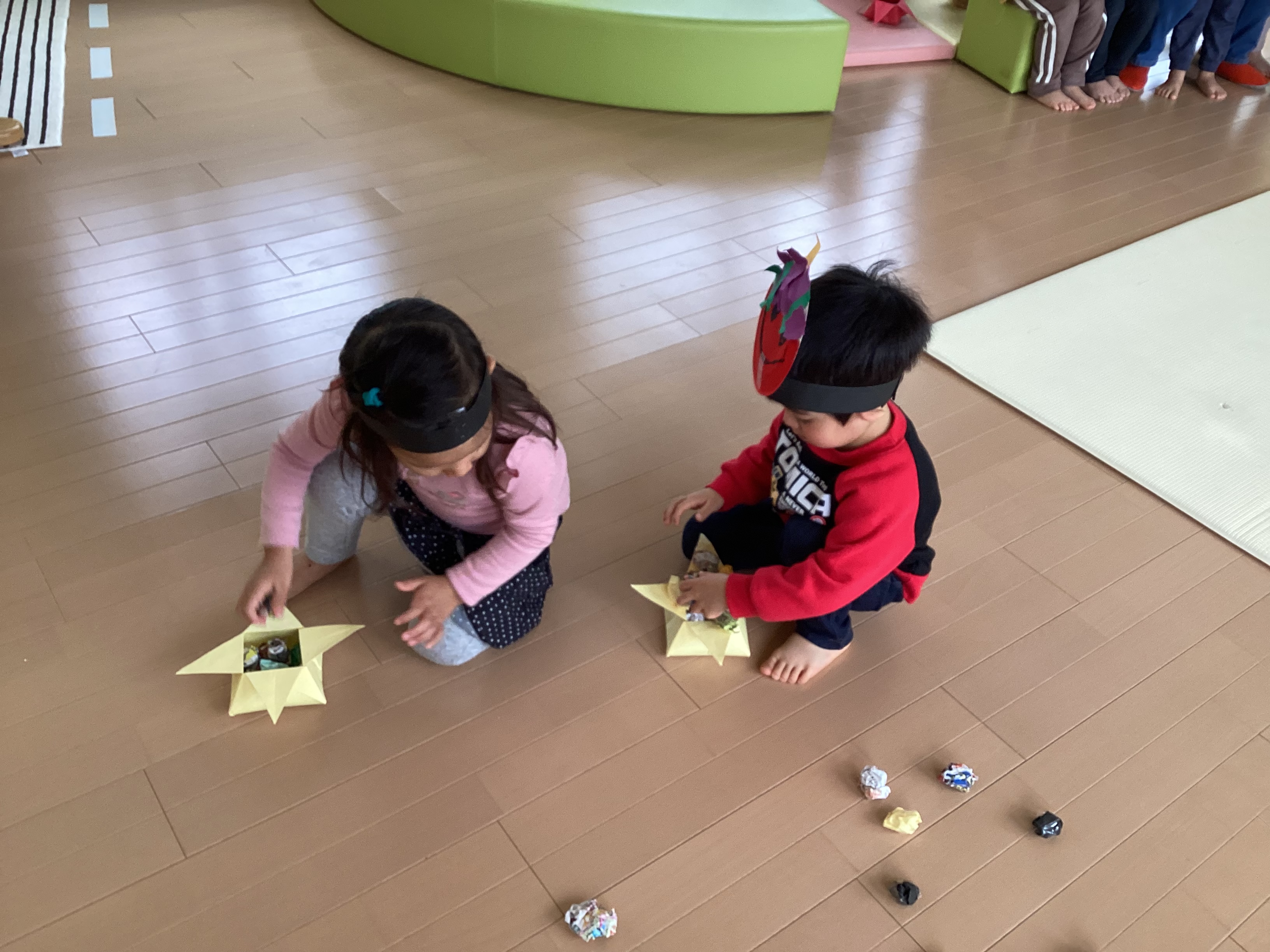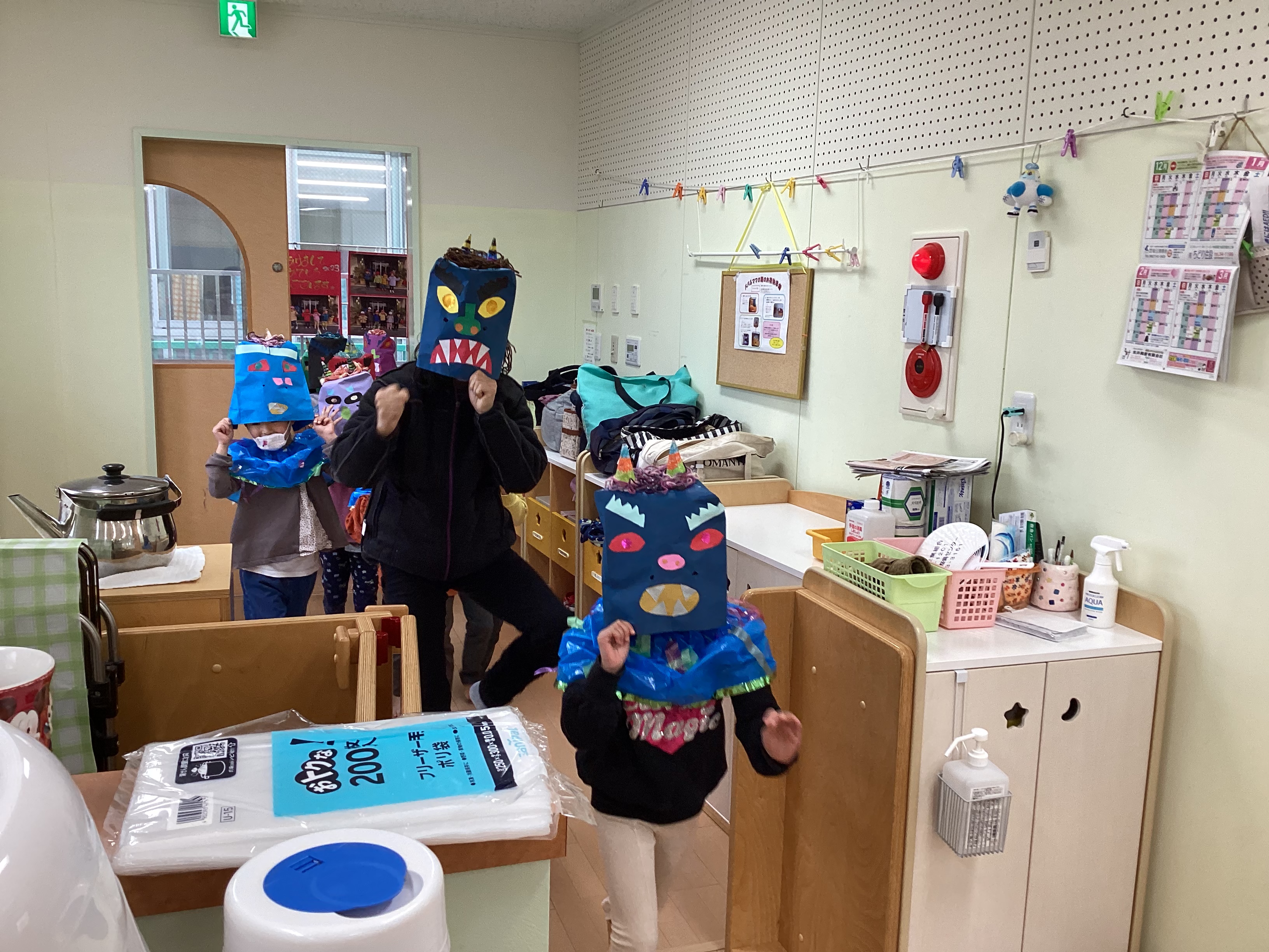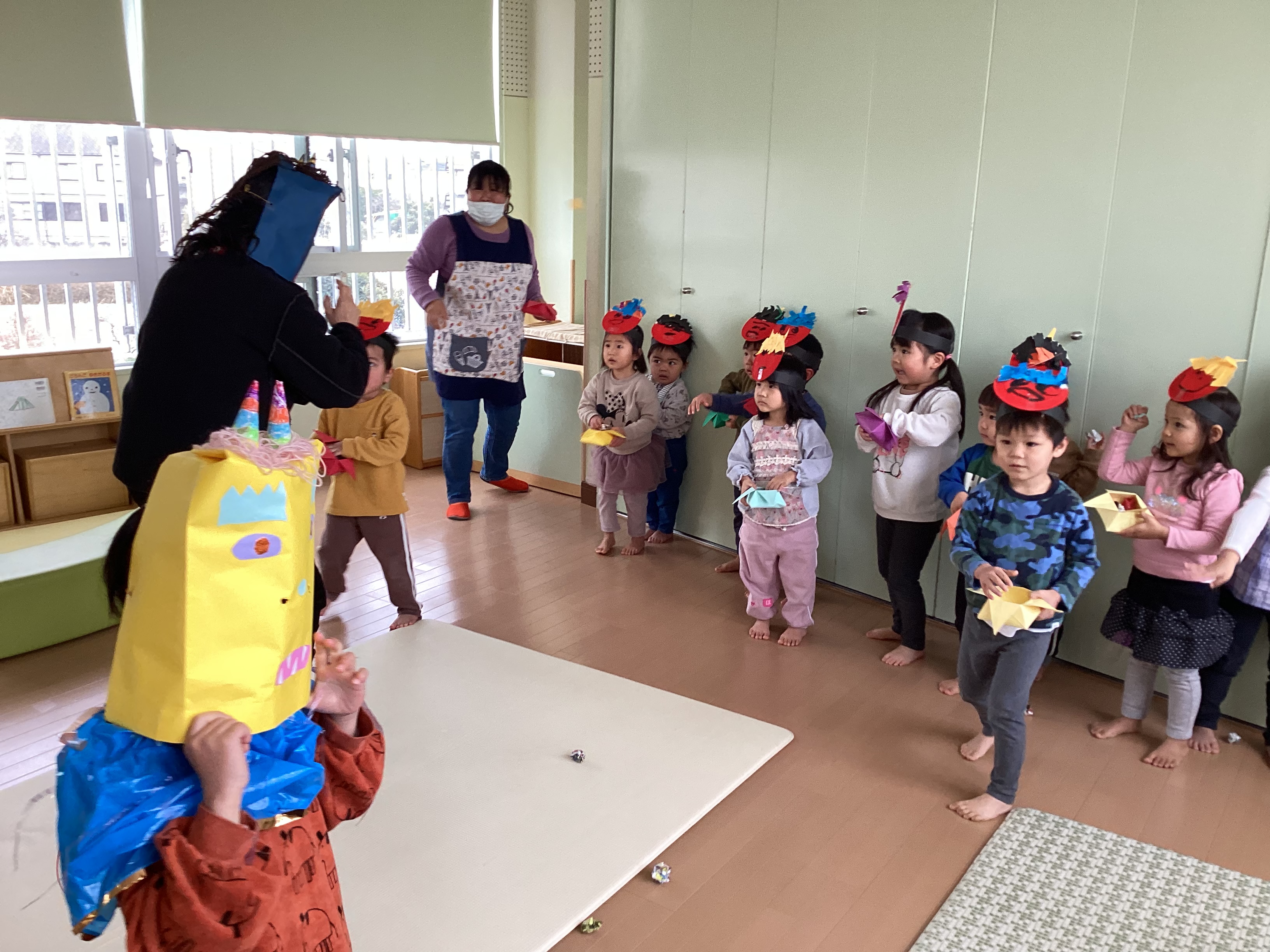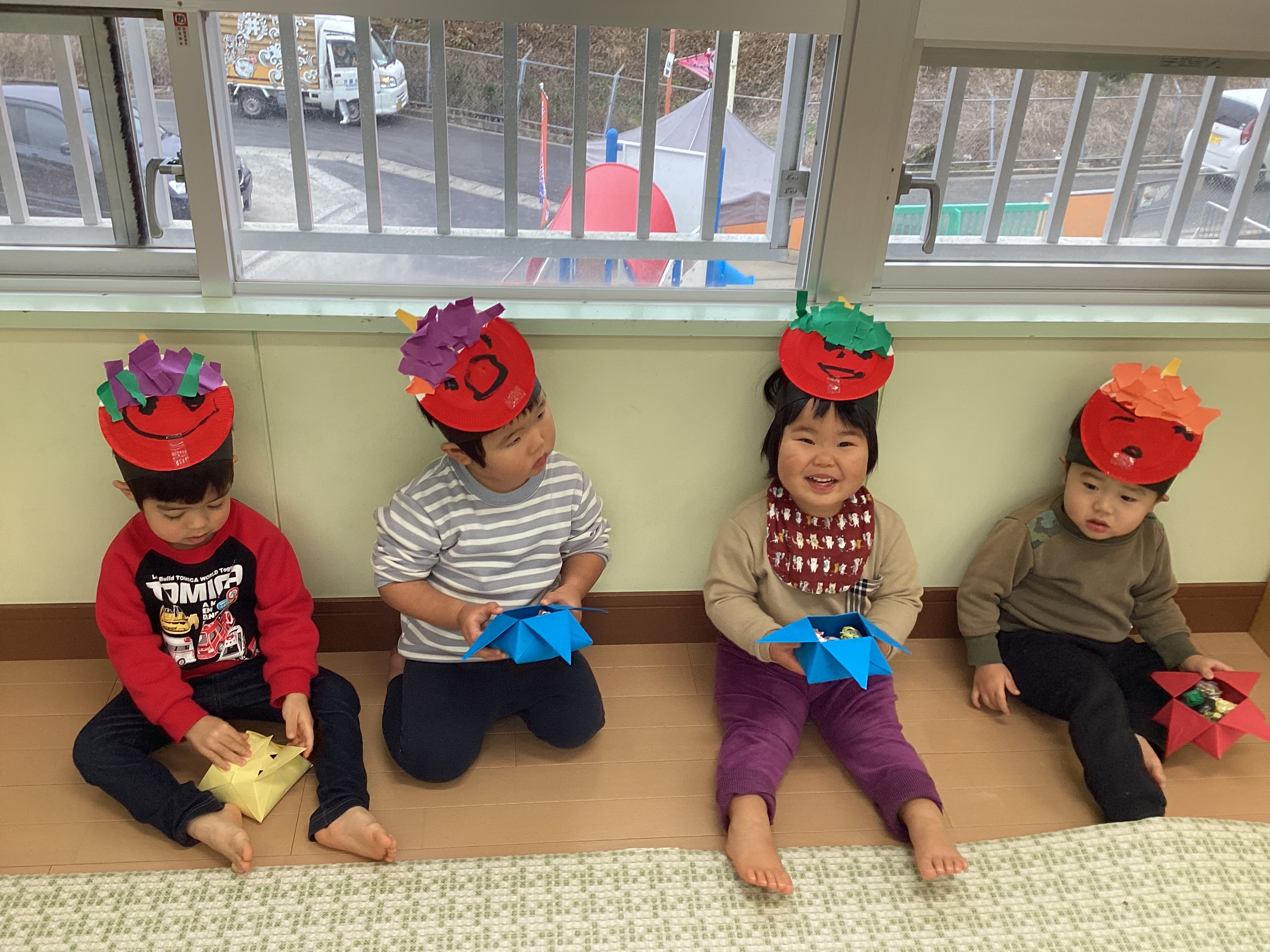 うさぎぐみの節分 2023年 2月 4日 Sat 管理者 オニが来たらいけんけー準備、準備 ib きりん組オニから登場。いつもは優しいお兄さん・お姉さんと分かっているから怖くない子もいれば、それでも怖い子も… きりん組オニがて帰って一安心、、と思っていたら 大きいオニ登場‼豆と、朝作った新聞紙ボールを投ます。 「鬼は外、福は内」逃げる・投げる事に必死でなかなか掛け声が出ません(;^ω^) オニをやっつけた~‼ 喜んでいたのも束の間…… 戻って来た(゚Д゚;)‼ 今度こそ、本当に帰ってね♡ 泣いているお友だちに優しい言葉を掛けてあげています♡あきらくん 今年も元気に過ごそうね! れもん 前の記事 次の記事