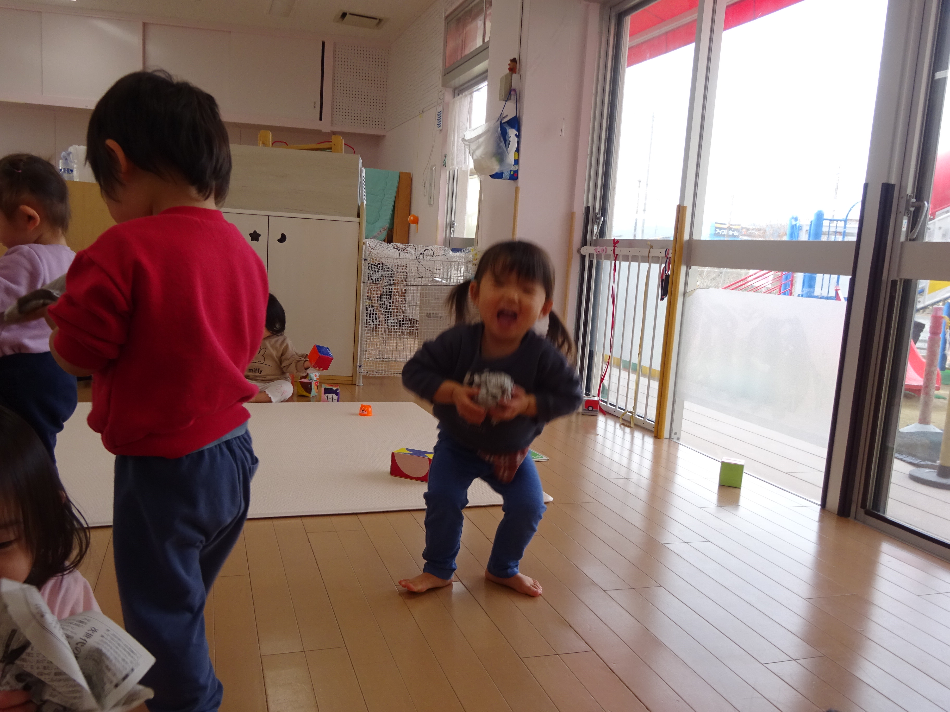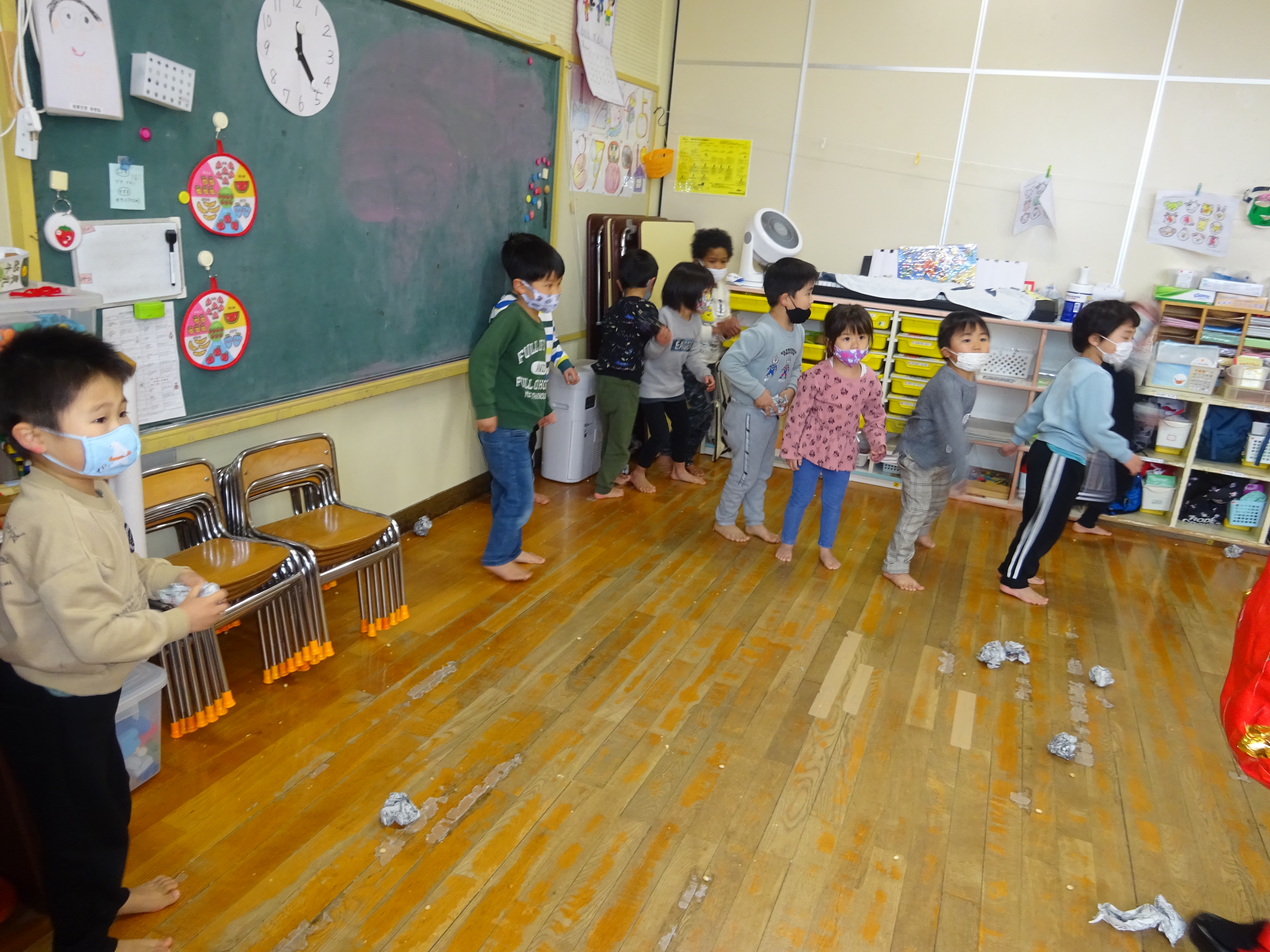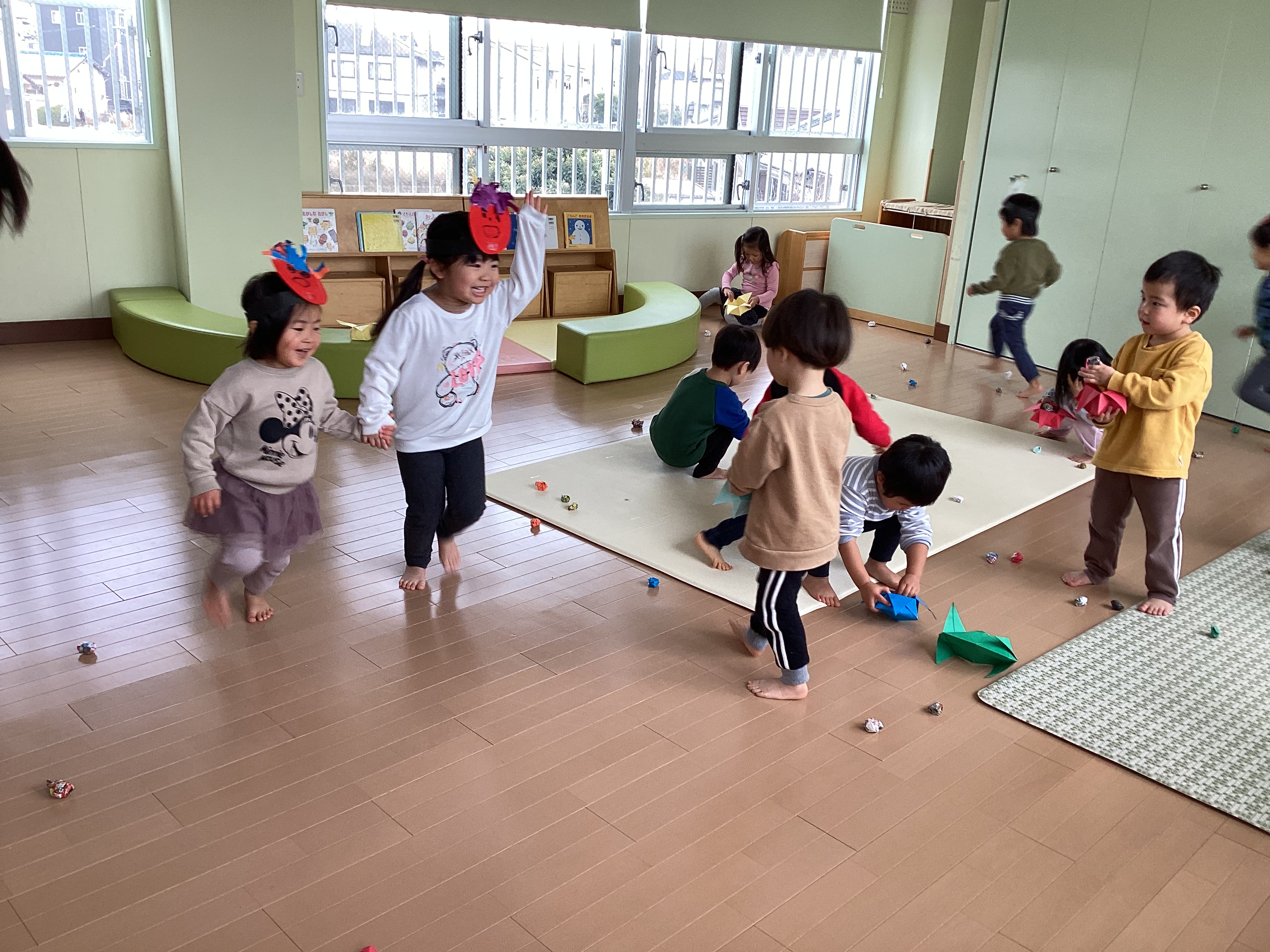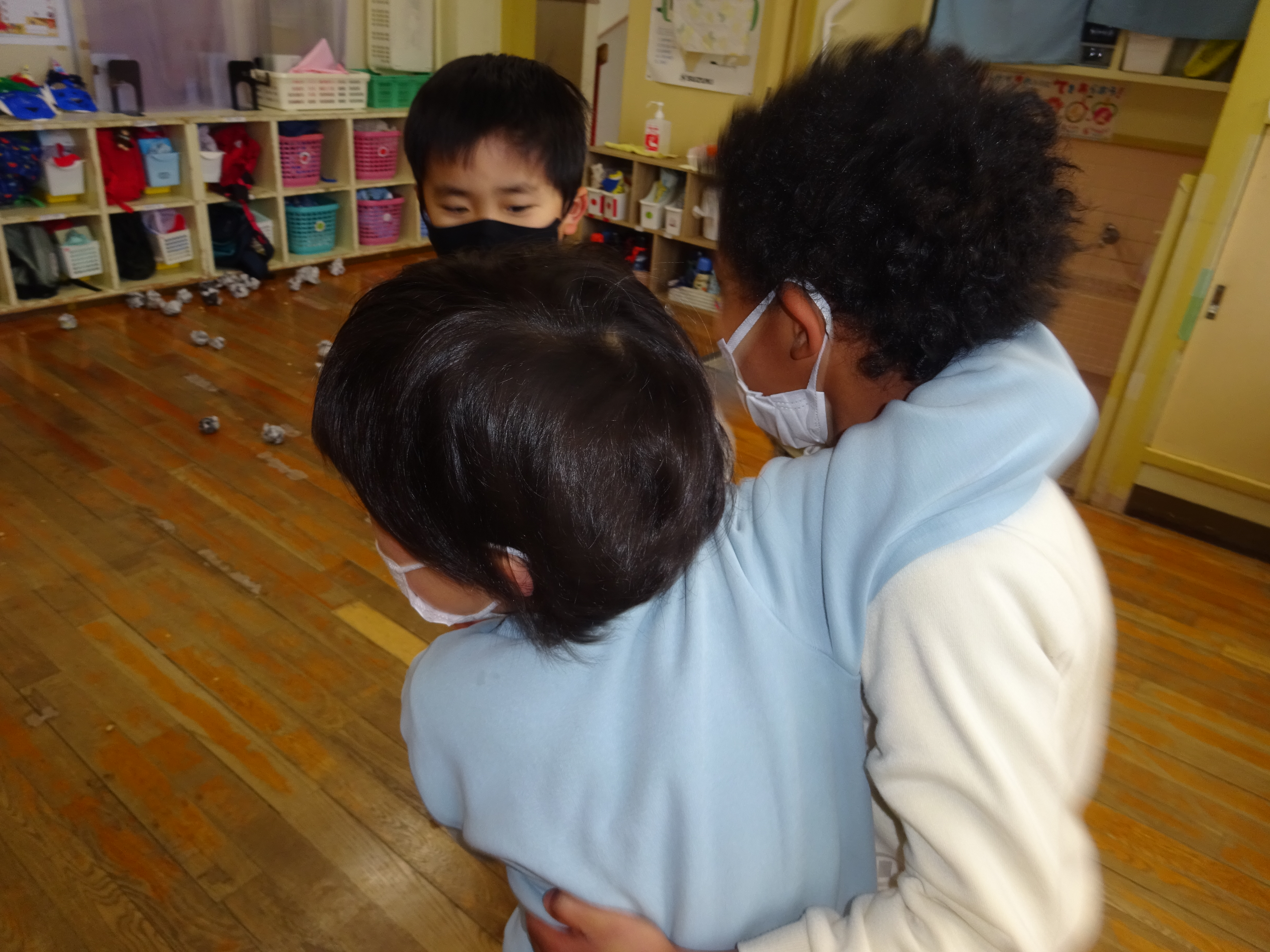 うさぎぐみの節分 2023年 2月 4日 Sat 管理者 オニが来たらいけんけー準備、準備 ib きりん組オニから登場。いつもは優しいお兄さん・お姉さんと分かっているから怖くない子もいれば、それでも怖い子も… きりん組オニがて帰って一安心、、と思っていたら 大きいオニ登場‼豆と、朝作った新聞紙ボールを投ます。 「鬼は外、福は内」逃げる・投げる事に必死でなかなか掛け声が出ません(;^ω^) オニをやっつけた~‼ 喜んでいたのも束の間…… 戻って来た(゚Д゚;)‼ 今度こそ、本当に帰ってね♡ 泣いているお友だちに優しい言葉を掛けてあげています♡あきらくん 今年も元気に過ごそうね! れもん 前の記事 次の記事