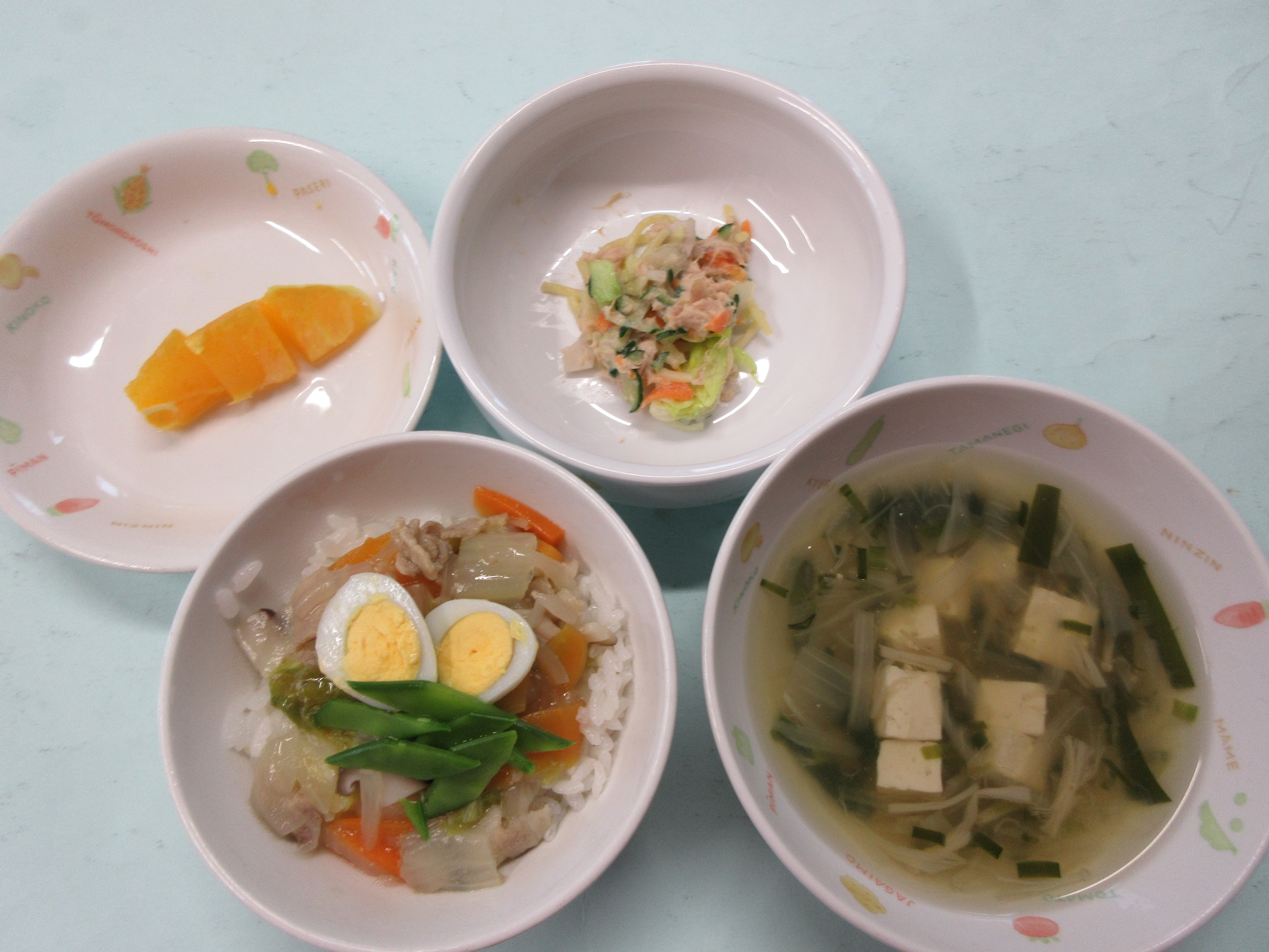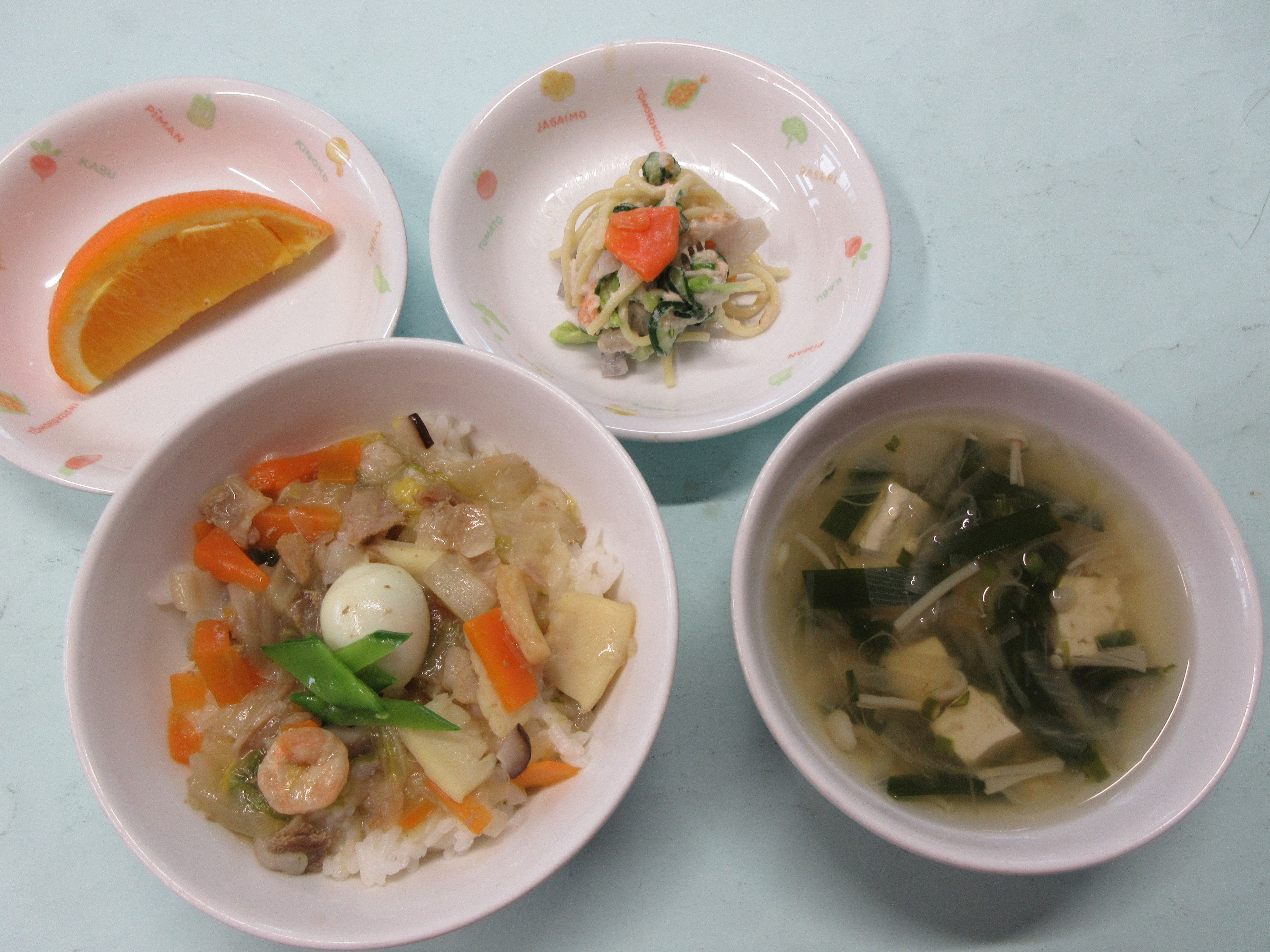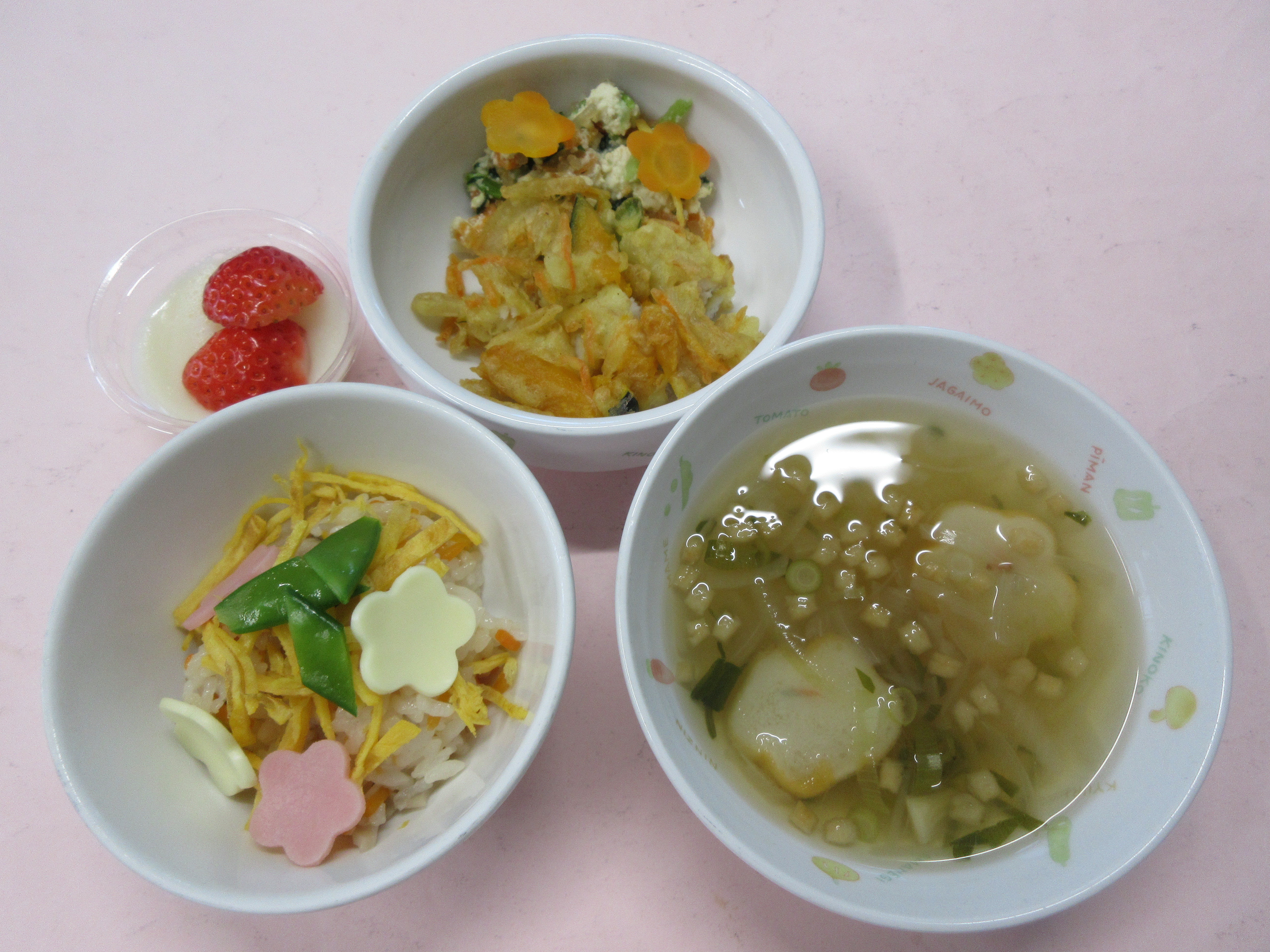 幼児組給食はお楽しみ(^_-)-☆令和3年3月3日 2021年 3月 3日 Wed 管理者 (幼児組のみ) ―お楽しみ献立― お楽しみ献立ブログにアップいたしますので しばらくお待ちくださいませ<(_ _)> (未満児) ちらし寿司 かき揚げ 白和え すまし汁 豆乳ゼリー ※献立ではいちごにしておりましたが幼児お楽しみ給食用の ゼリーが用意できましたので変更させていただきました。