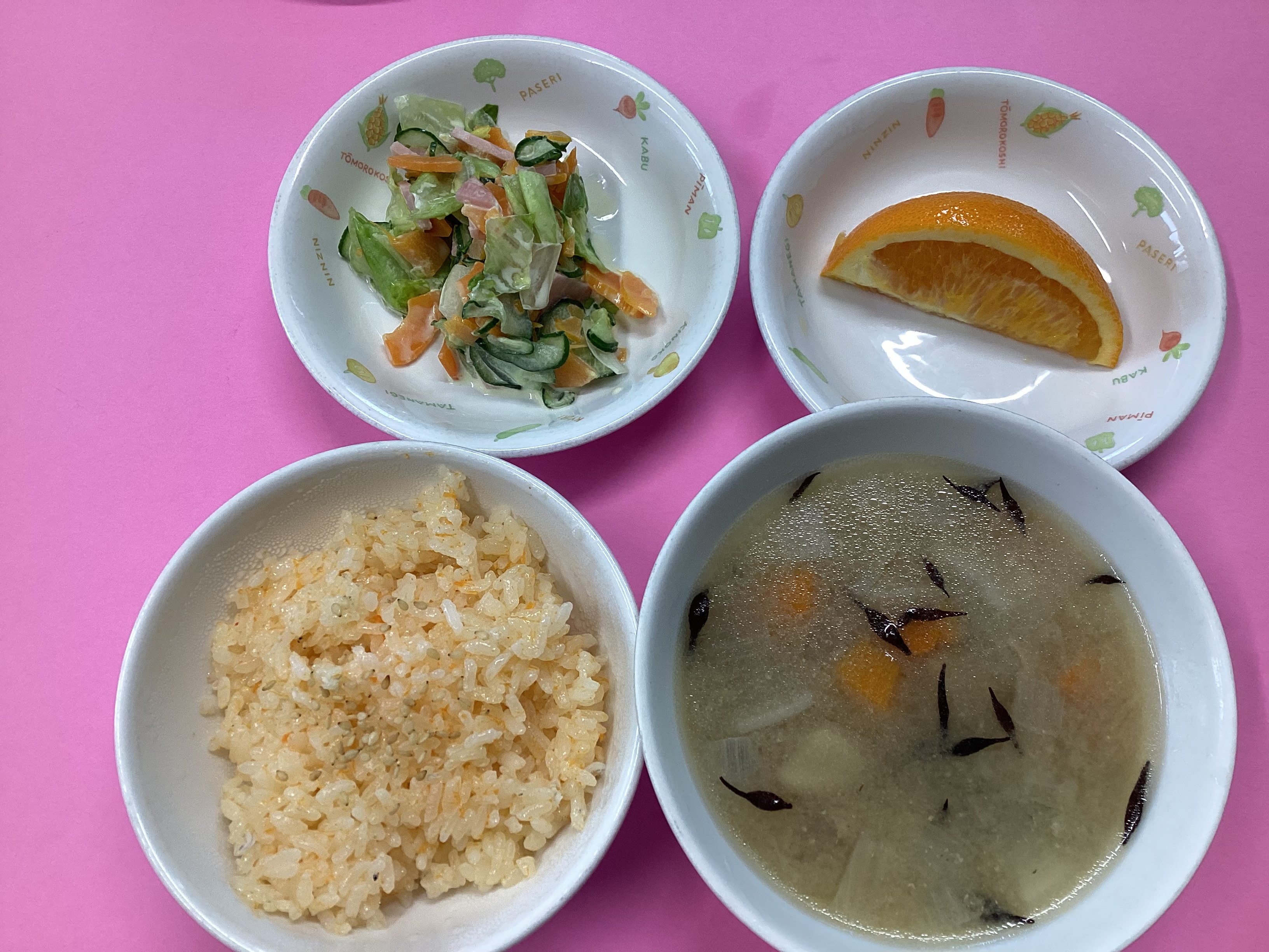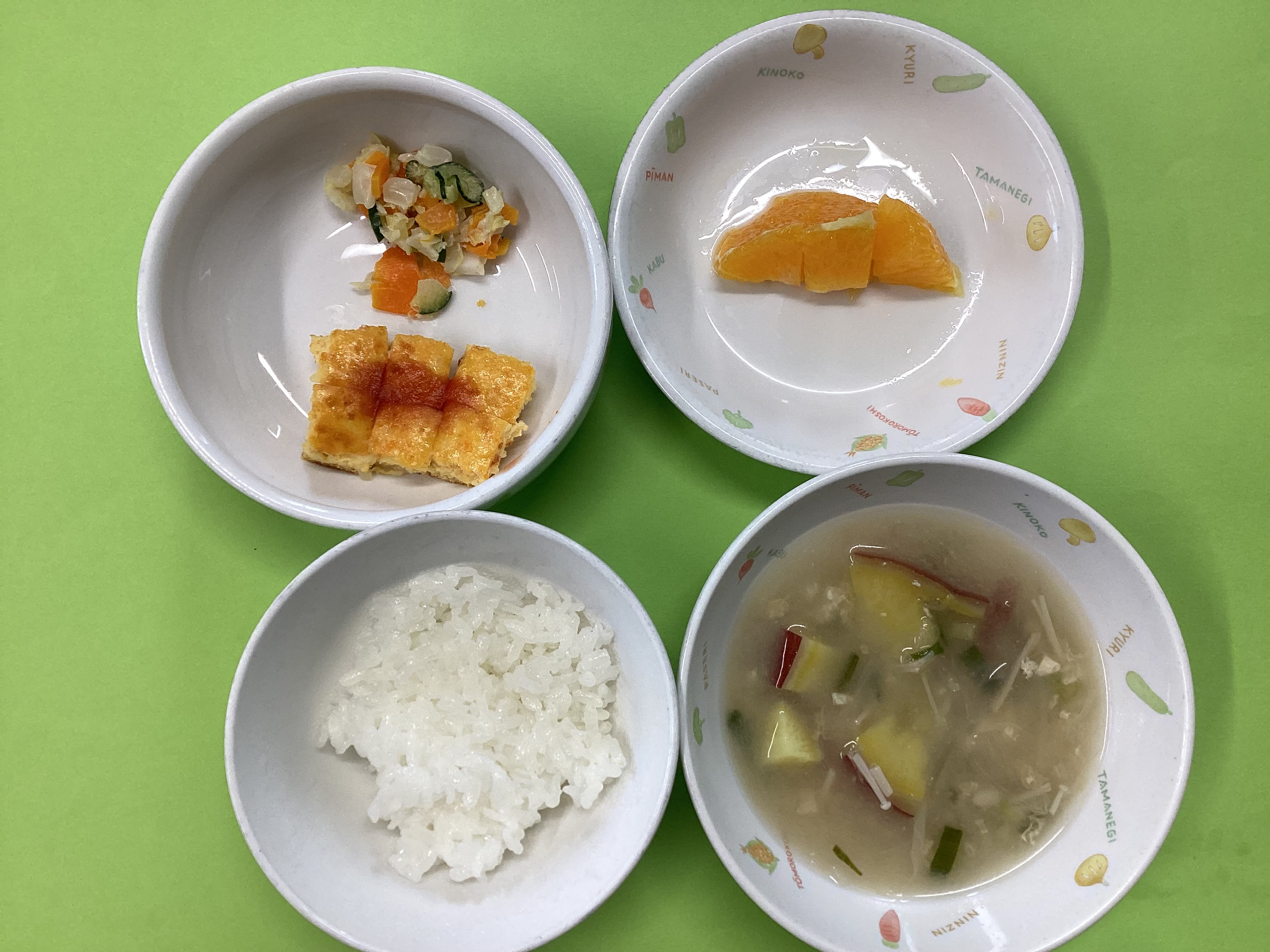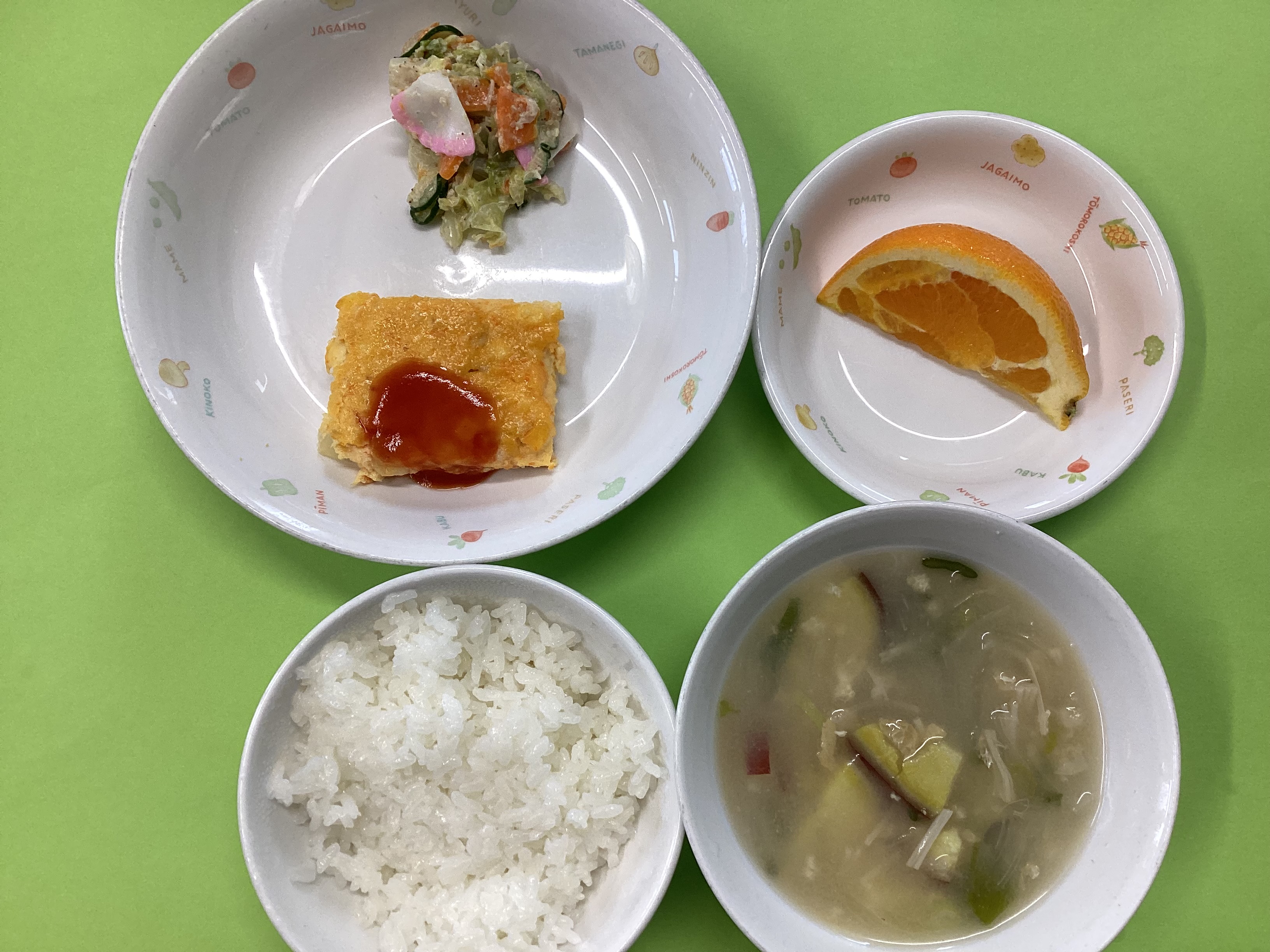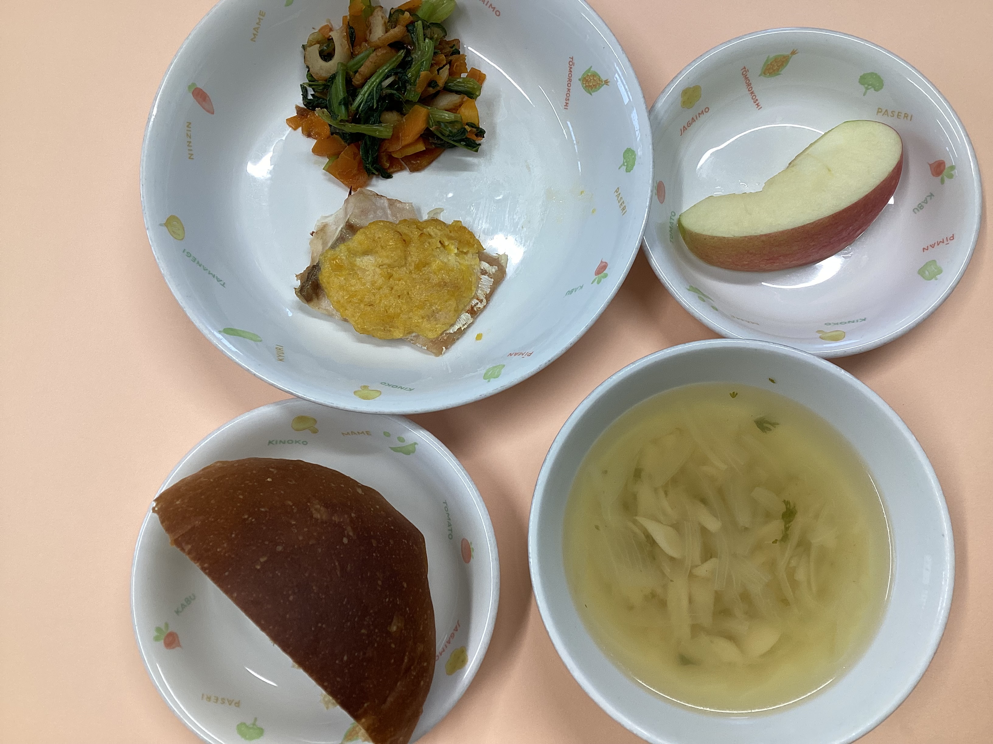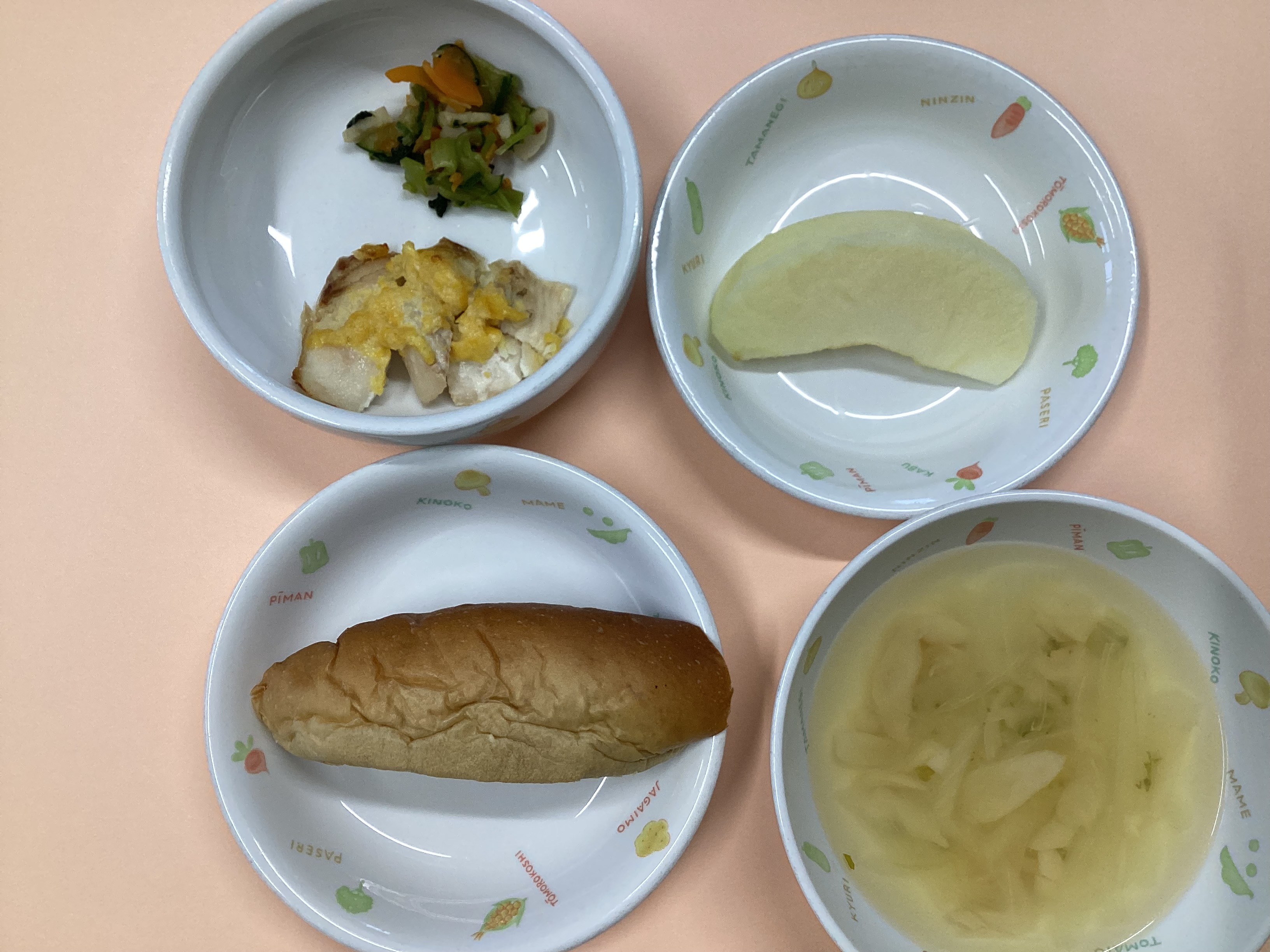 令和7年6月24日のお給食♪ 2025年 6月 27日 Fri 管理者 ・丸パン ・鰯のアングレース(未満児は白身魚のアングレース) ・ブロッコリーのマヨ和え ・野菜スープ ・パイナップル(未満児はりんご) (幼児) (未満児)