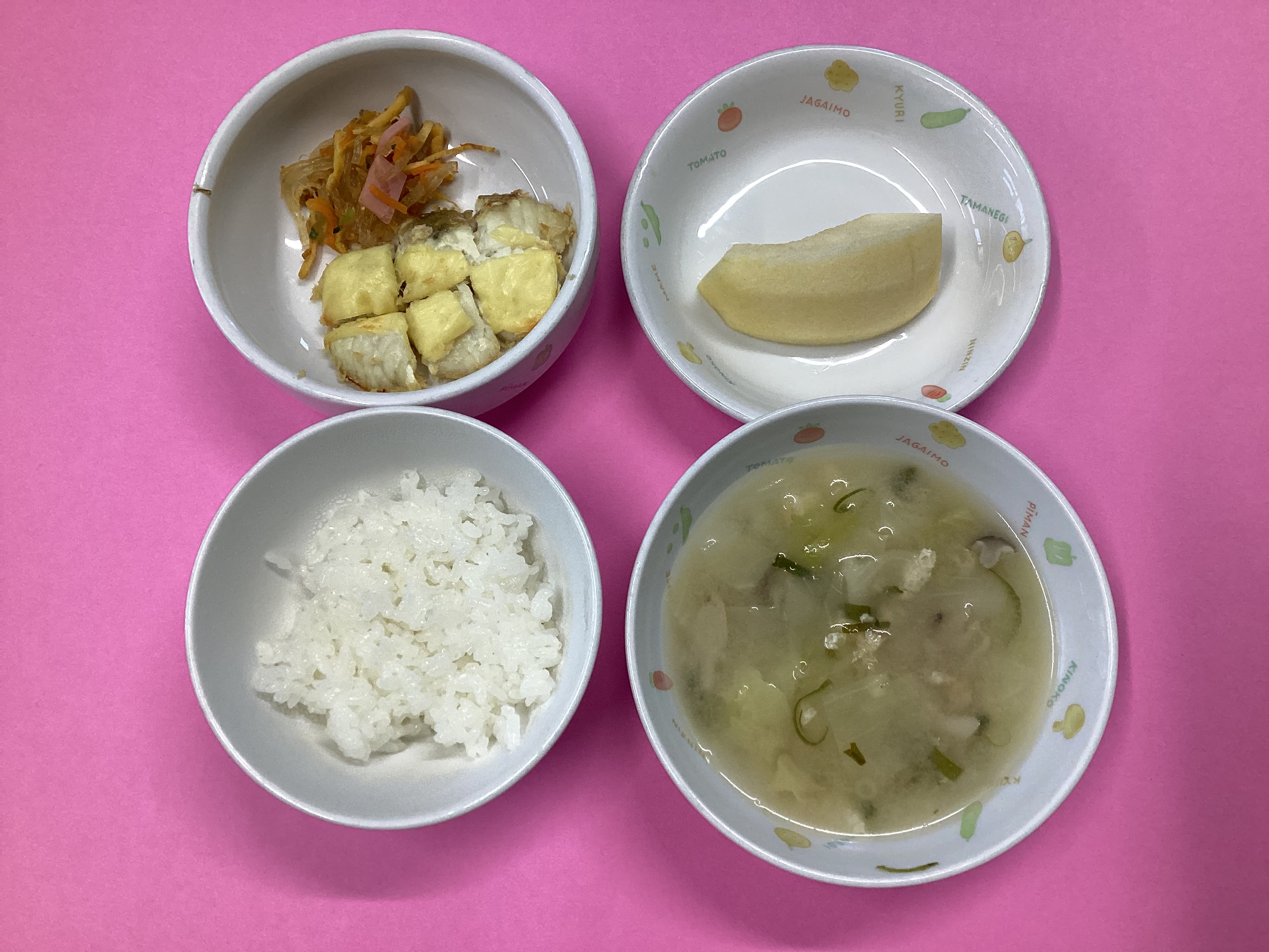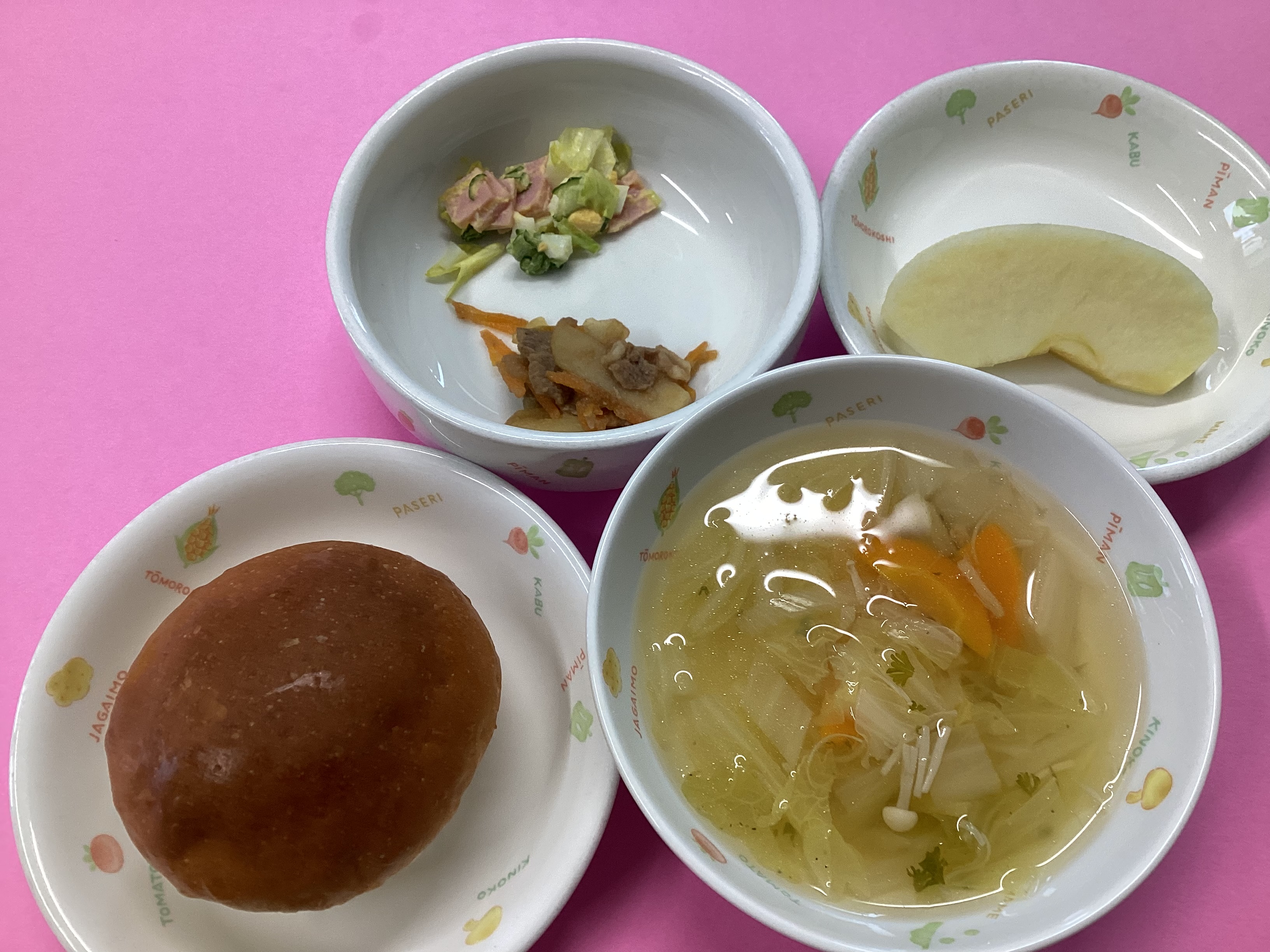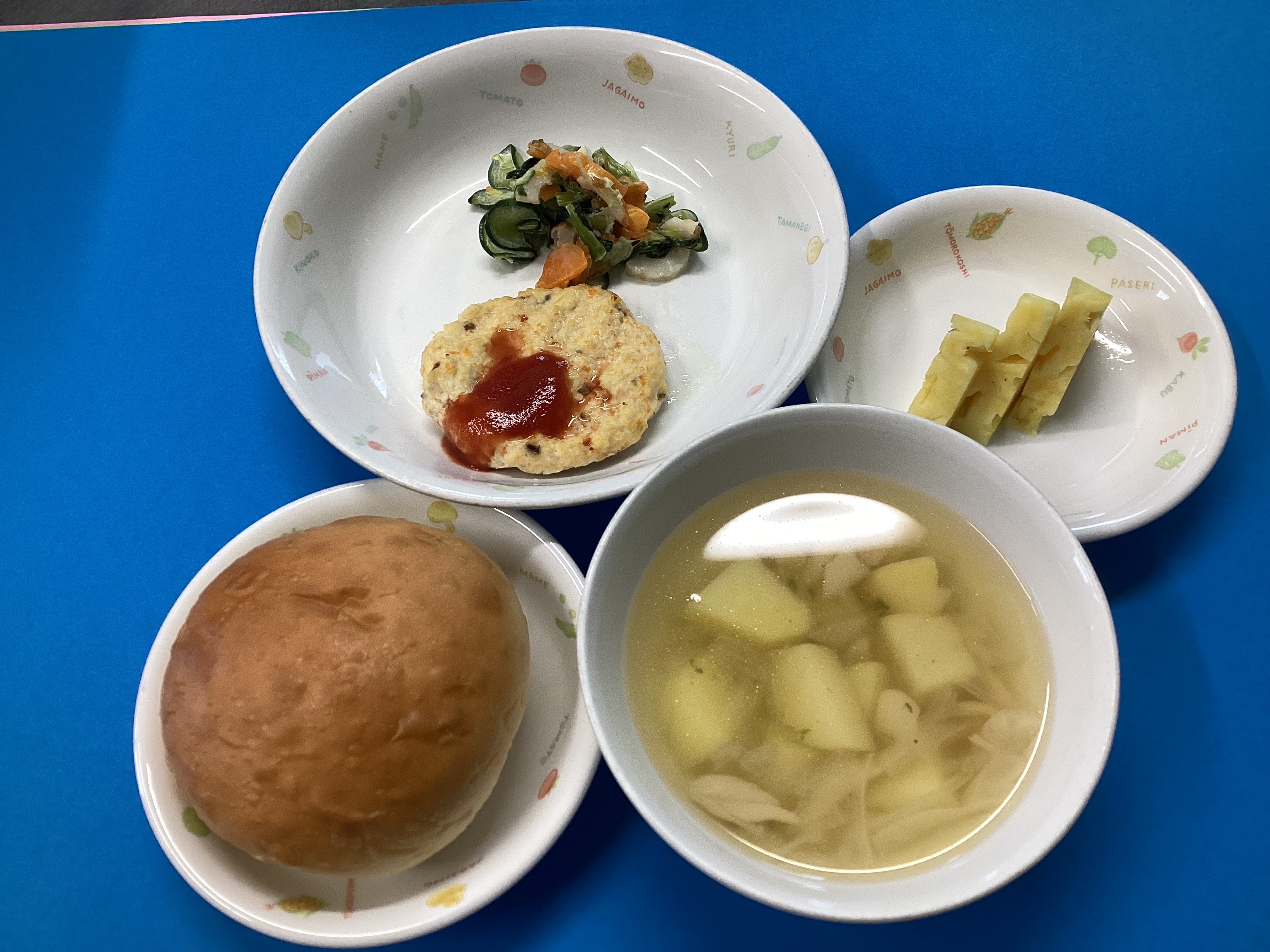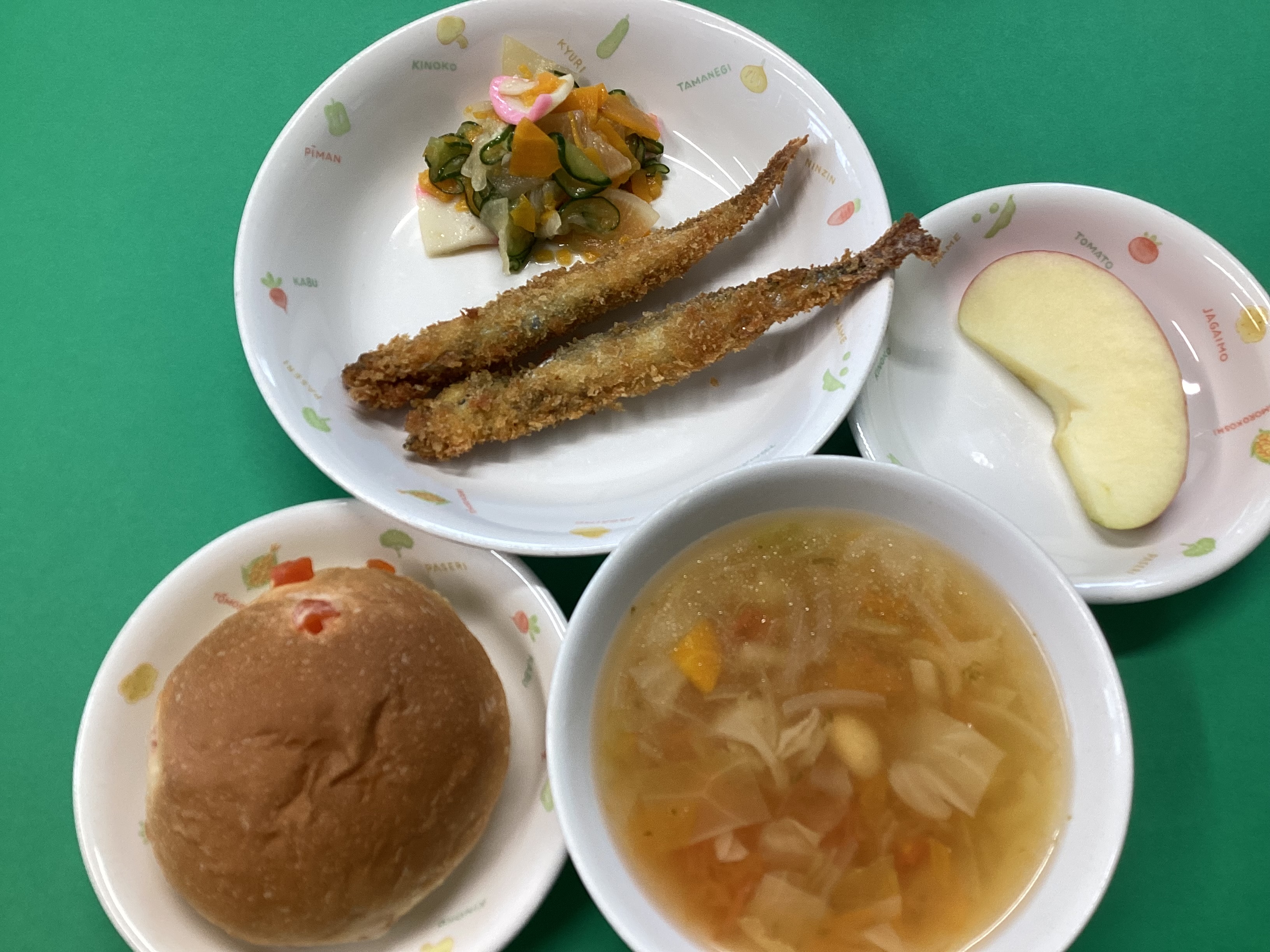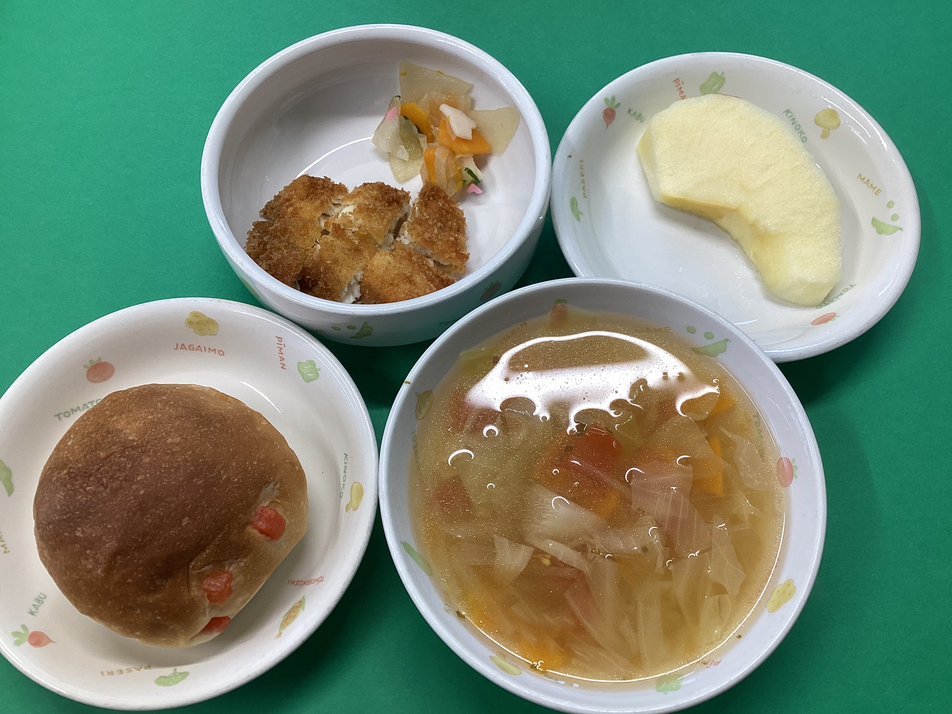 令和7年12月2日のお給食♪ 2025年 12月 5日 Fri 管理者 ・リッチツイスト ・ししゃもフライ(未満児は白身魚フライ) ・チーズサラダ ・和風ポトフ ・キウイフルーツ(未満児はりんご) (幼児) (未満児)