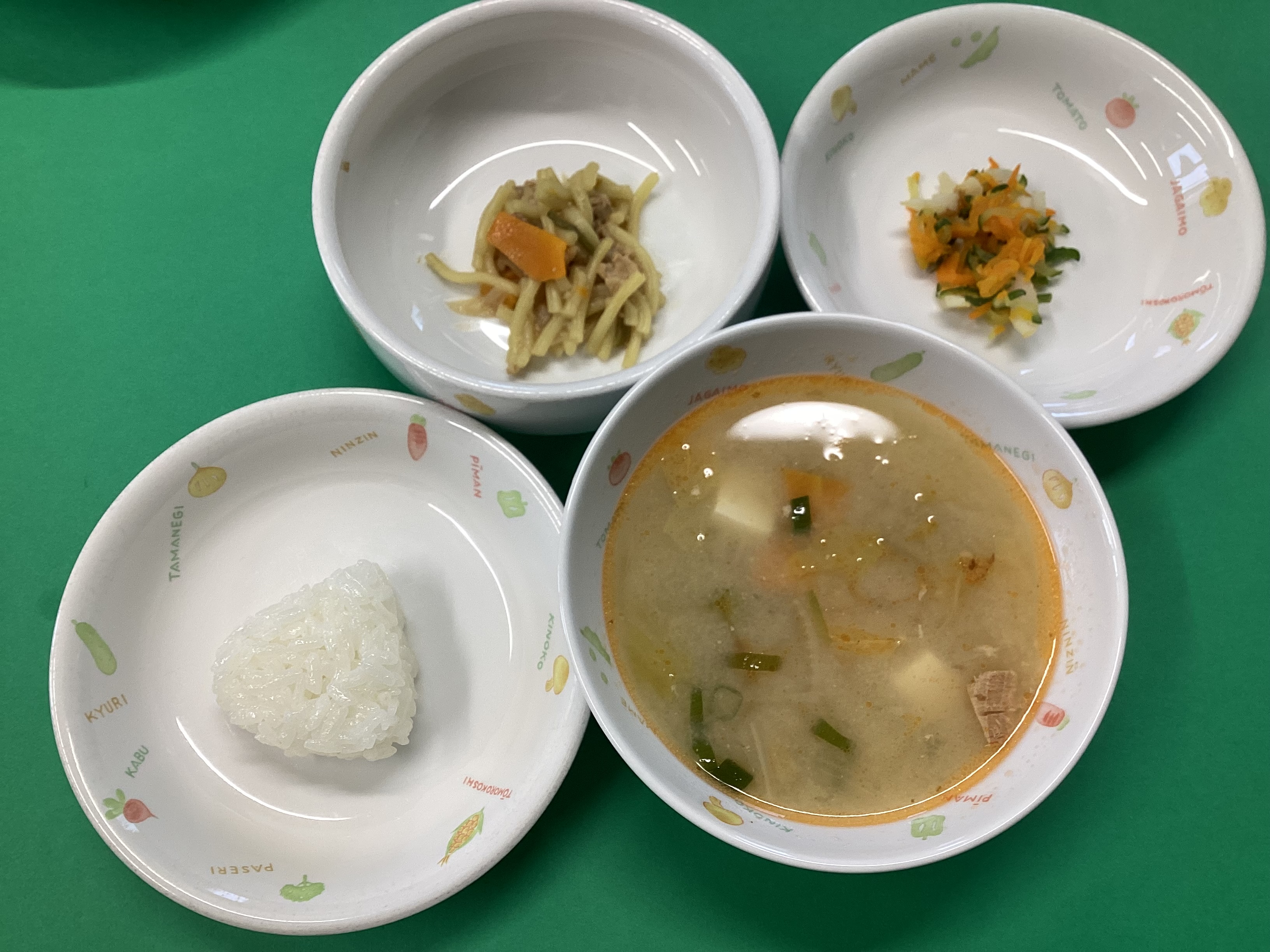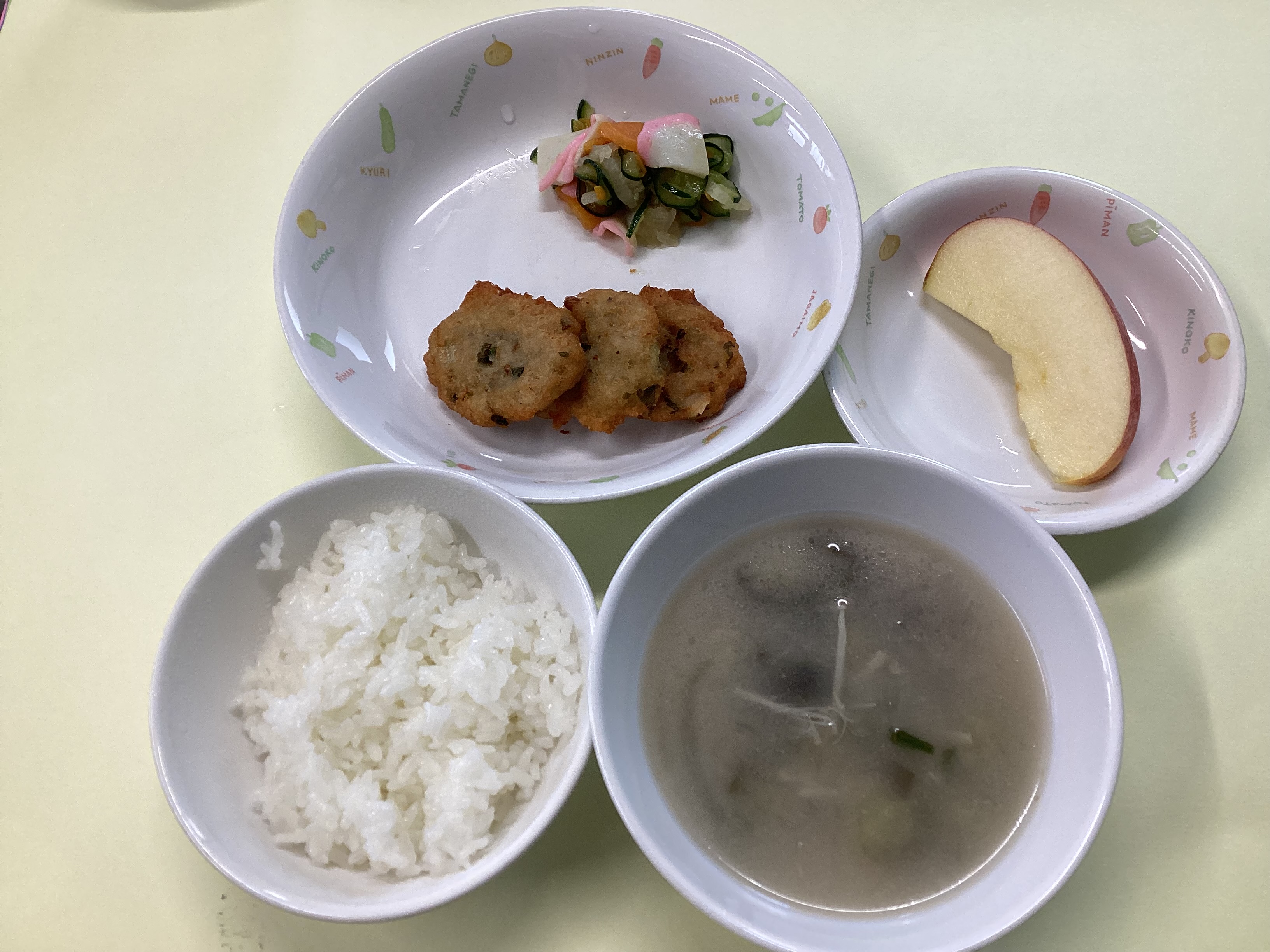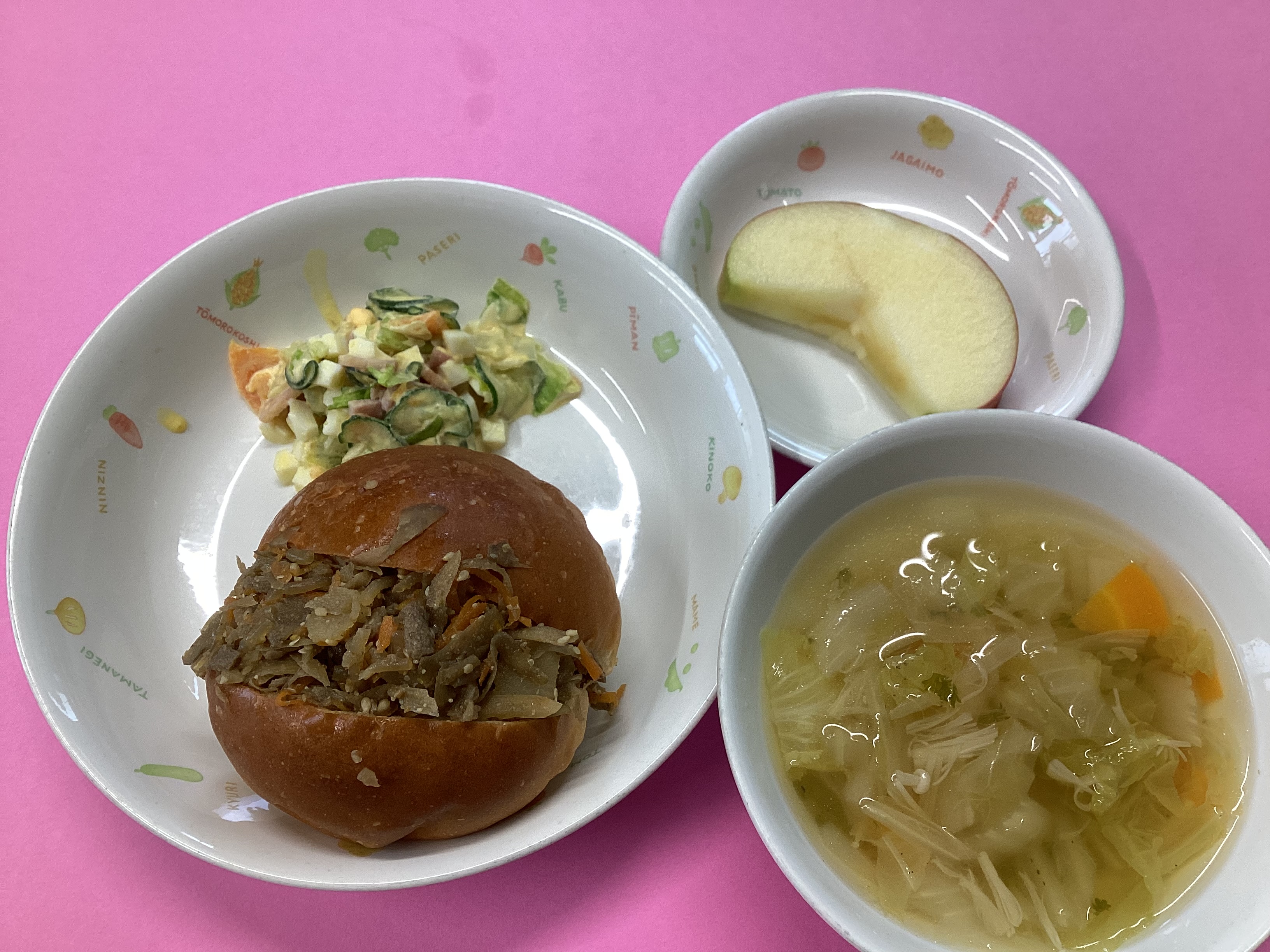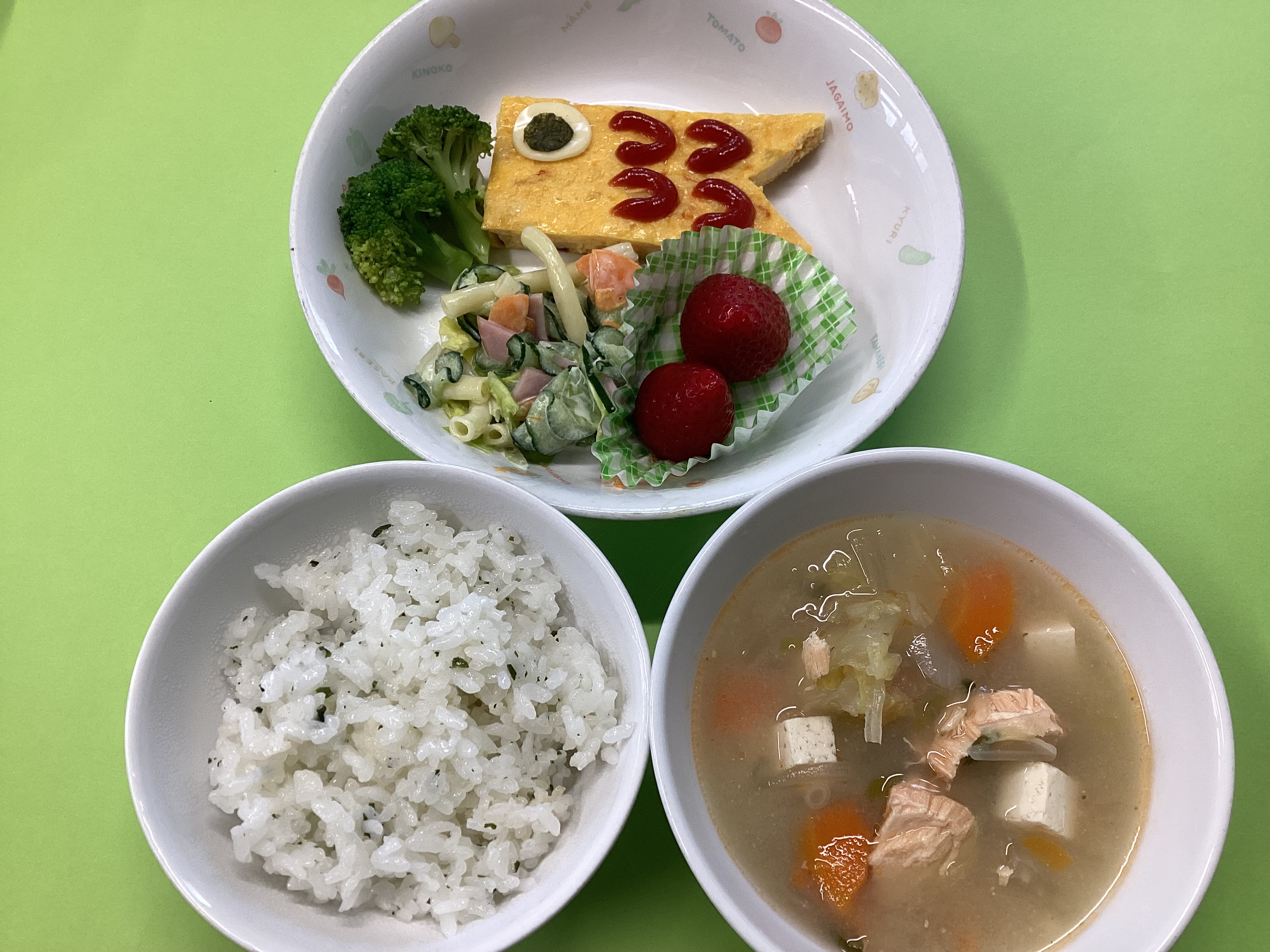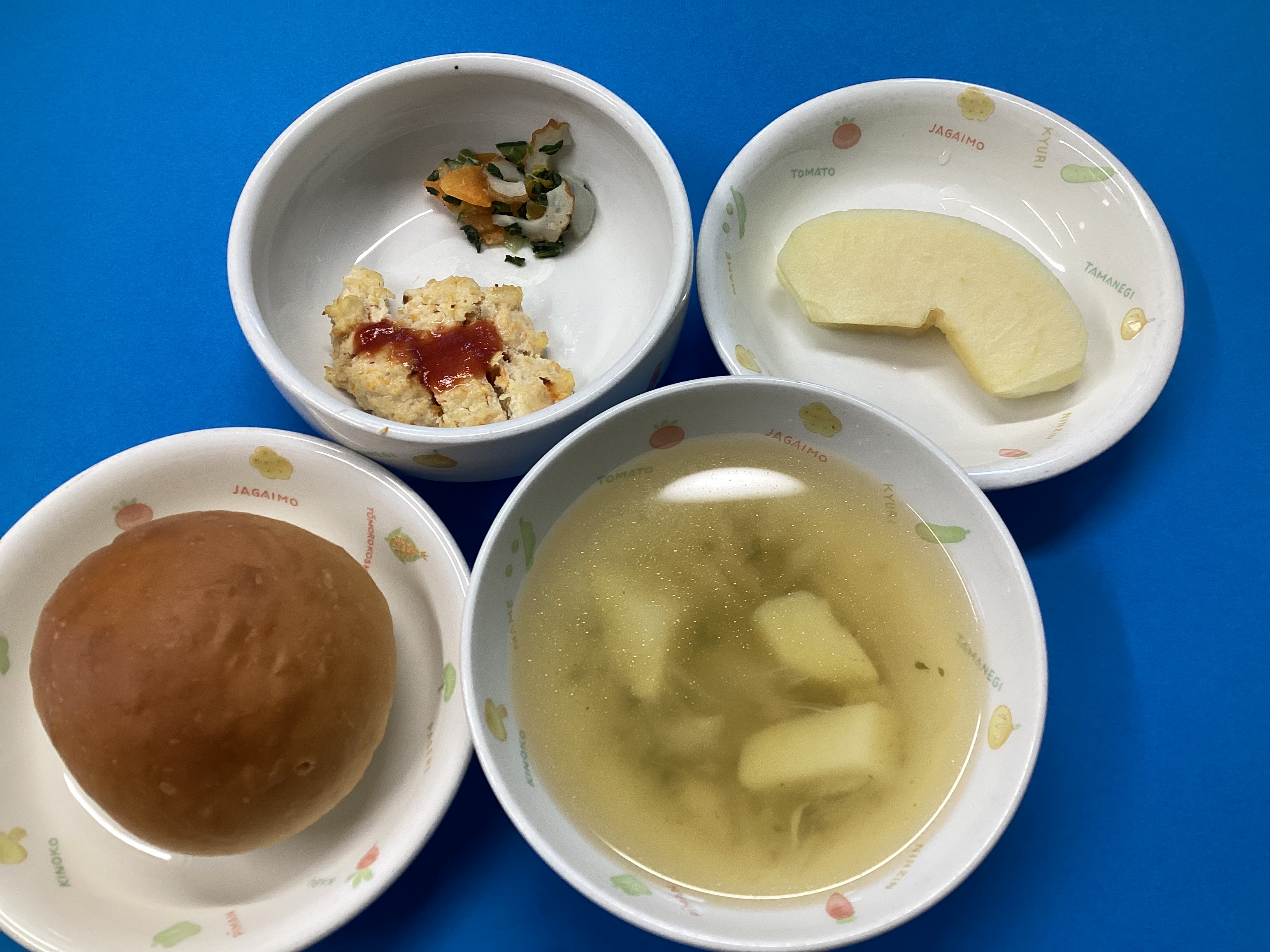 令和7年12月2日のお給食♪ 2025年 12月 5日 Fri 管理者 ・リッチツイスト ・ししゃもフライ(未満児は白身魚フライ) ・チーズサラダ ・和風ポトフ ・キウイフルーツ(未満児はりんご) (幼児) (未満児)