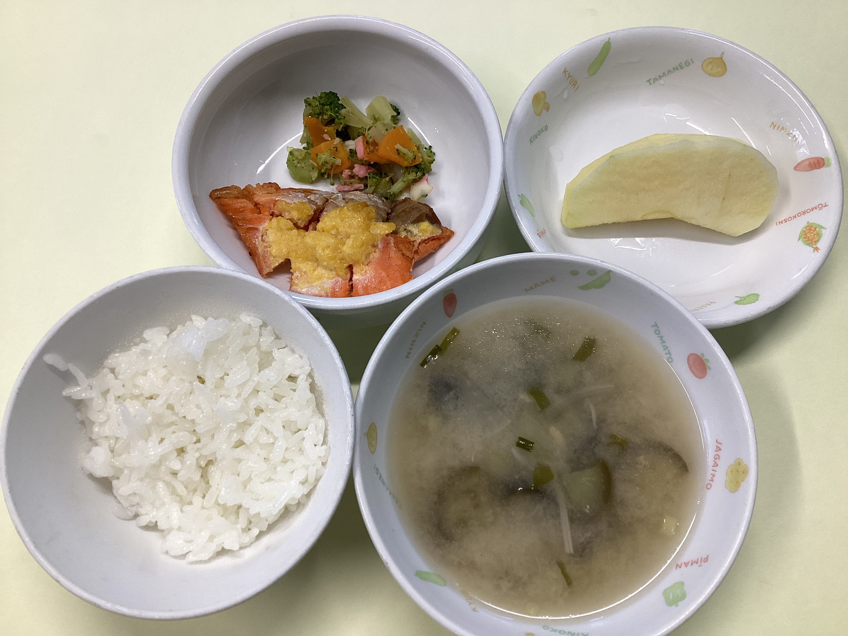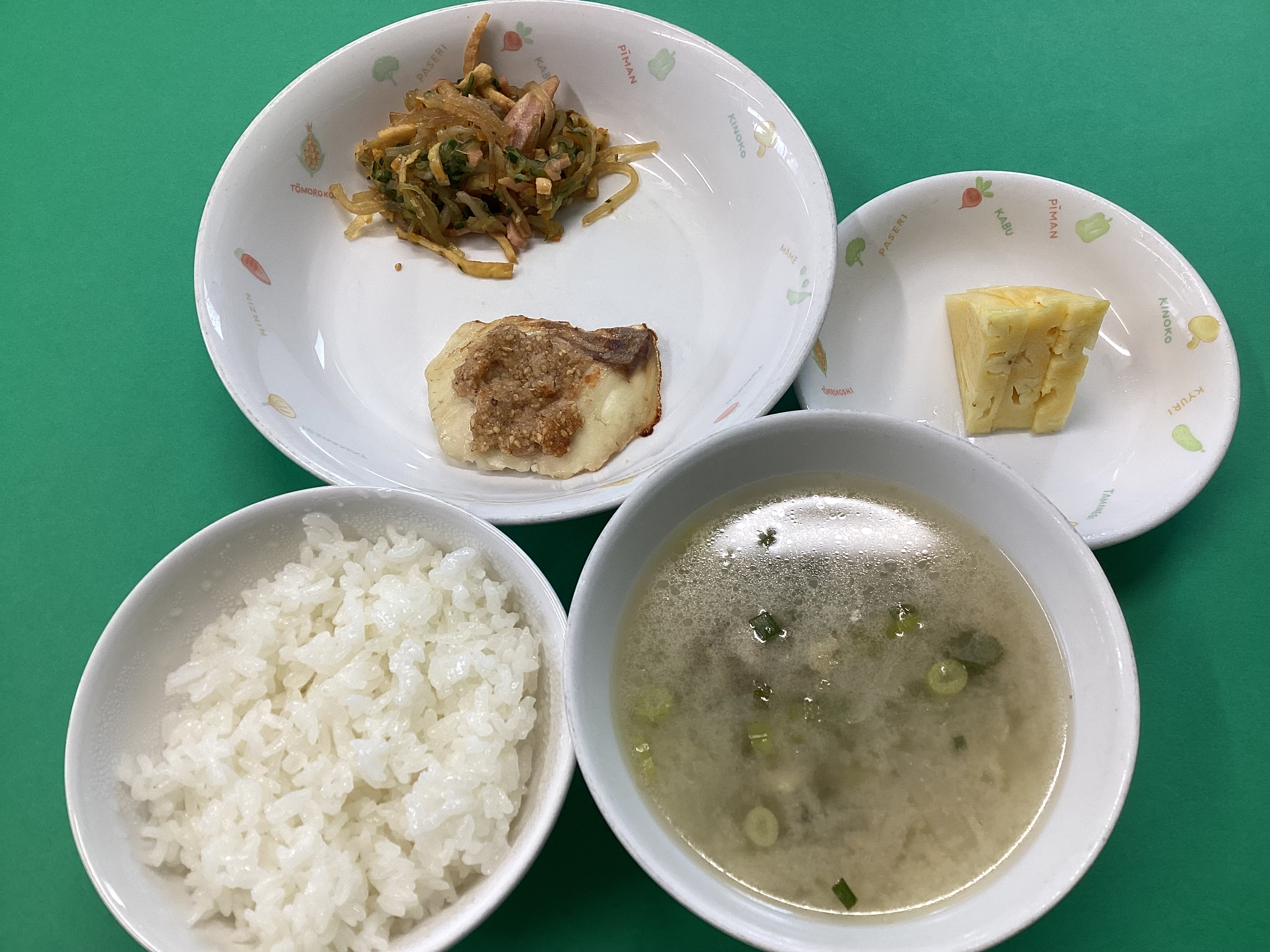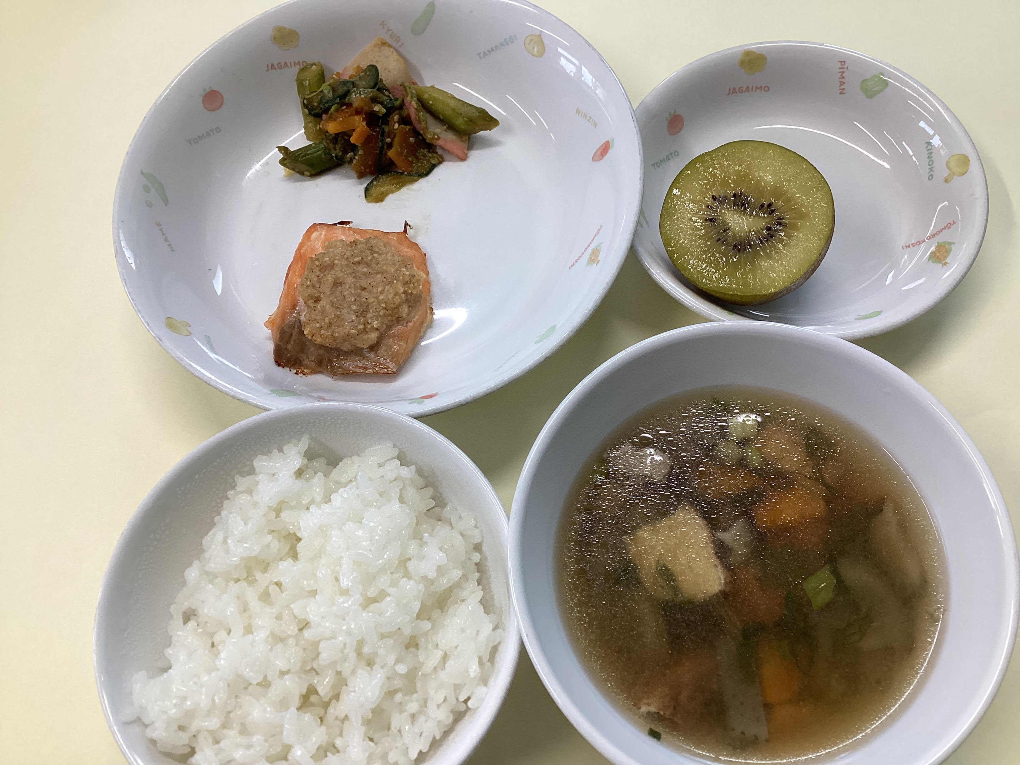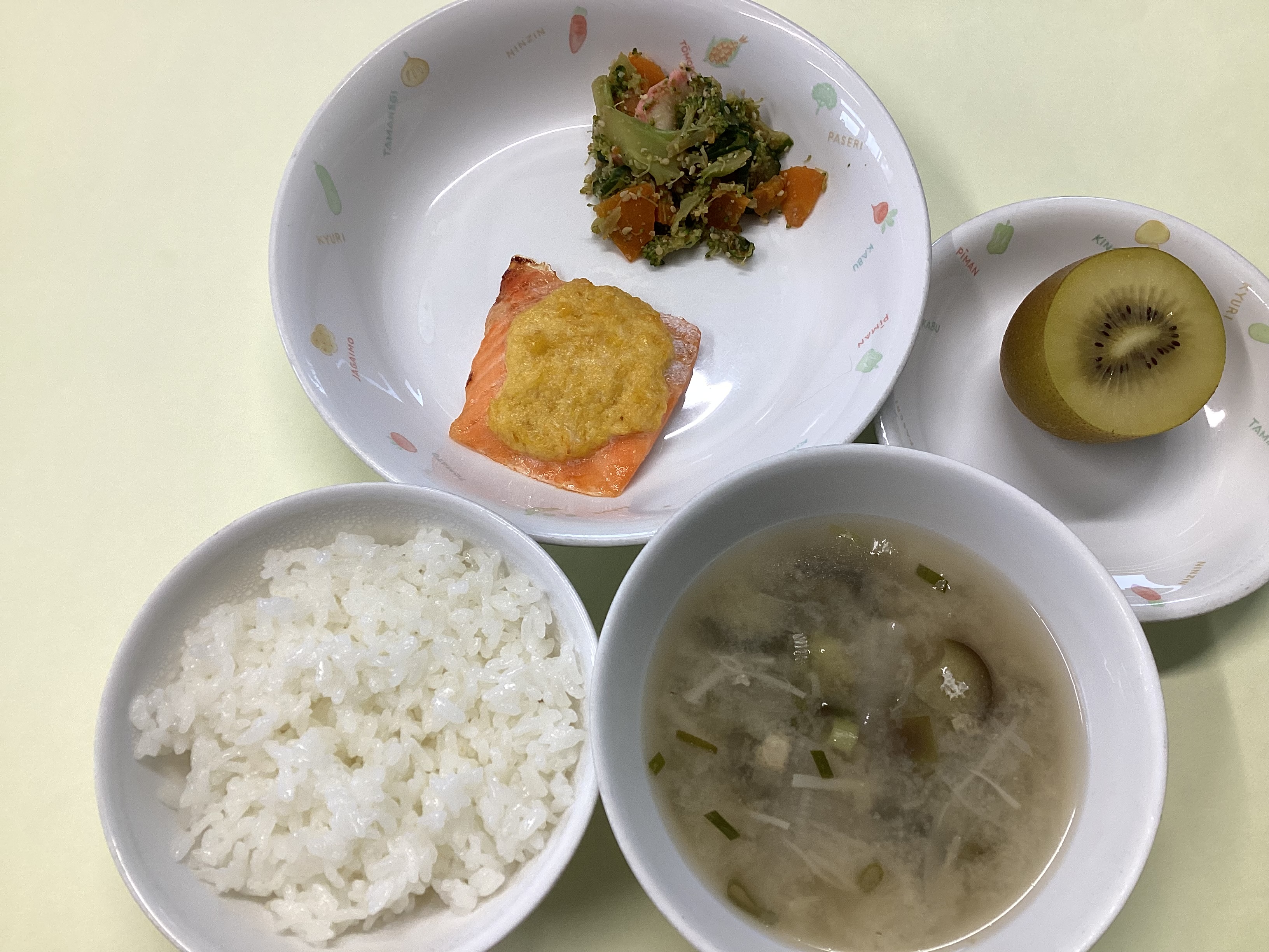 令和7年11月28日のお給食♪ 2025年 11月 29日 Sat 管理者 ・炊き込みご飯 ・鰆の西京焼き(未満児は白身魚の西京焼き) ・ブロッコリーのフレンチ和え ・わかめスープ ・キウイフルーツ(未満児はりんご) (幼児) (未満児)