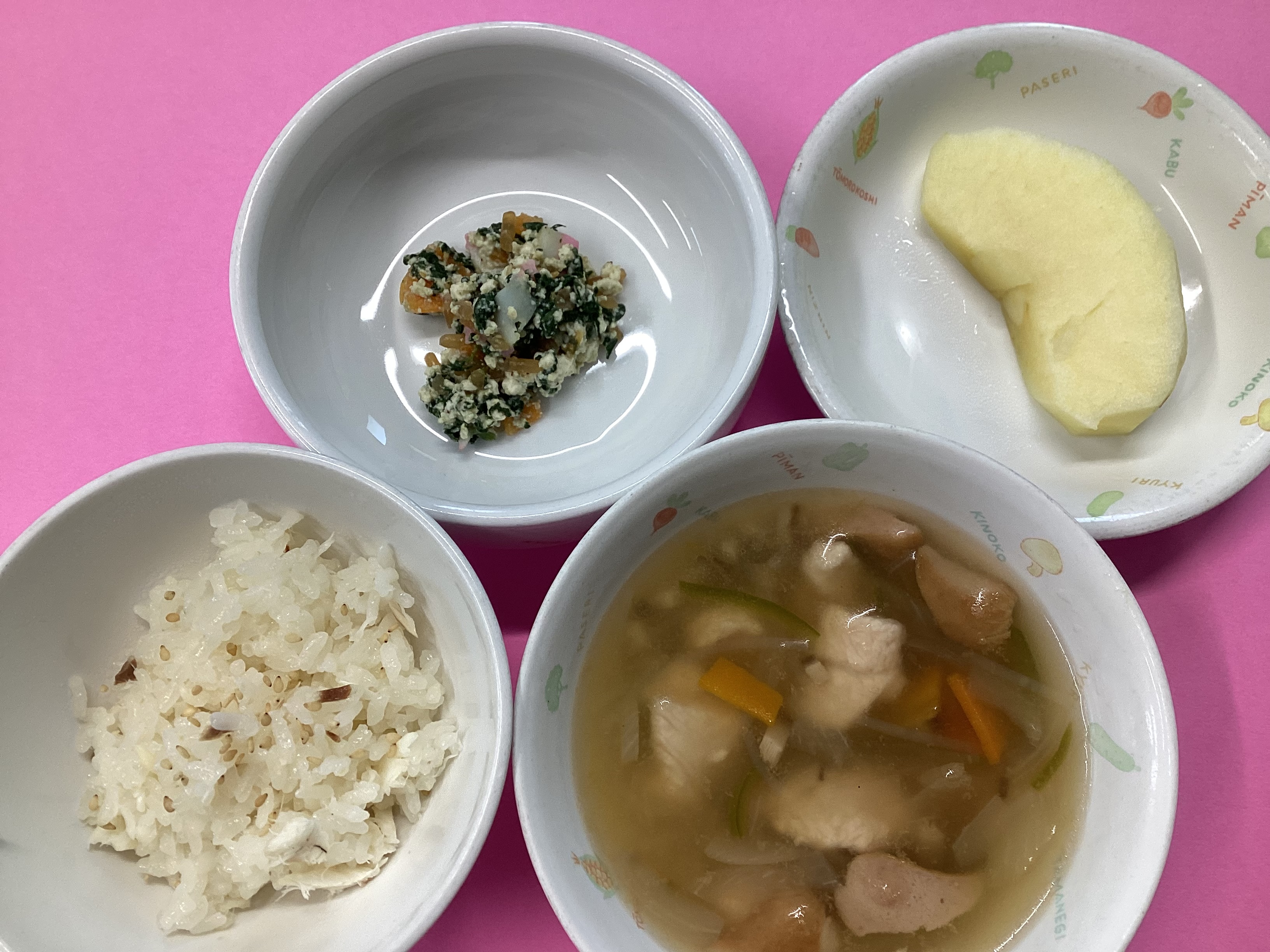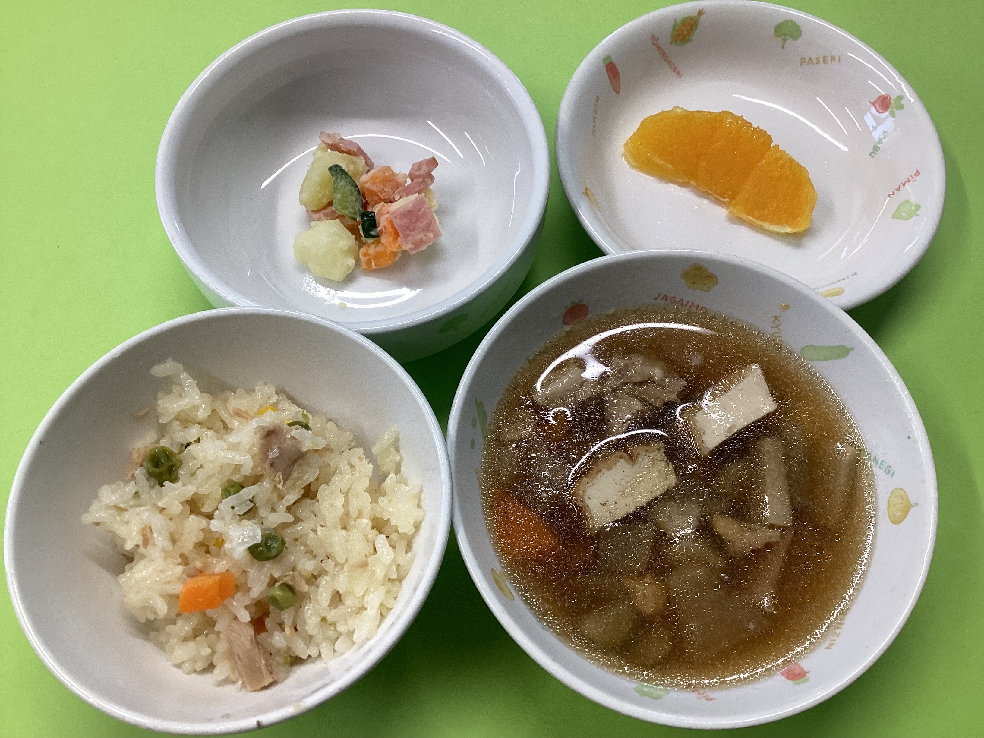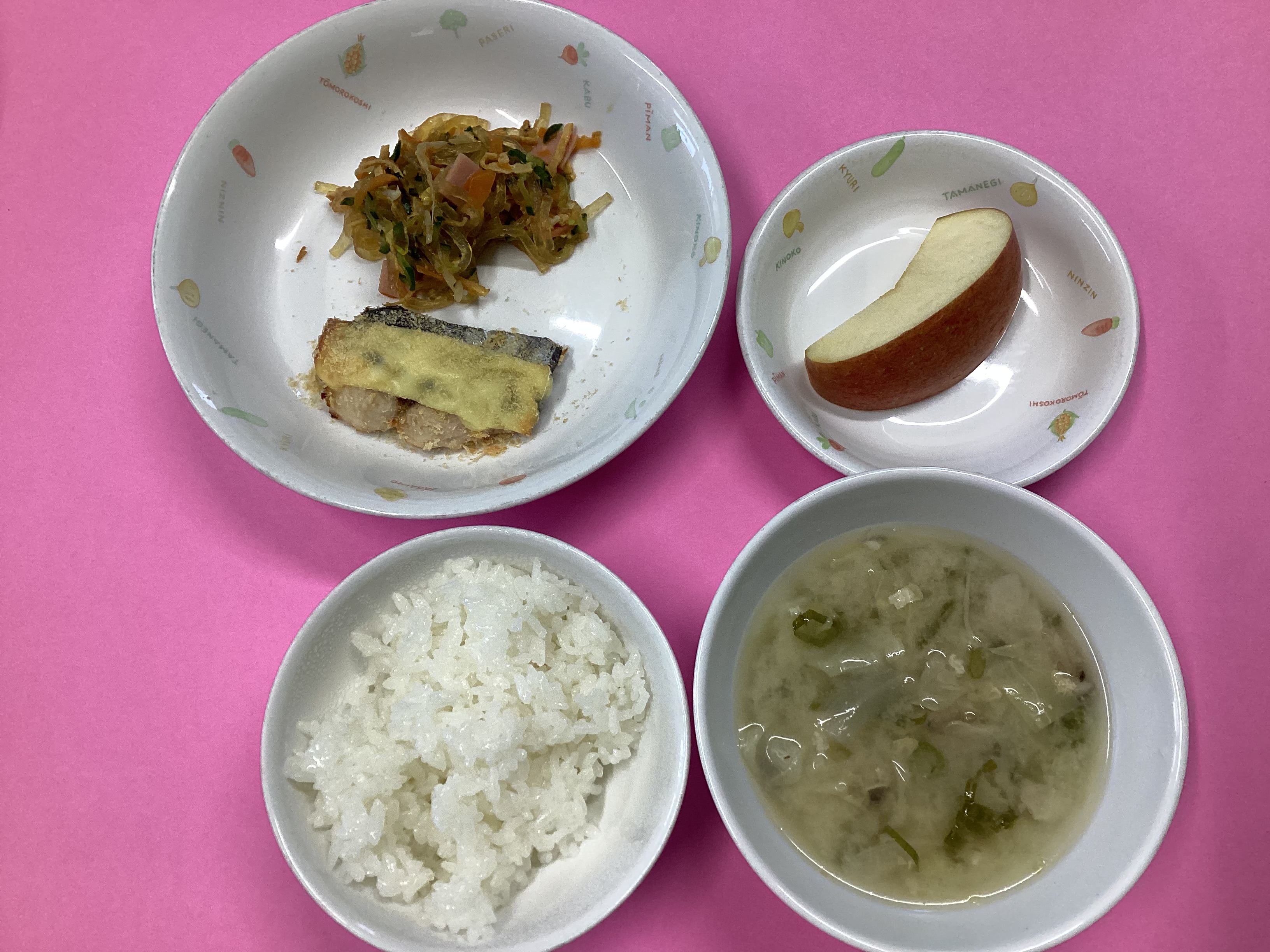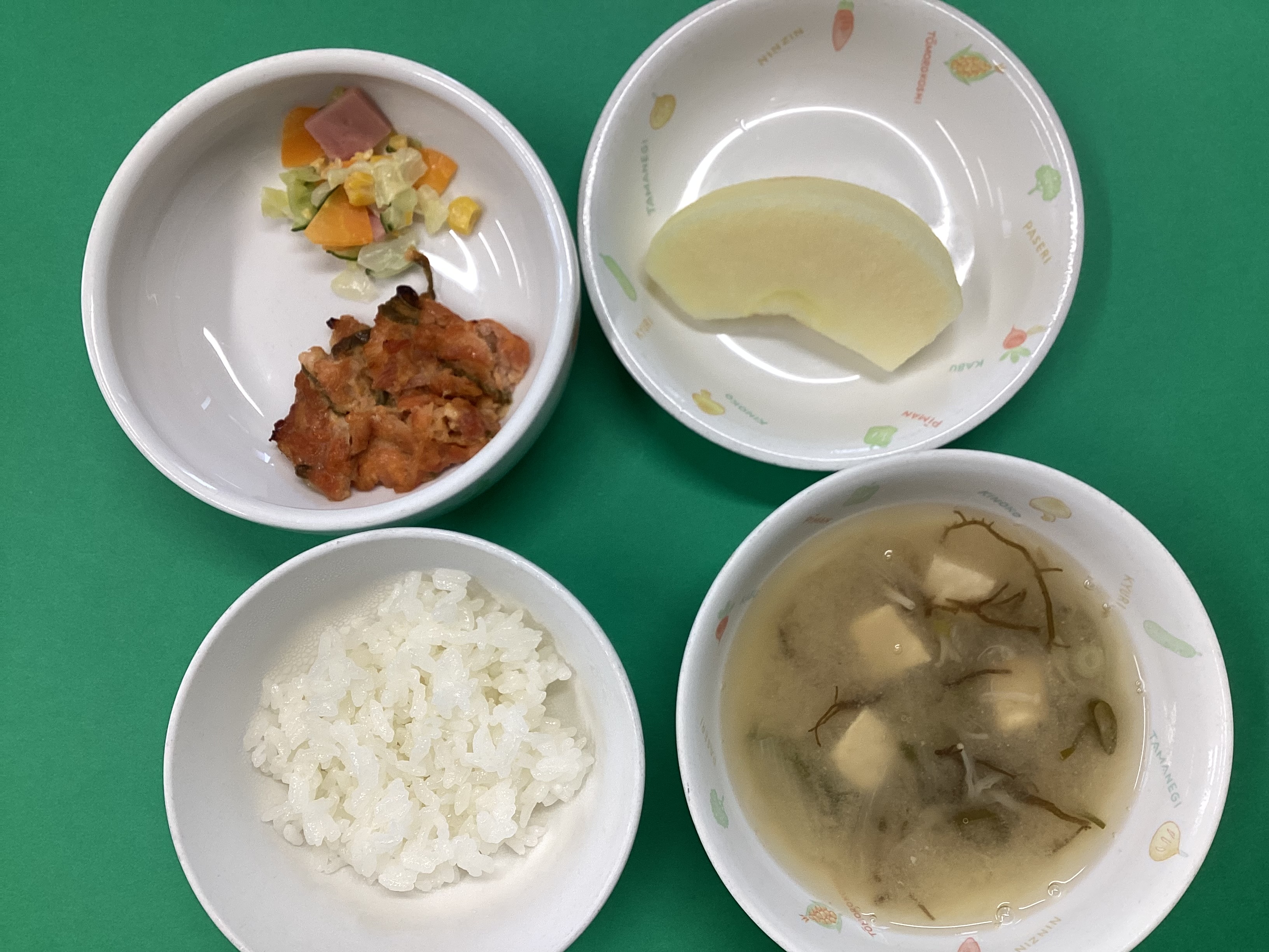 令和7年11月28日のお給食♪ 2025年 11月 29日 Sat 管理者 ・炊き込みご飯 ・鰆の西京焼き(未満児は白身魚の西京焼き) ・ブロッコリーのフレンチ和え ・わかめスープ ・キウイフルーツ(未満児はりんご) (幼児) (未満児)