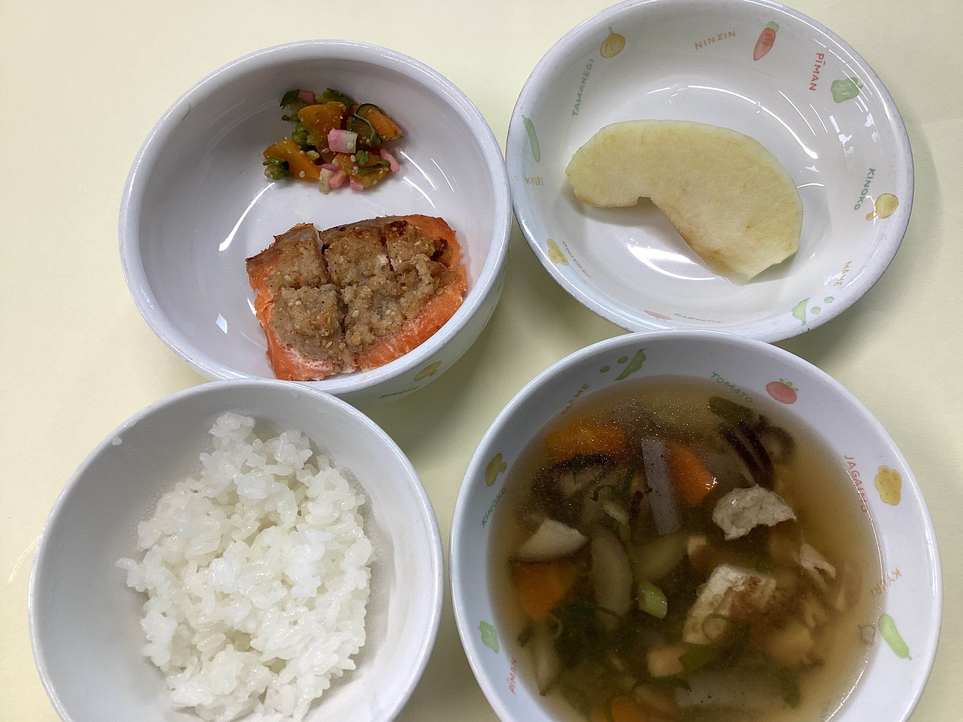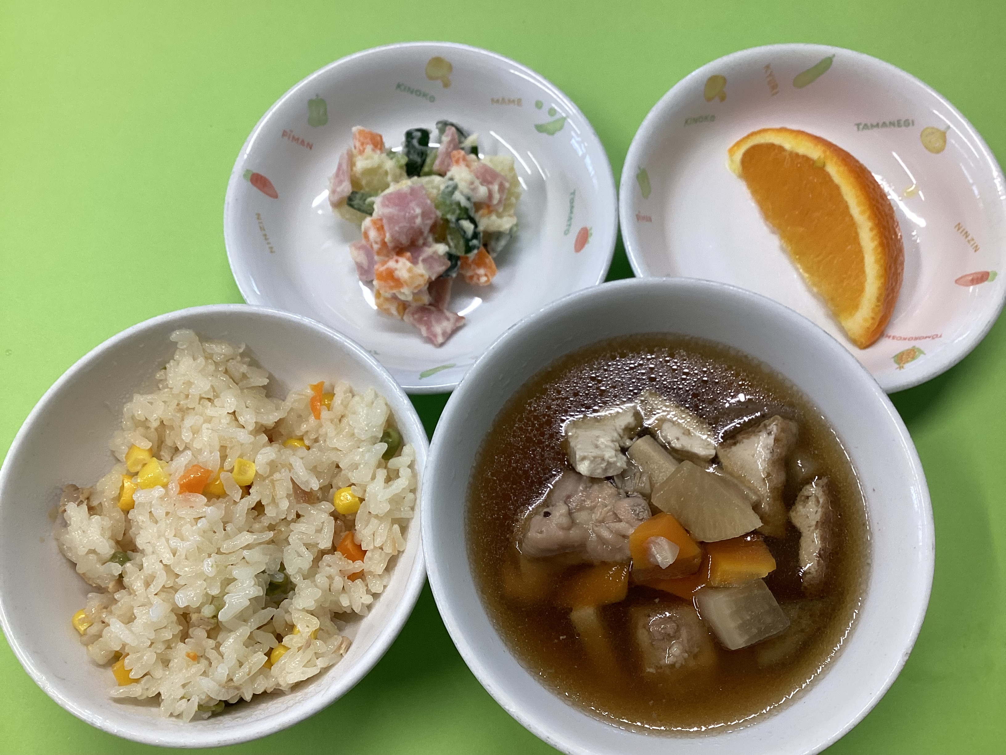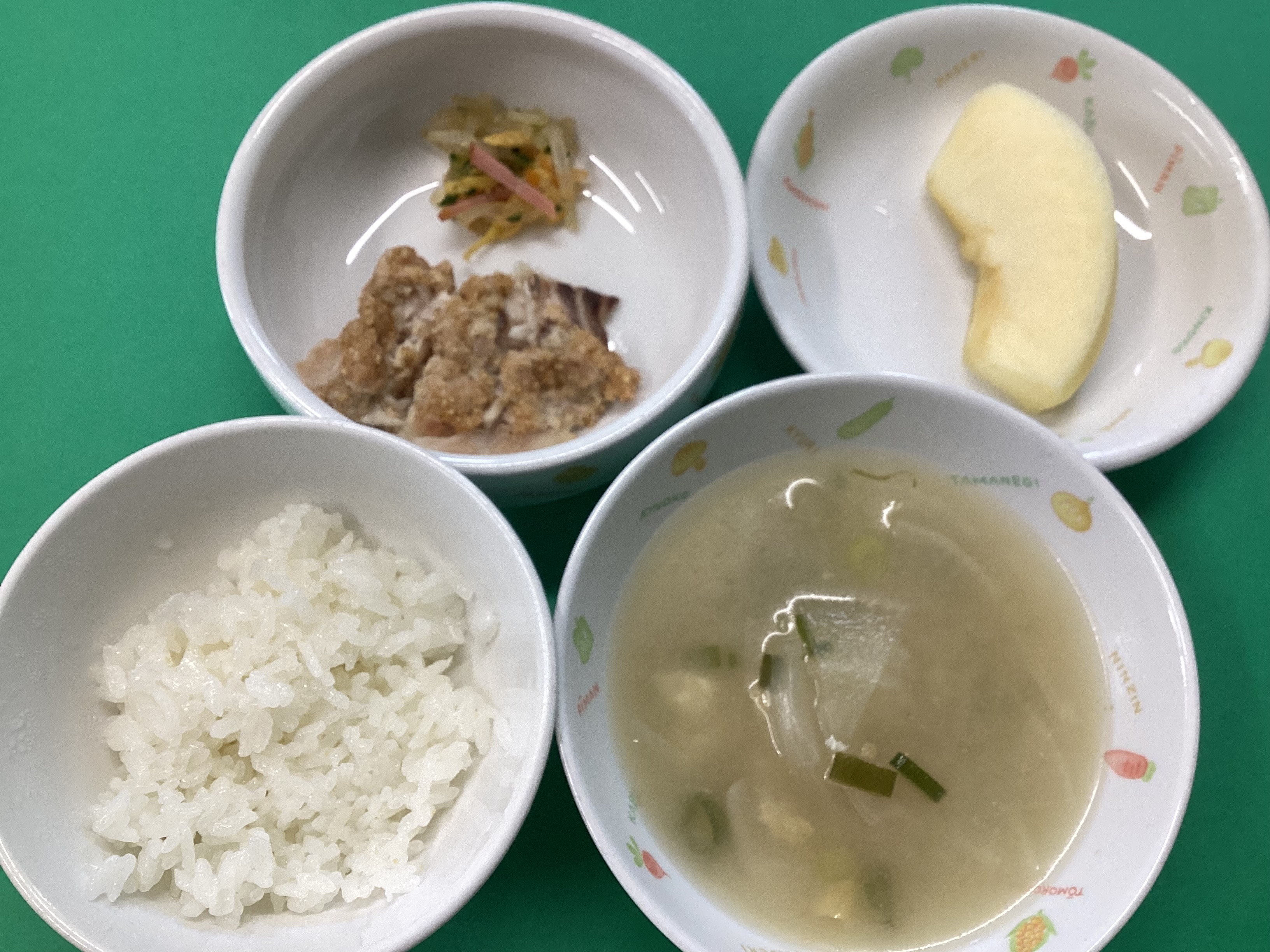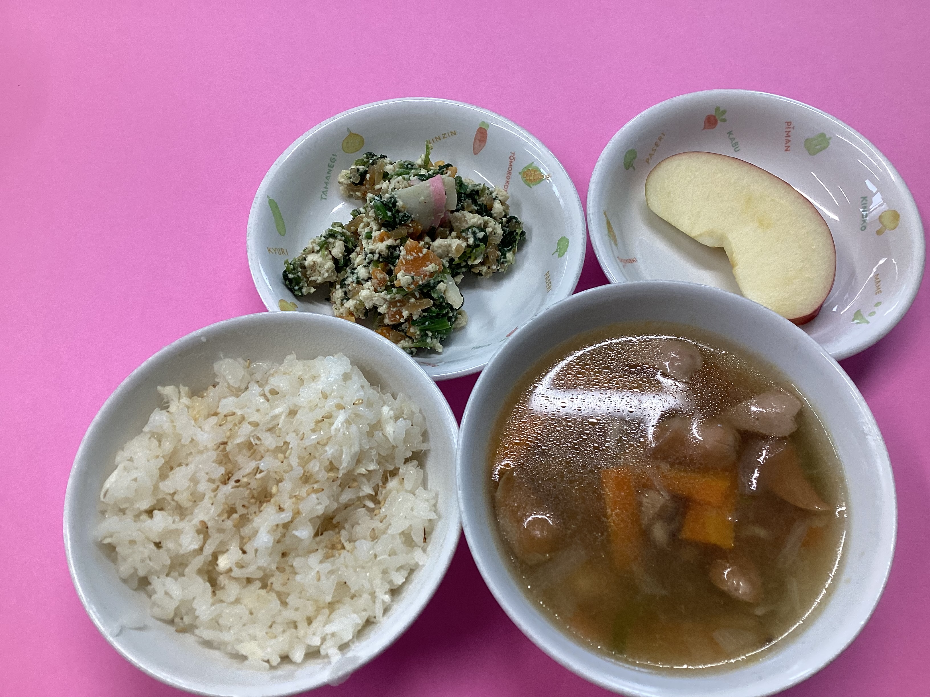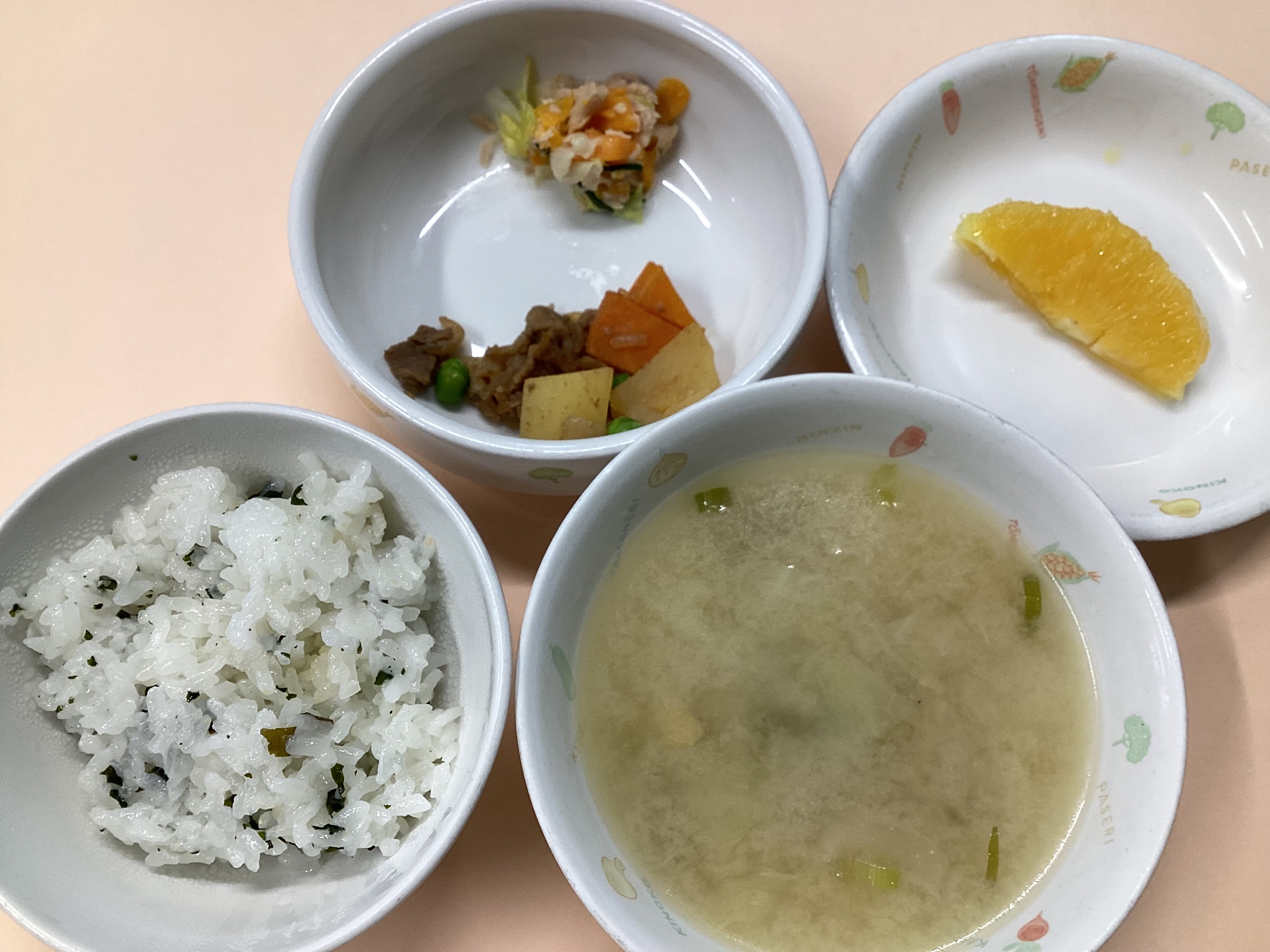 令和7年11月28日のお給食♪ 2025年 11月 29日 Sat 管理者 ・炊き込みご飯 ・鰆の西京焼き(未満児は白身魚の西京焼き) ・ブロッコリーのフレンチ和え ・わかめスープ ・キウイフルーツ(未満児はりんご) (幼児) (未満児)
