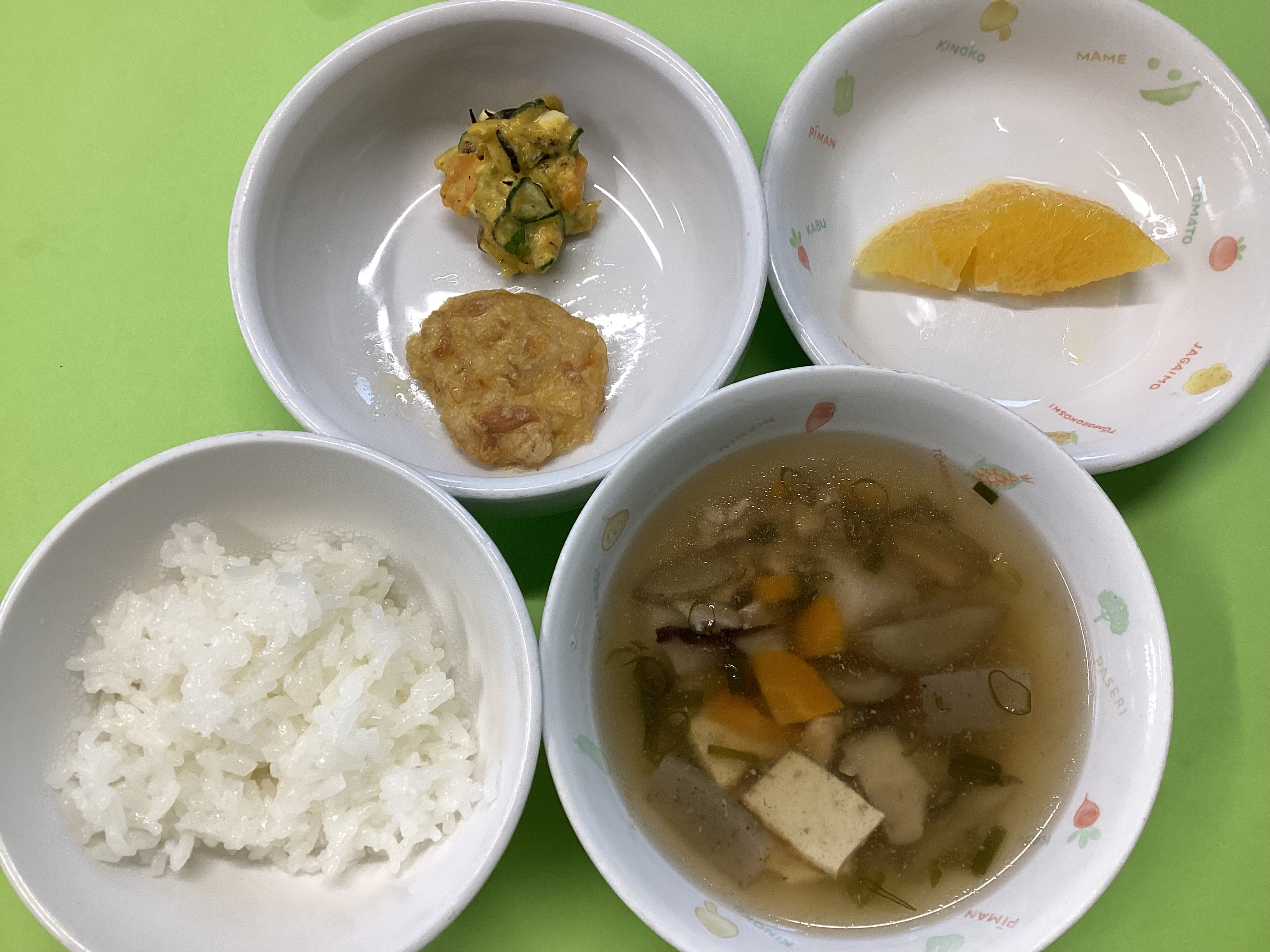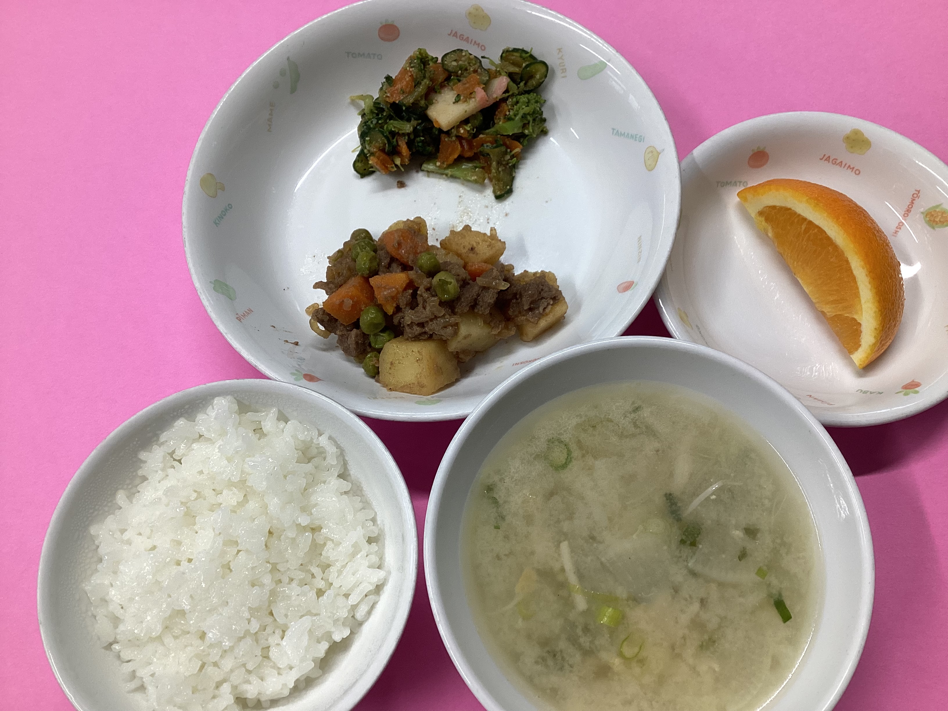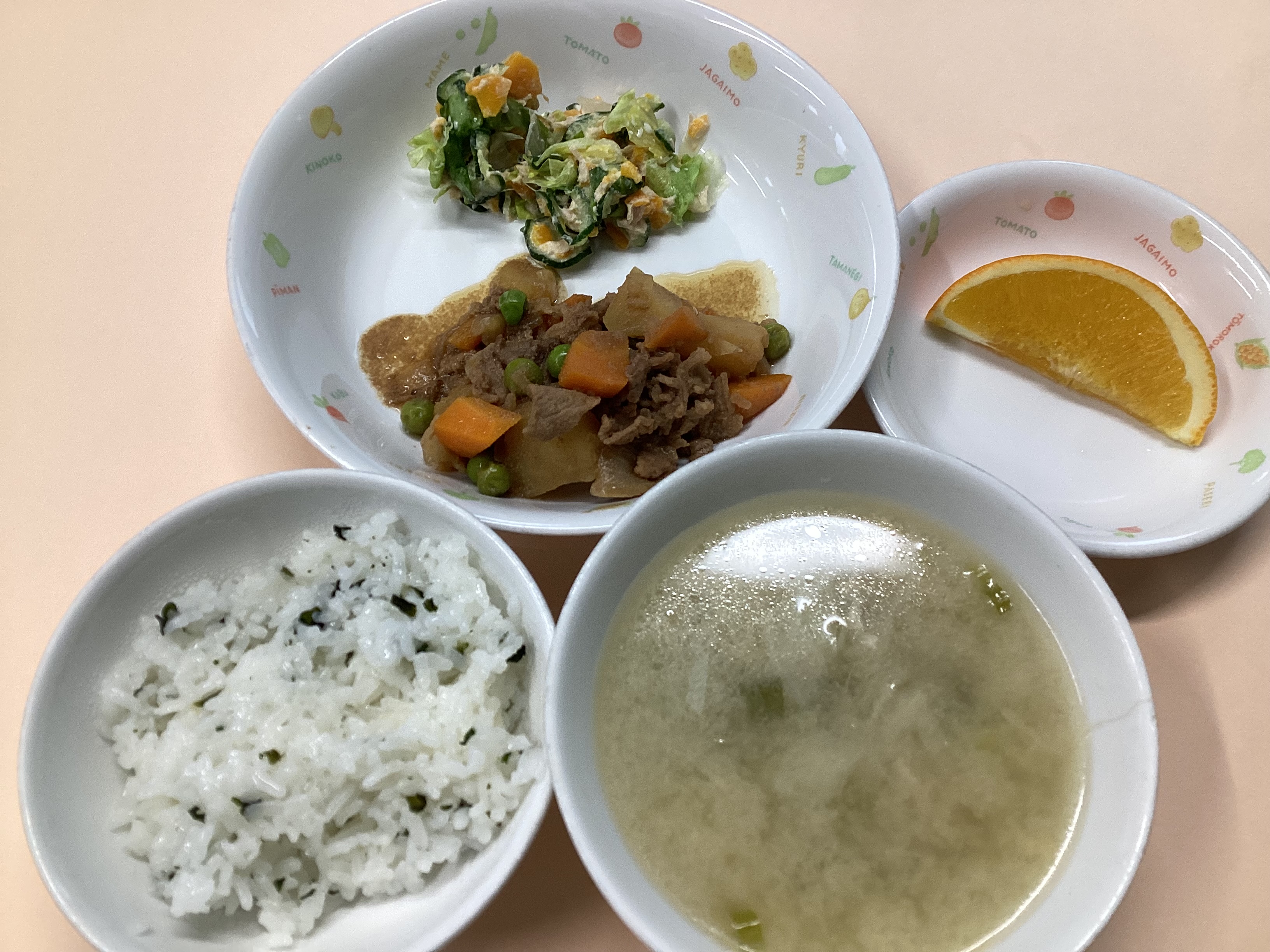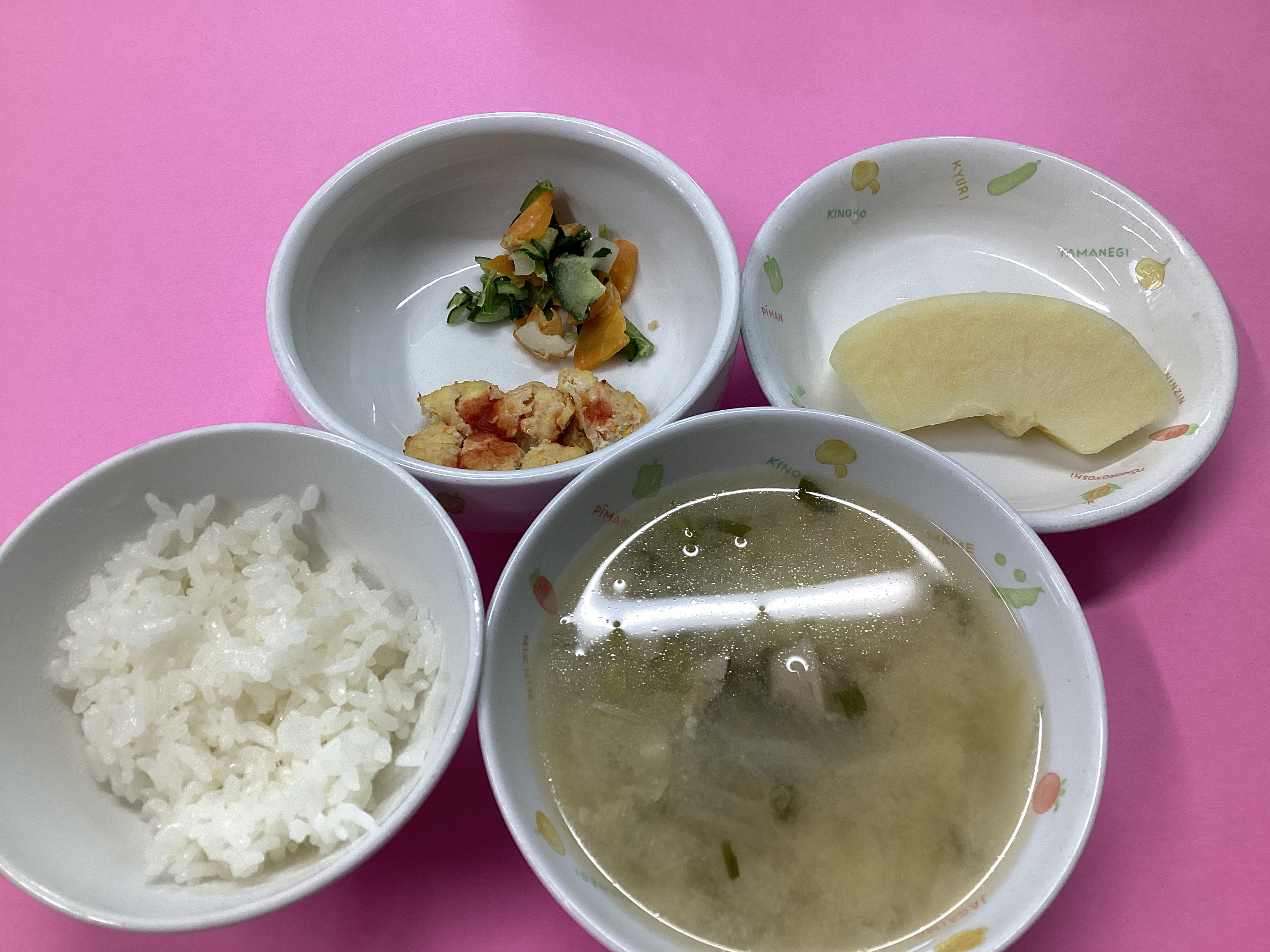 令和7年11月28日のお給食♪ 2025年 11月 29日 Sat 管理者 ・炊き込みご飯 ・鰆の西京焼き(未満児は白身魚の西京焼き) ・ブロッコリーのフレンチ和え ・わかめスープ ・キウイフルーツ(未満児はりんご) (幼児) (未満児)