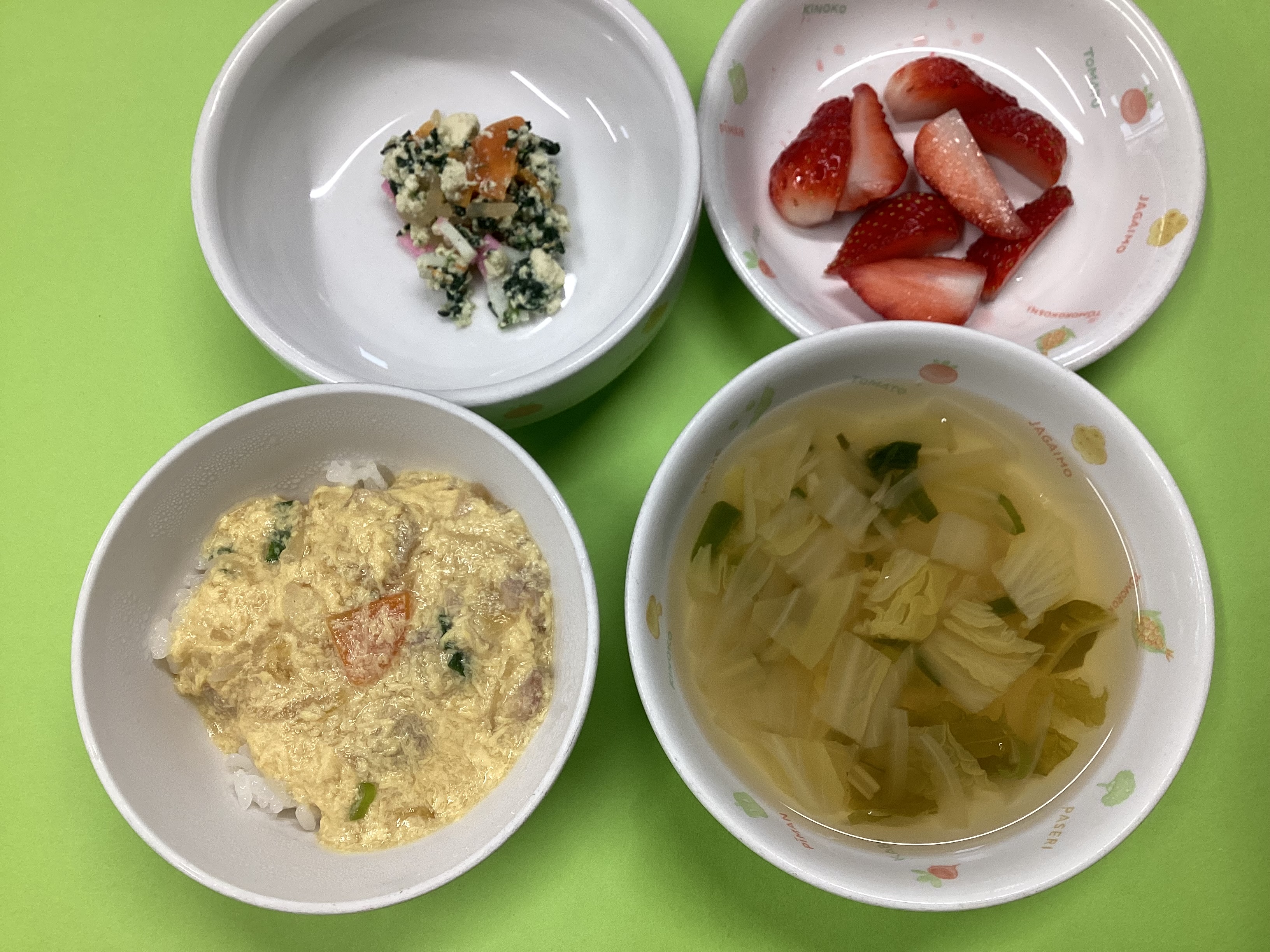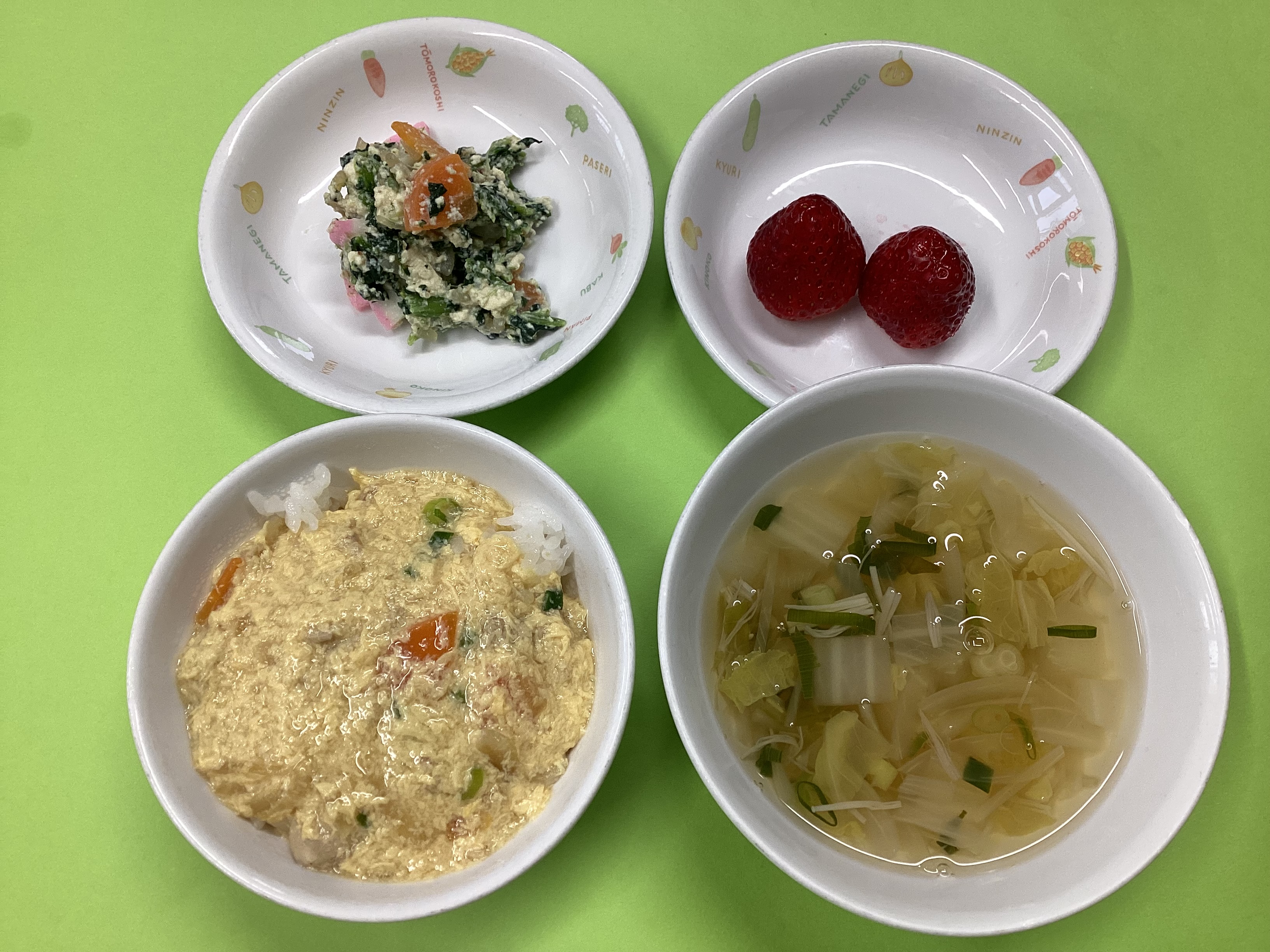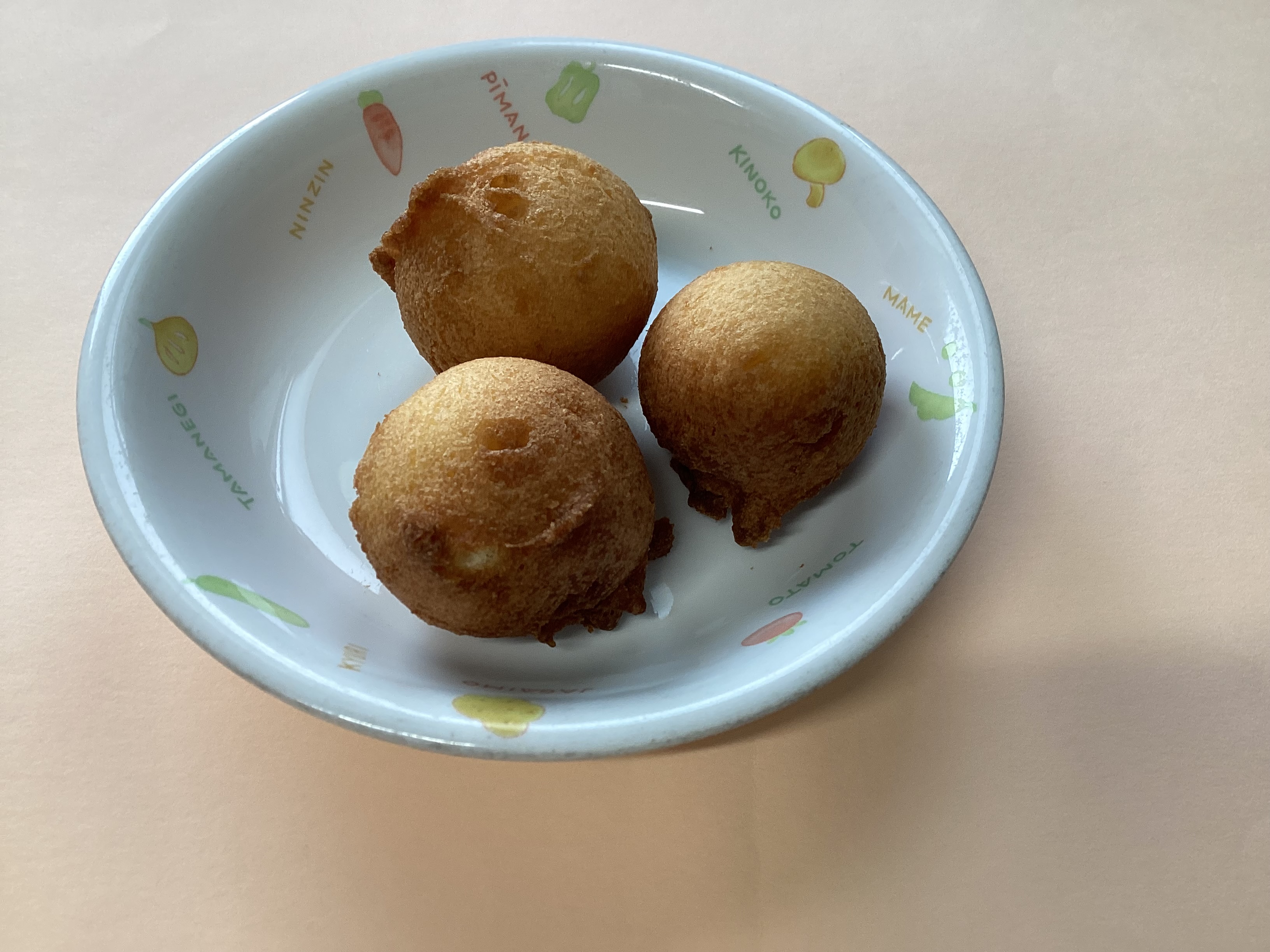 令和8年4月2日のお給食♪ 2026年 4月 3日 Fri 管理者 ~昼食~ ・親子丼 ・白和え ・すまし汁 ・いちご (幼児) (未満児) ~おやつ~ ・ソーセージボール ・スキムミルク たまご組さんは魚肉ソーセージが、ひよこぐみさん、幼児組さんはあらびきウインナーが中に入っています。 ホットケーキミックスを絡めて油で揚げております♡